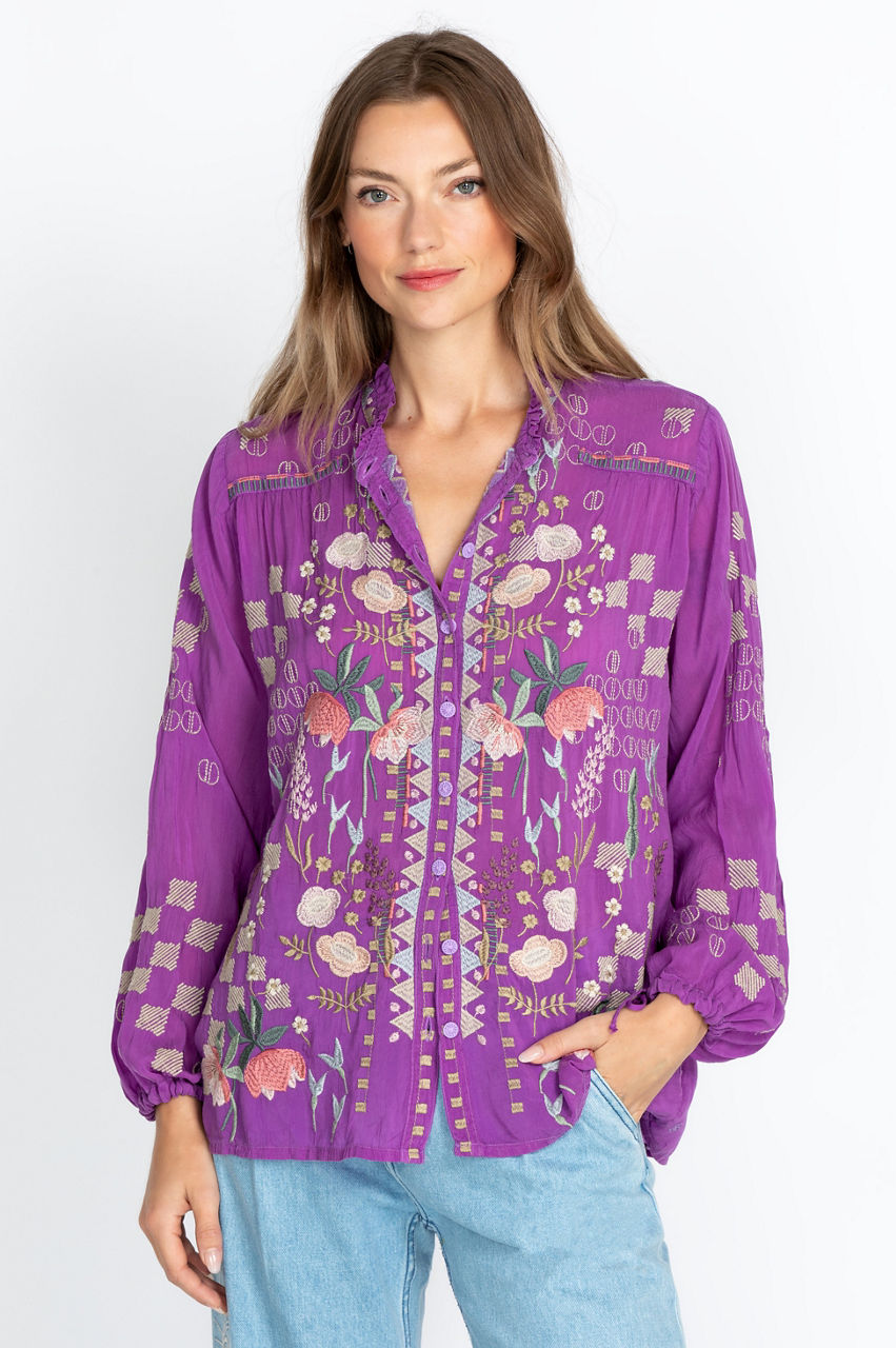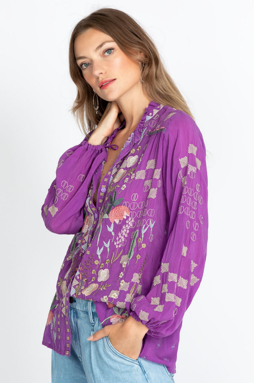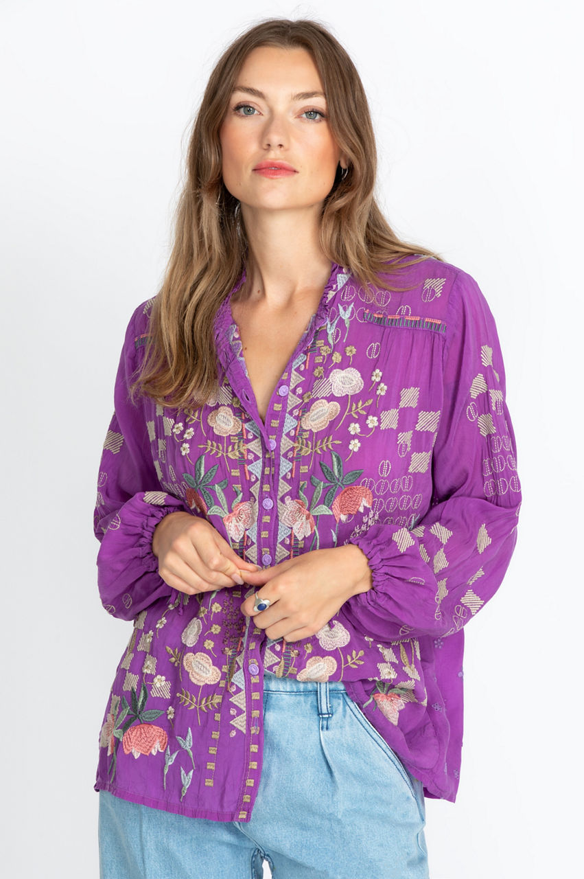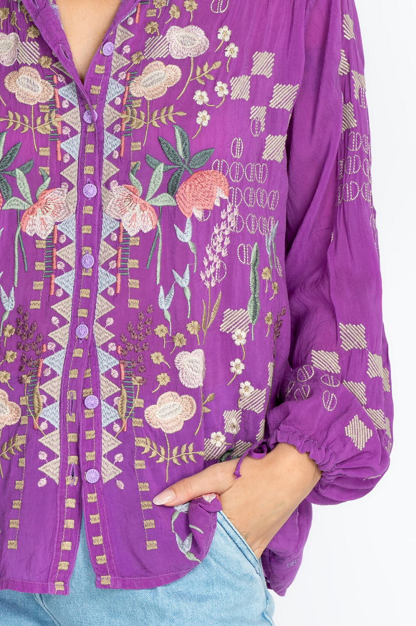 Our Brielle Blouse is an understated, gorgeous top featuring embroidery in a floral motif, ties on the sleeves for an ultra-feminine touch, and a button-down front that pulls the whole piece together. The light and flowy silhouette allow you to remain cool and chic simultaneously. Dress up this piece with dark jeans and chic heels, or tie it together with sophisticated flats for a more casual outing.