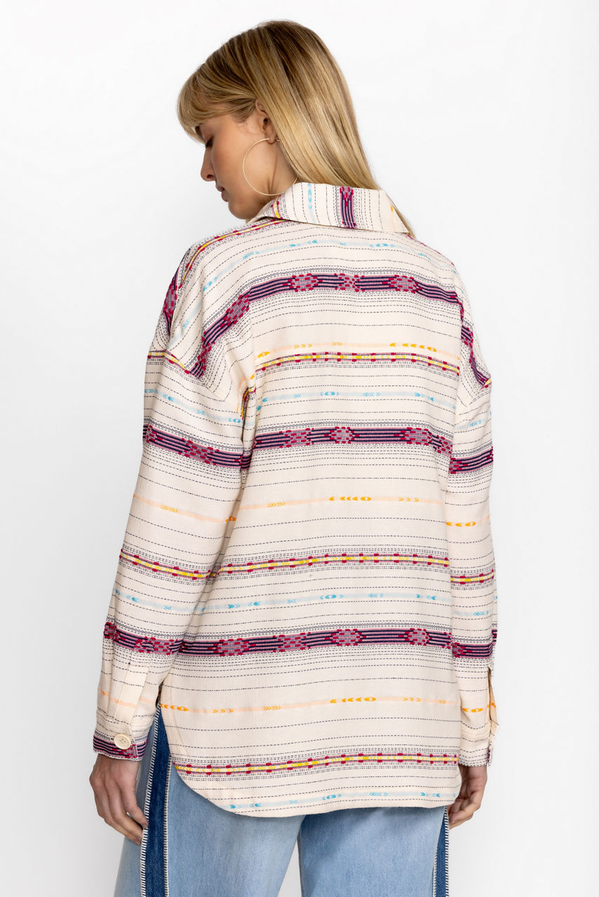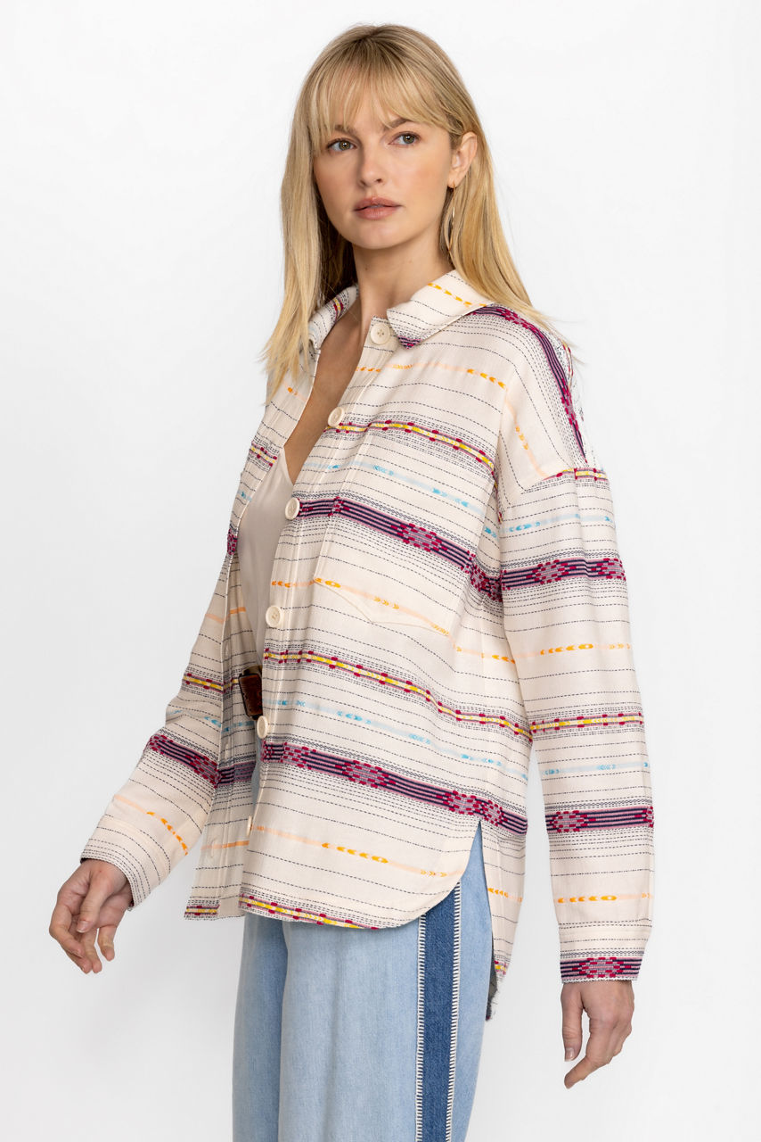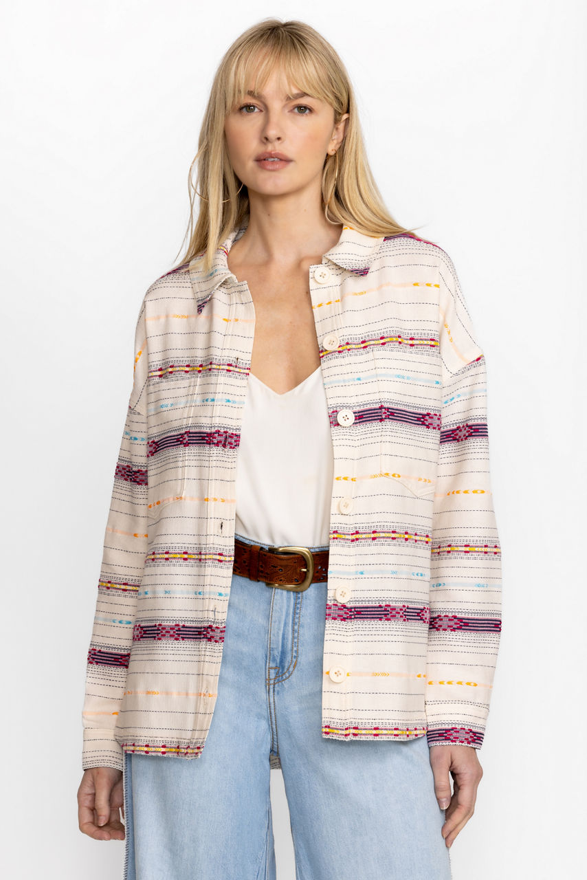 Offering a lightweight outer layer, the Brigitta Oversized Shirt Jacket is a bold mix of texture and pattern. Crafted from an easy-care cotton blend fabric, this relaxed fit jacket features front flap pockets and is enhanced with bold stripes. Pair with a classic tee and relaxed fit denim for a fresh take on casual dressing.