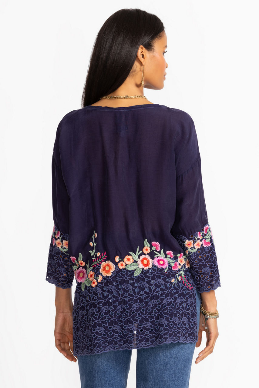 Beautifully embellished with ornate floral detailing, the Brixley Tunic offers a fresh take on a classic tee. Featuring a curved neckline and dropped shoulders, this tunic is finished with 3/4 sleeves and a relaxed bodice. Pair with linen shorts and casual sandals on your next vacation for a day of sightseeing.