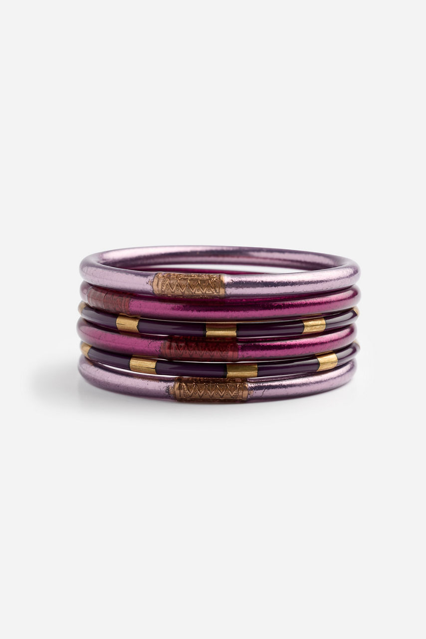 Radiating effortless charm and intention, the BuDhaGirl® Bracelet Bloom Stack captures the spirit of mindful luxury. This set of six All Weather Bangles is infused with genuine gold leaf and adorned with a delicate serenity prayer bead embodying beauty, resilience, and purpose. Style them with flowing silks, crisp linens, or your favorite denim for a luminous touch that transitions seamlessly from sunrise to sunset.
