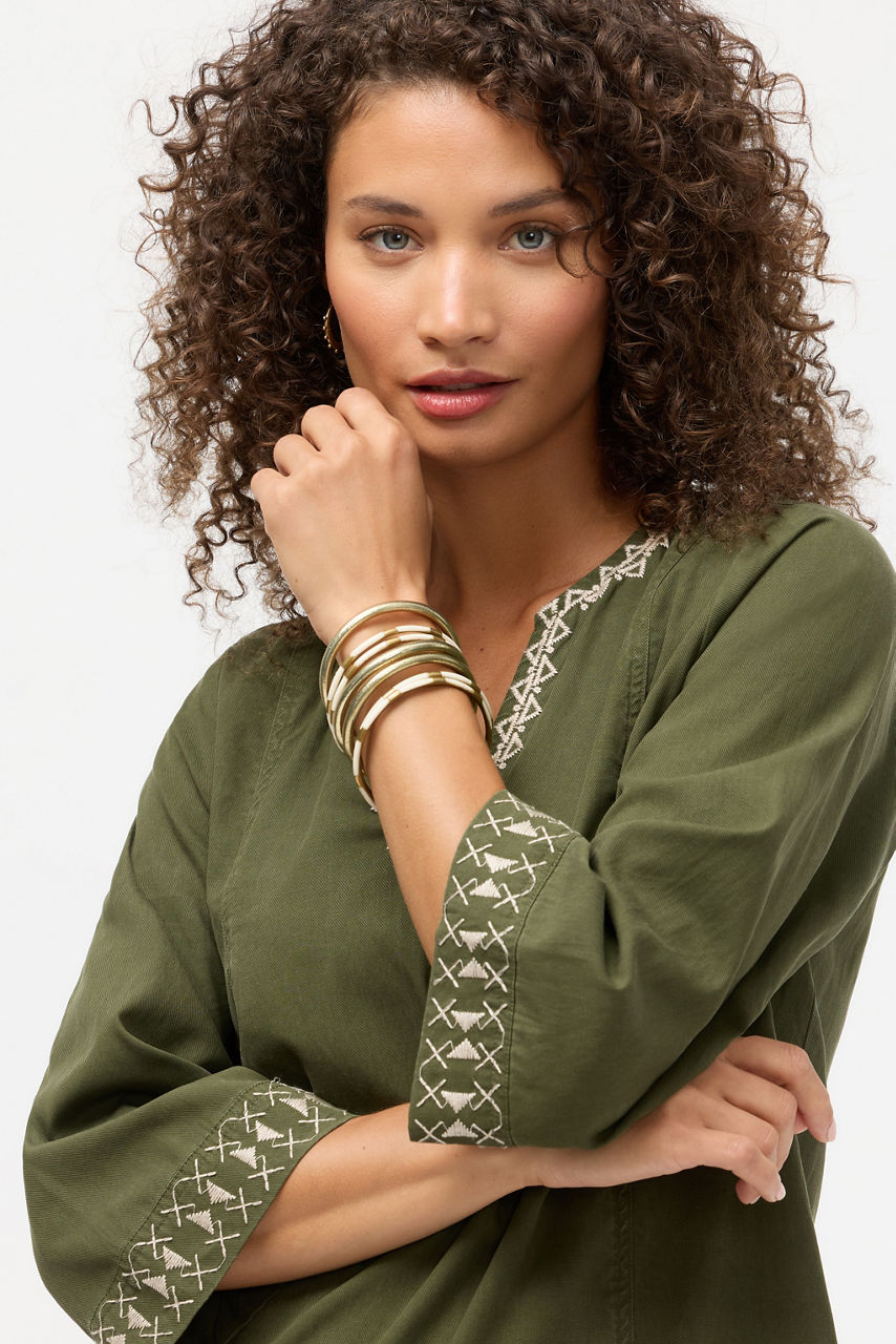 Radiating effortless charm and intention, the BuDhaGirl® Bracelet Cloud Stack captures the spirit of mindful luxury. This set of six All Weather Bangles is infused with genuine gold leaf and adorned with a delicate serenity prayer bead embodying beauty, resilience, and purpose. Style them with flowing silks, crisp linens, or your favorite denim for a luminous touch that transitions seamlessly from sunrise to sunset.