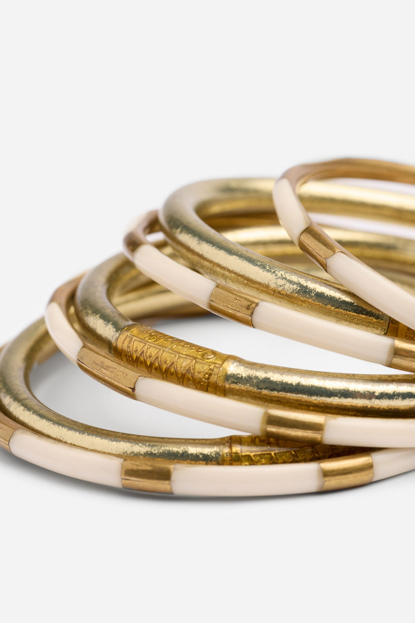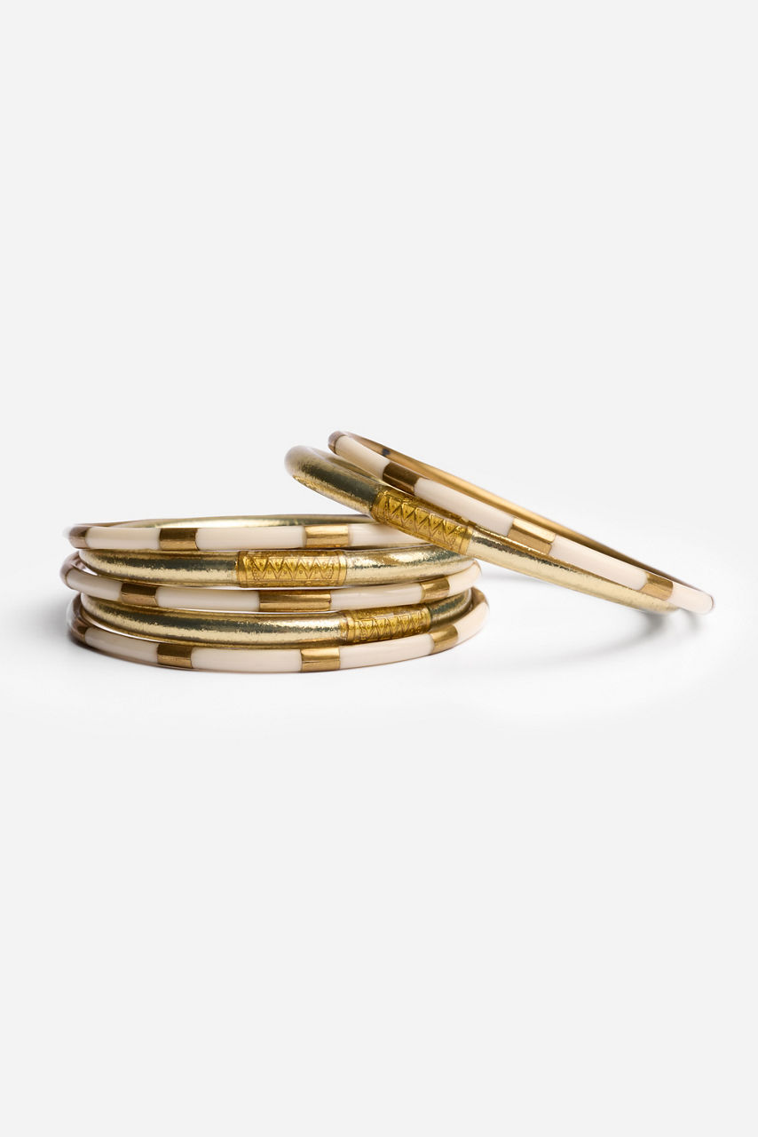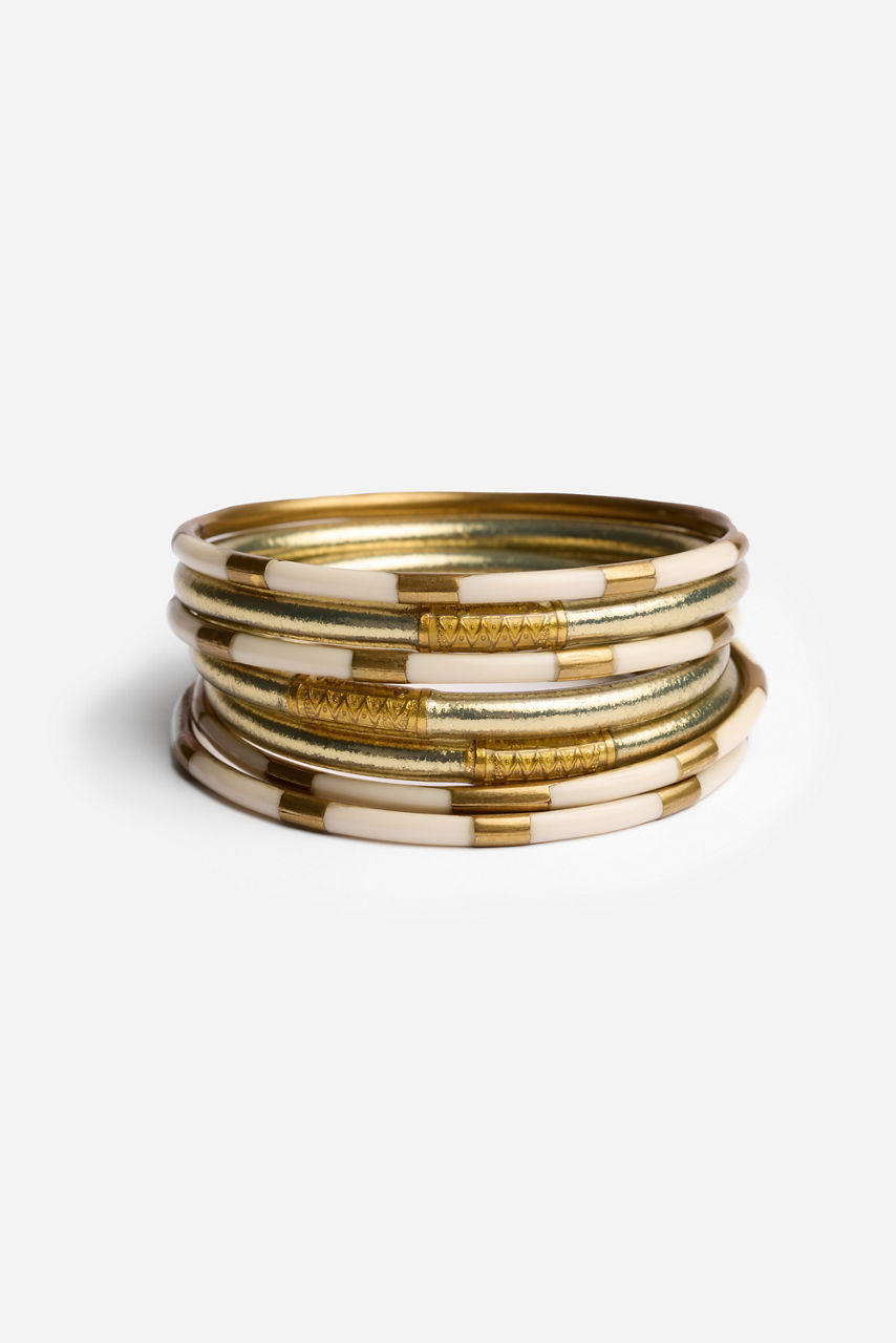 Radiating effortless charm and intention, the BuDhaGirl® Bracelet Cloud Stack captures the spirit of mindful luxury. This set of six All Weather Bangles is infused with genuine gold leaf and adorned with a delicate serenity prayer bead embodying beauty, resilience, and purpose. Style them with flowing silks, crisp linens, or your favorite denim for a luminous touch that transitions seamlessly from sunrise to sunset.