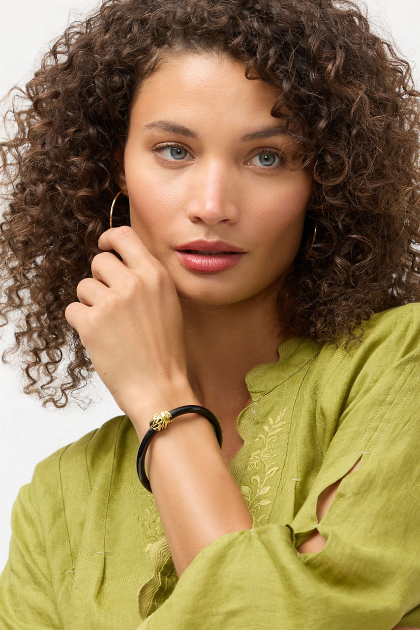 Radiating effortless charm and intention, the BuDhaGirl® Fauna Black Lion Bracelet captures the spirit of mindfulness. This black metallic bracelet is infused with a genuine gold leaf lion head and is adorned with a delicate serenity prayer bead embodying beauty, resilience, and purpose. Style it with flowing silks, crisp linens, or your favorite denim for a luminous touch that transitions seamlessly from sunrise to sunset.
