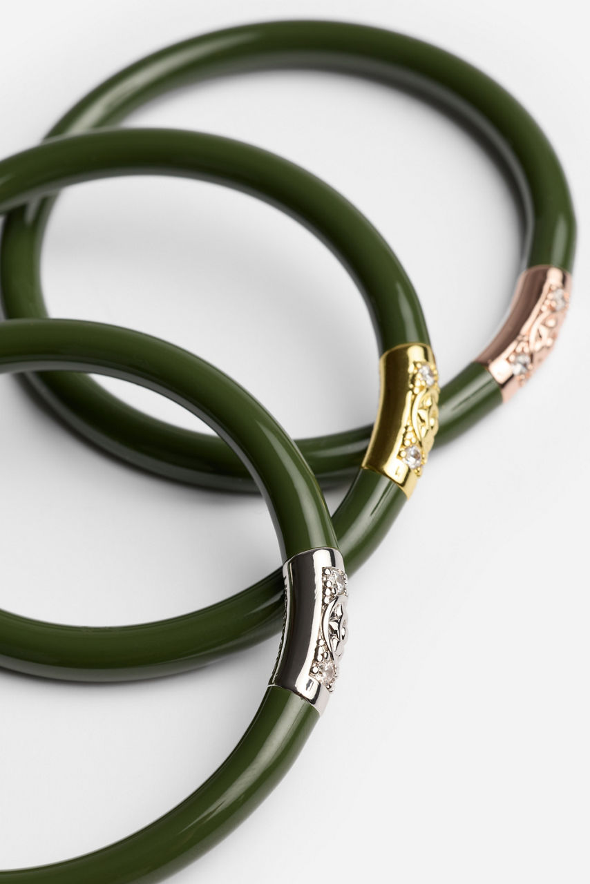 Radiating effortless charm and intention, the BuDhaGirl® Jade Stack captures the spirit of mindful luxury. All Weather Bangles features BuDhaGirl's exclusive Lotus prayer beads in yellow gold, white gold, and rose gold, creating a timeless contrast against the bracelet’s soft jade hue. Style them with flowing silks, crisp linens, or your favorite denim for a luminous touch that transitions seamlessly from sunrise to sunset.