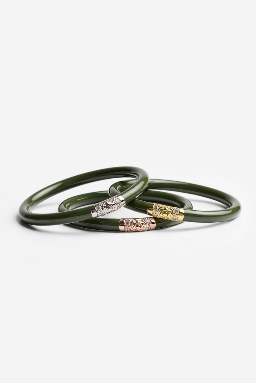 Radiating effortless charm and intention, the BuDhaGirl® Jade Stack captures the spirit of mindful luxury. All Weather Bangles features BuDhaGirl's exclusive Lotus prayer beads in yellow gold, white gold, and rose gold, creating a timeless contrast against the bracelet’s soft jade hue. Style them with flowing silks, crisp linens, or your favorite denim for a luminous touch that transitions seamlessly from sunrise to sunset.