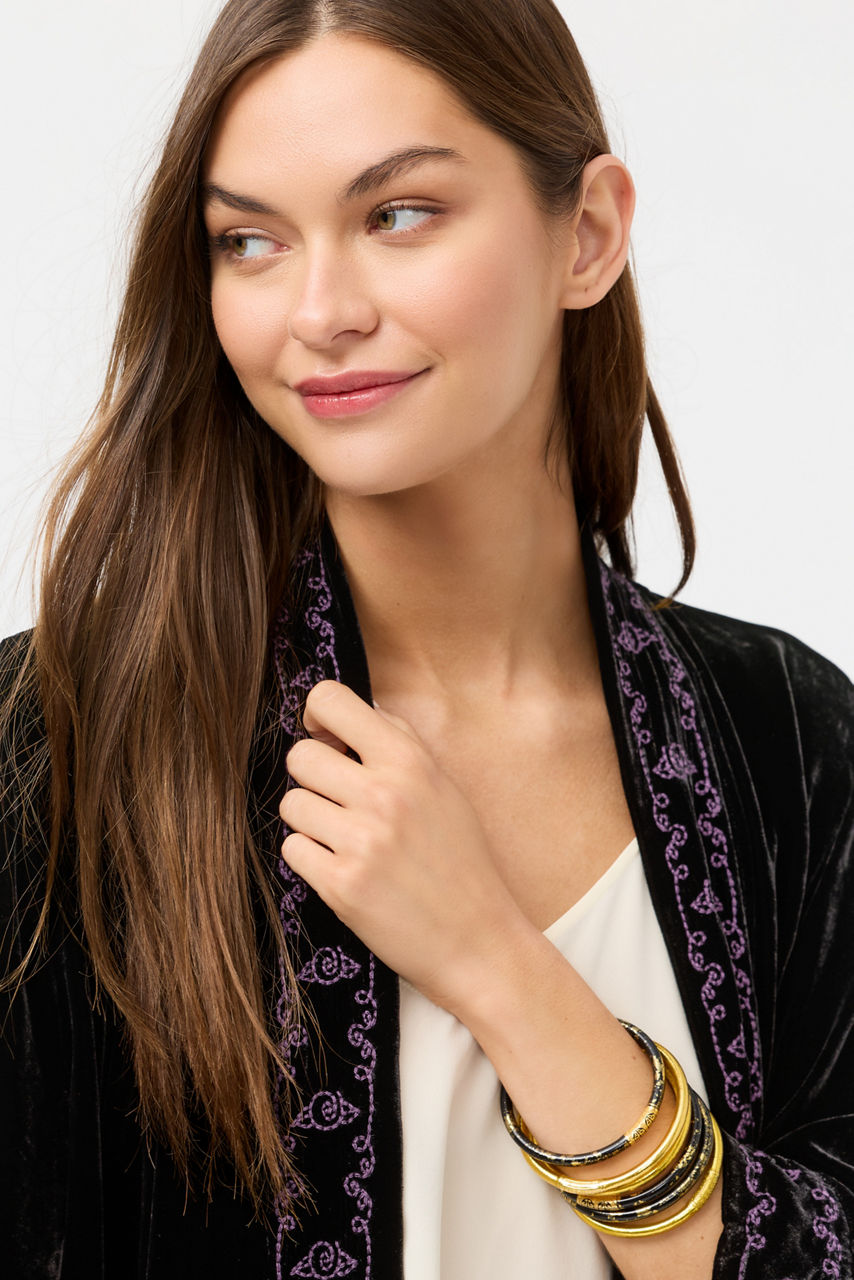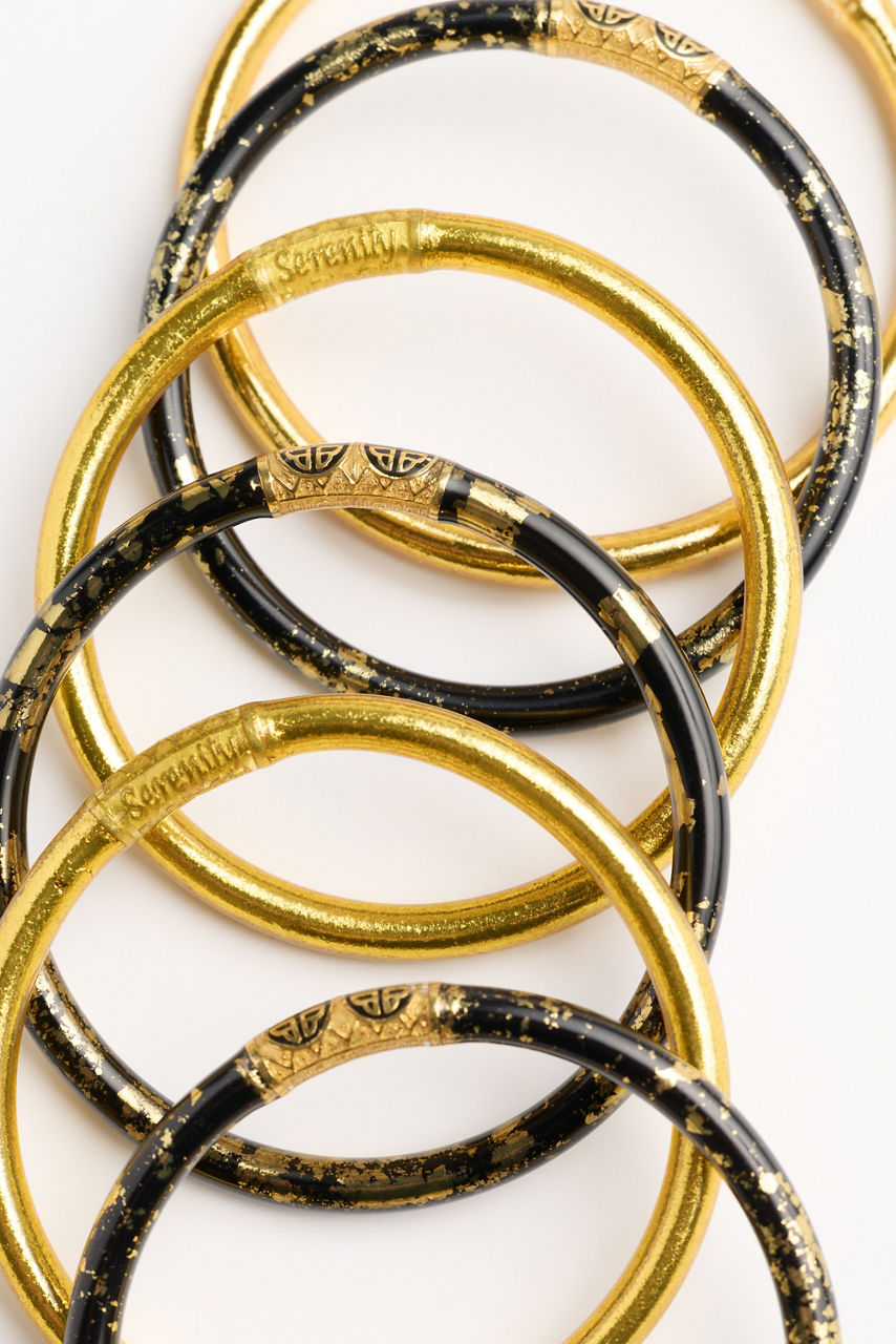 Radiating effortless charm and intention, the BuDhaGirl® Night Stack captures the spirit of mindful luxury. This set of six All Weather Bangles is infused with genuine gold leaf and adorned with a delicate serenity prayer bead embodying beauty, resilience, and purpose. Style them with flowing silks, crisp linens, or your favorite denim for a luminous touch that transitions seamlessly from sunrise to sunset.