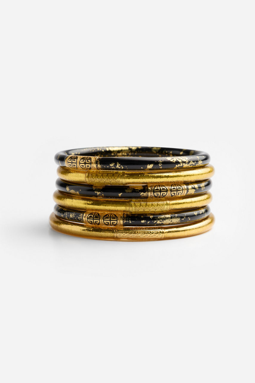 Radiating effortless charm and intention, the BuDhaGirl® Night Stack captures the spirit of mindful luxury. This set of six All Weather Bangles is infused with genuine gold leaf and adorned with a delicate serenity prayer bead embodying beauty, resilience, and purpose. Style them with flowing silks, crisp linens, or your favorite denim for a luminous touch that transitions seamlessly from sunrise to sunset.