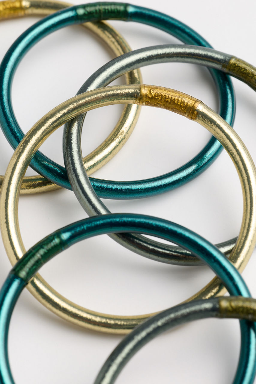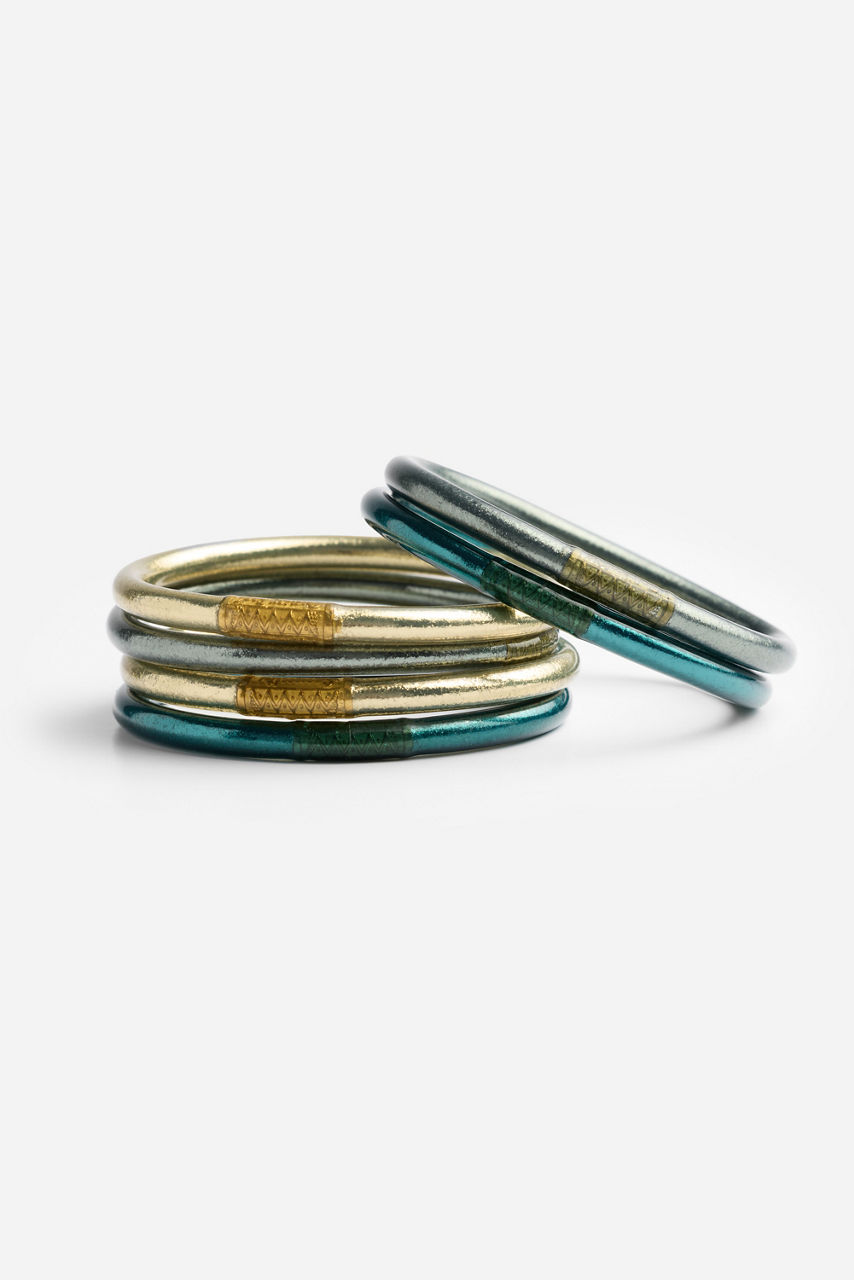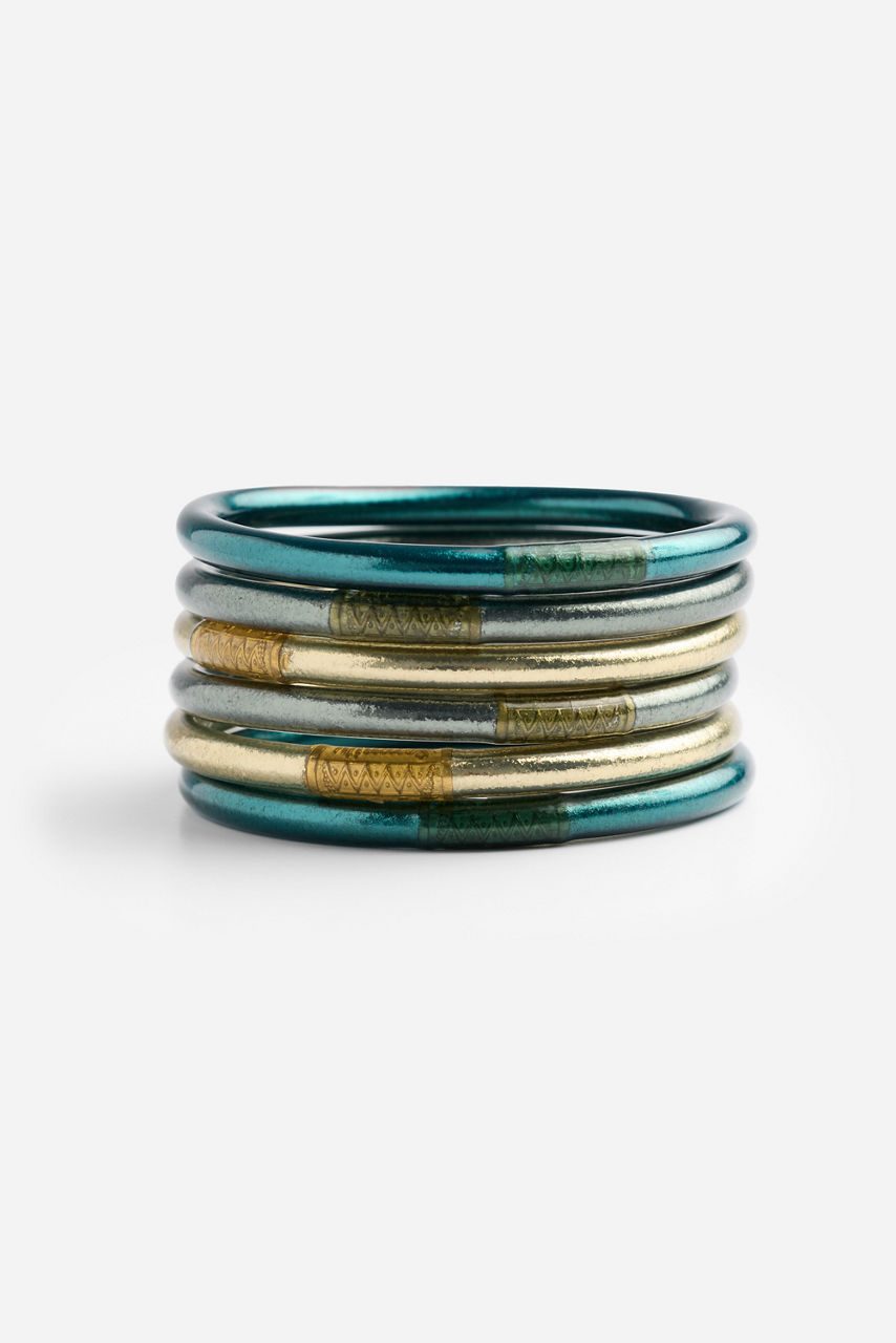 Radiating effortless charm and intention, the BuDhaGirl® Plume Stack Bracelet captures the spirit of mindful luxury. This set of six All Weather Bangles is infused with genuine gold leaf and adorned with a delicate serenity prayer bead embodying beauty, resilience, and purpose. Style them with flowing silks, crisp linens, or your favorite denim for a luminous touch that transitions seamlessly from sunrise to sunset.