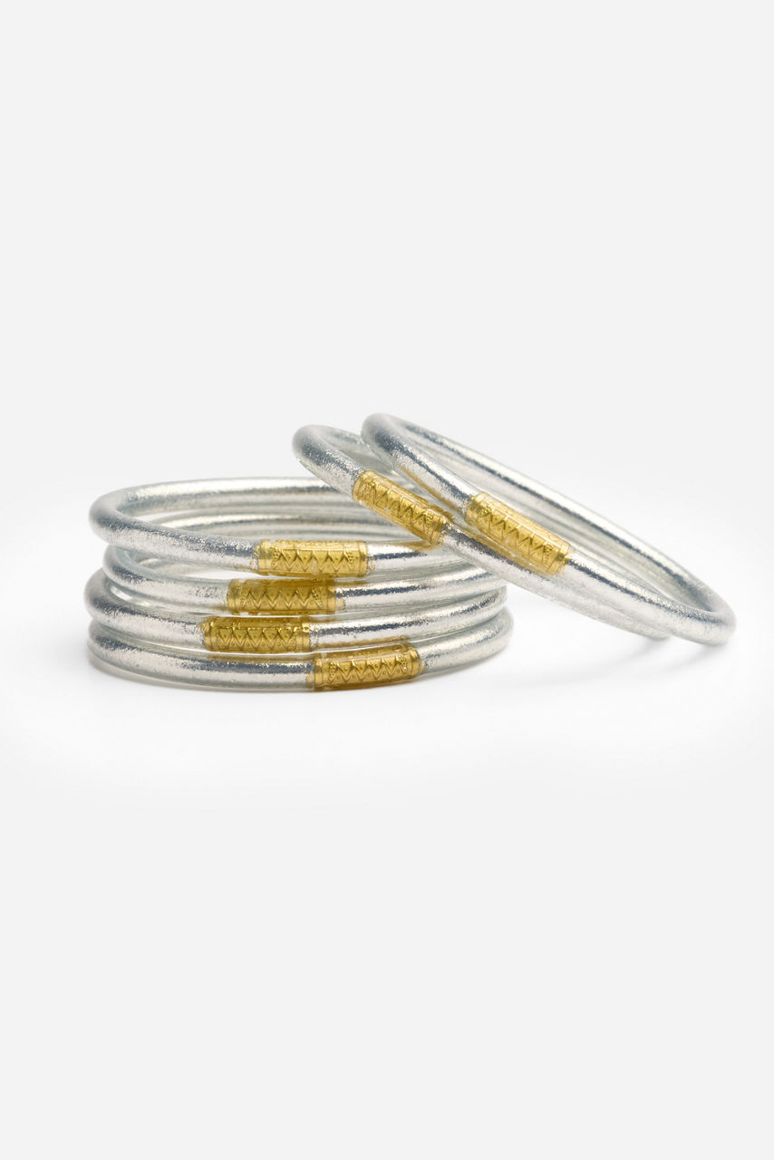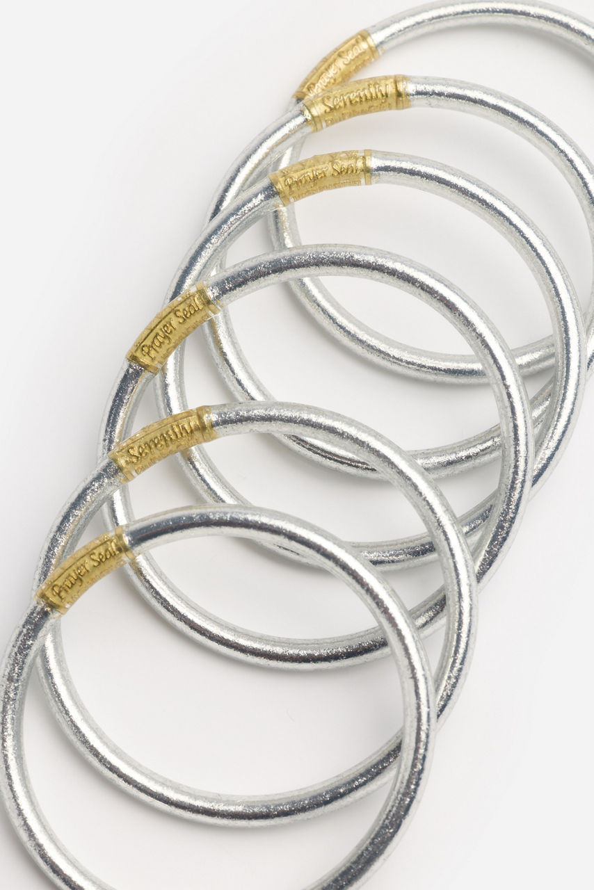 Radiating effortless charm and intention, the BuDhaGirl® Silver Bracelet Stack captures the spirit of mindfulness. Featuring six All Weather Bangles in glittering silver adorned with a delicate serenity prayer bead, this set embodies beauty, resilience, and purpose. Style them with flowing silks, crisp linens, or your favorite denim for a luminous touch that transitions seamlessly from sunrise to sunset.