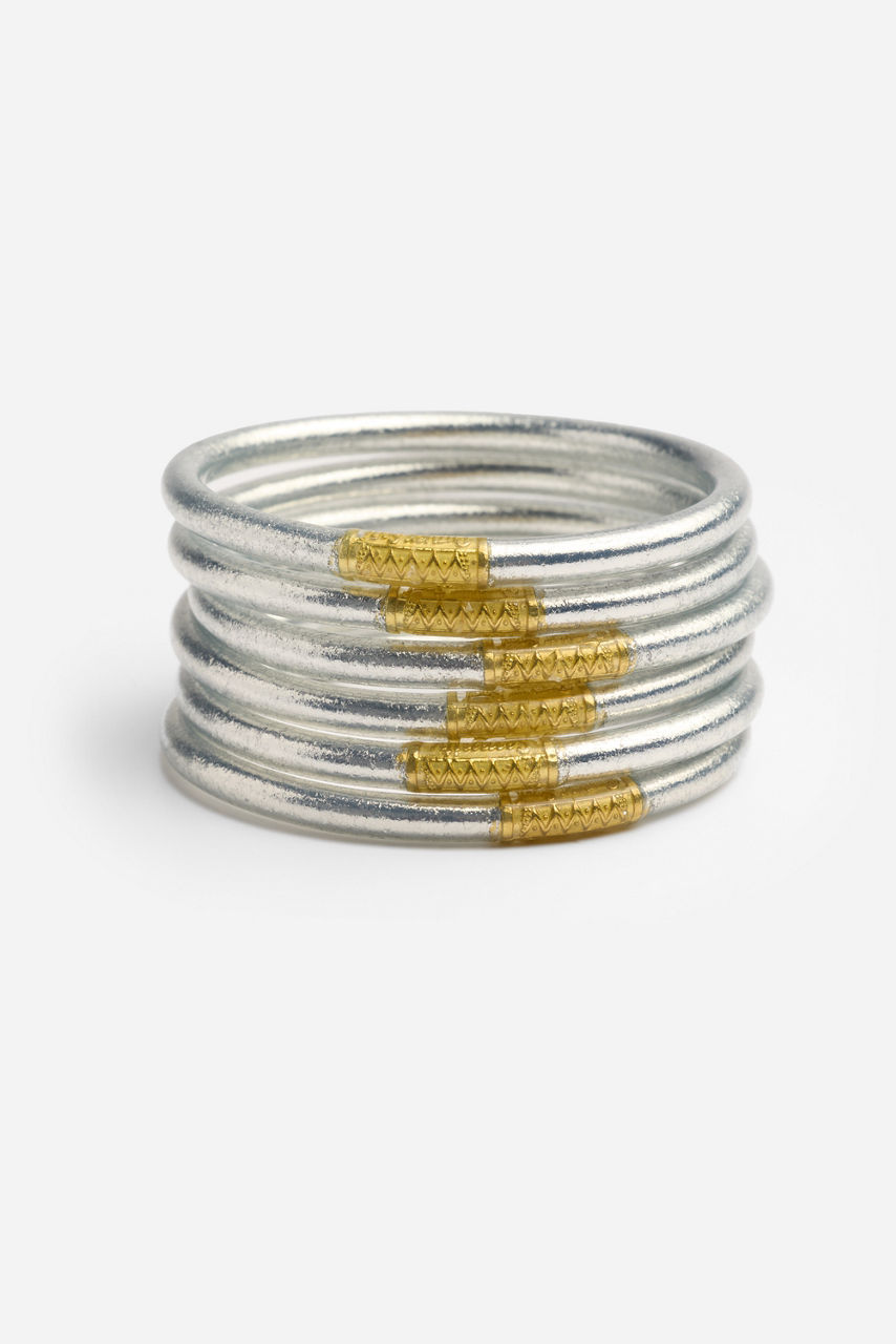 Radiating effortless charm and intention, the BuDhaGirl® Silver Bracelet Stack captures the spirit of mindfulness. Featuring six All Weather Bangles in glittering silver adorned with a delicate serenity prayer bead, this set embodies beauty, resilience, and purpose. Style them with flowing silks, crisp linens, or your favorite denim for a luminous touch that transitions seamlessly from sunrise to sunset.
