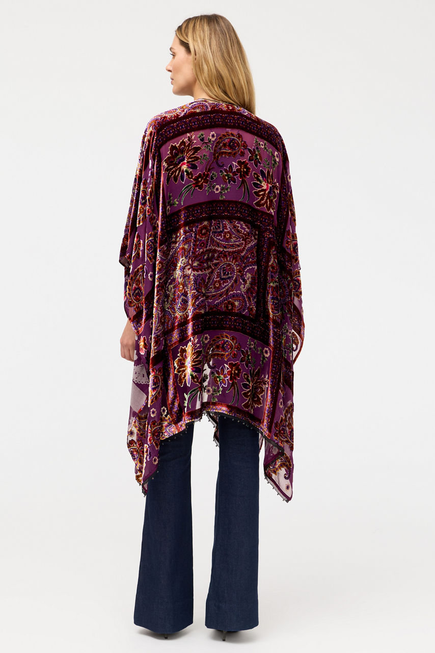 Beautifully embellished with a rich paisley and floral pattern in a patchwork style, the Domitila Burnout Velvet Shawl is designed to drape gracefully across the shoulders. Crafted from a rich silk blend, this elegant scarf features 3/4 sleeves and openings at the front and sides. Layer over a fitted jumpsuit and pair with colorful flats for an eclectic daytime look.