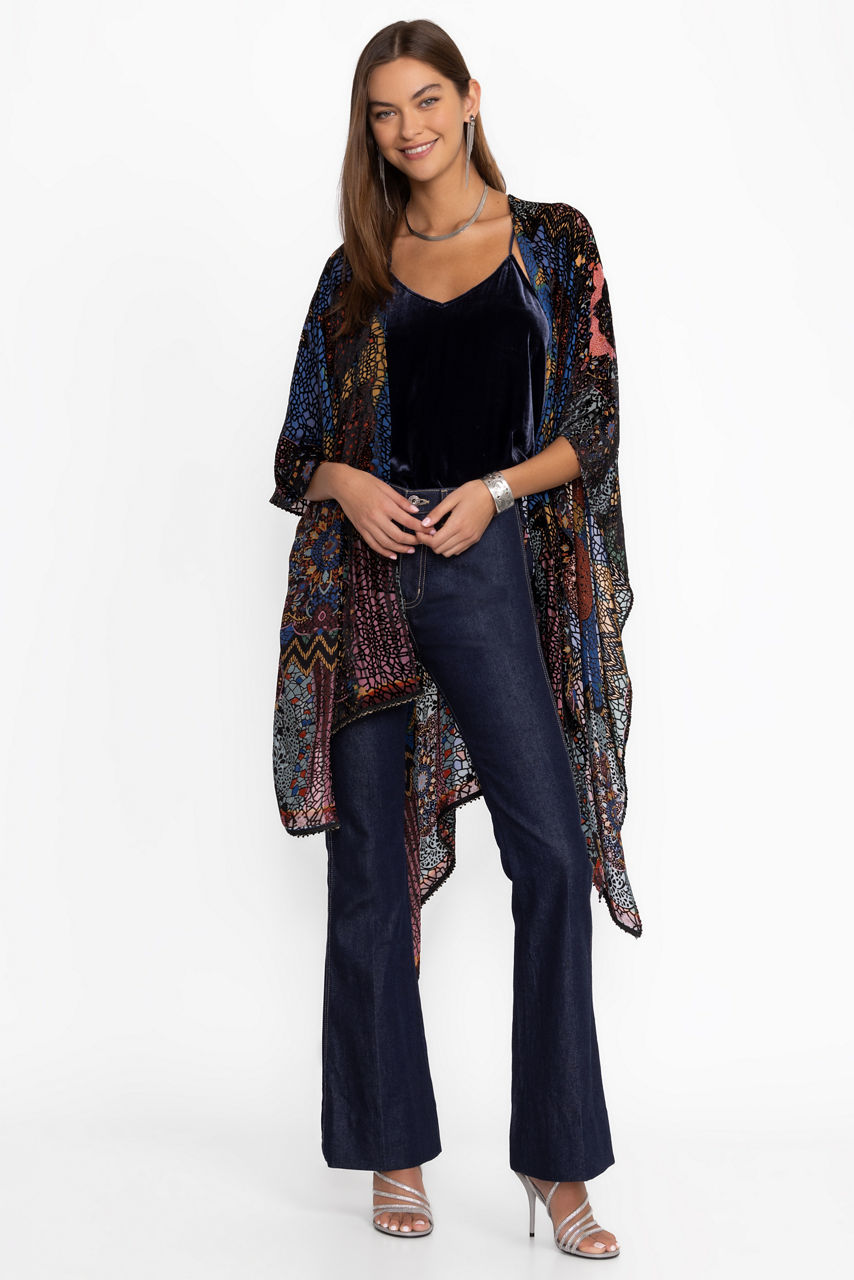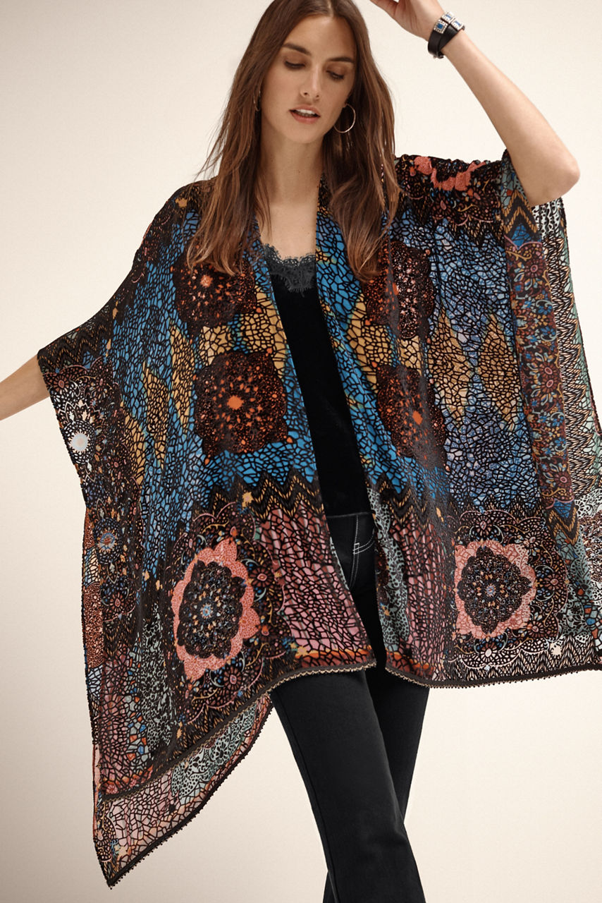Crafted from a unique silk blend, the Burnout Velvet Shawl is washed in a vibrant patchwork pattern. Featuring an open front and a waterfall silhouette, this lightweight layering piece adds a hint of drama to your look. Layer over fitted legging and a long sleeve mock-neck top for a polished look.