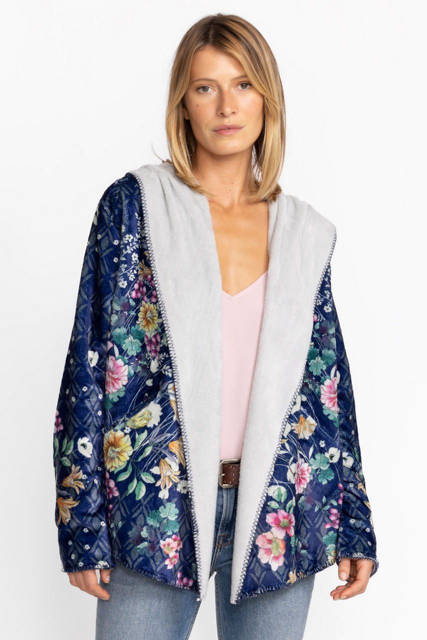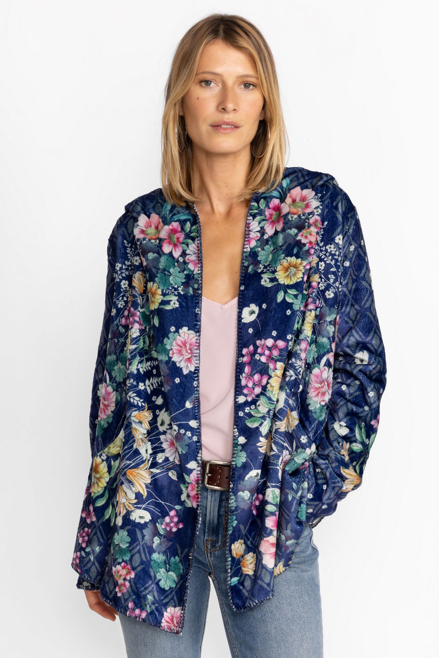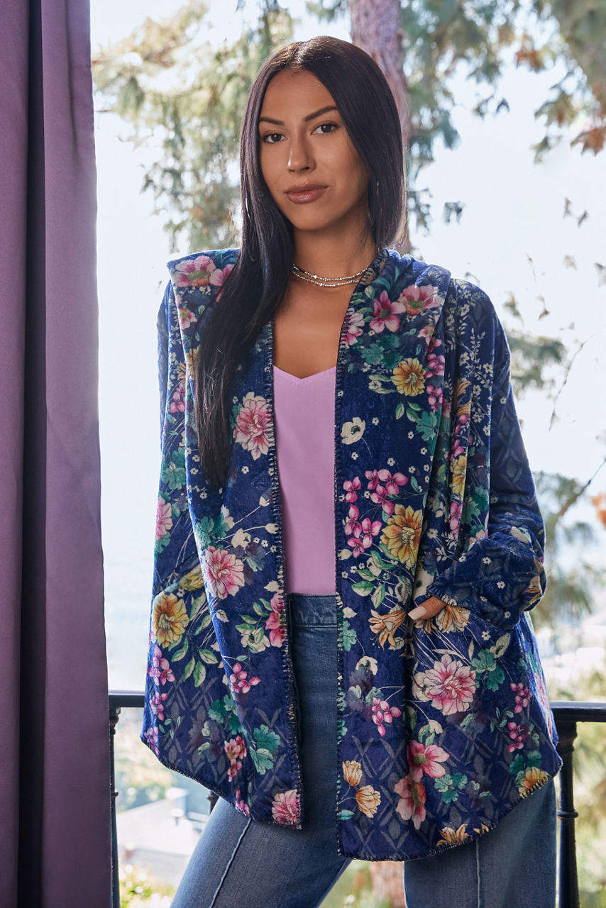 Crafted from a soft, insulating material, the Bursting Echo Sherpa Jacket lends a fashion-forward touch to practical layering. Elevated by a blossoming floral pattern in bright tones, this jacket features a hood, long sleeves, and blanket stitch detailing. Wear this jacket solo with a tee or layer under a coat on cooler days.