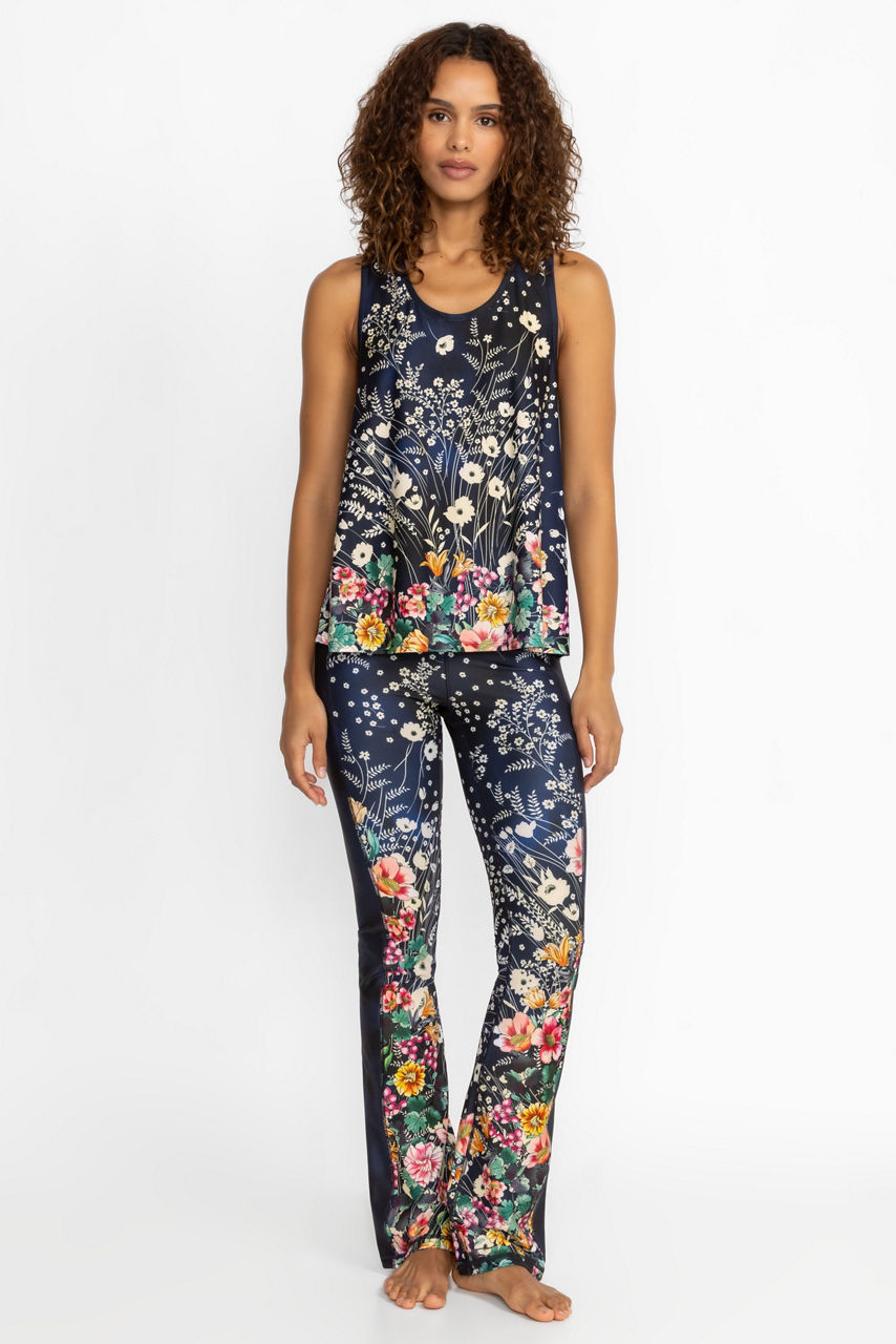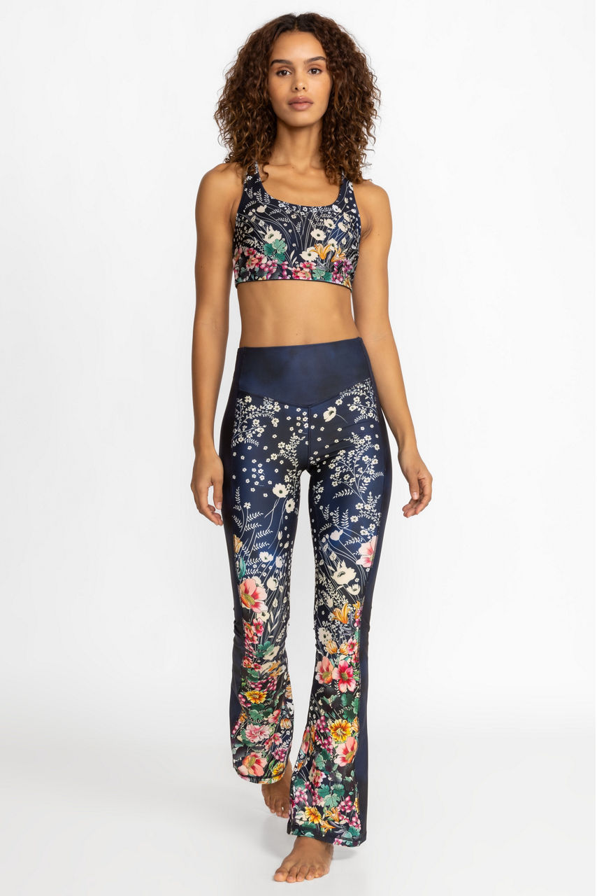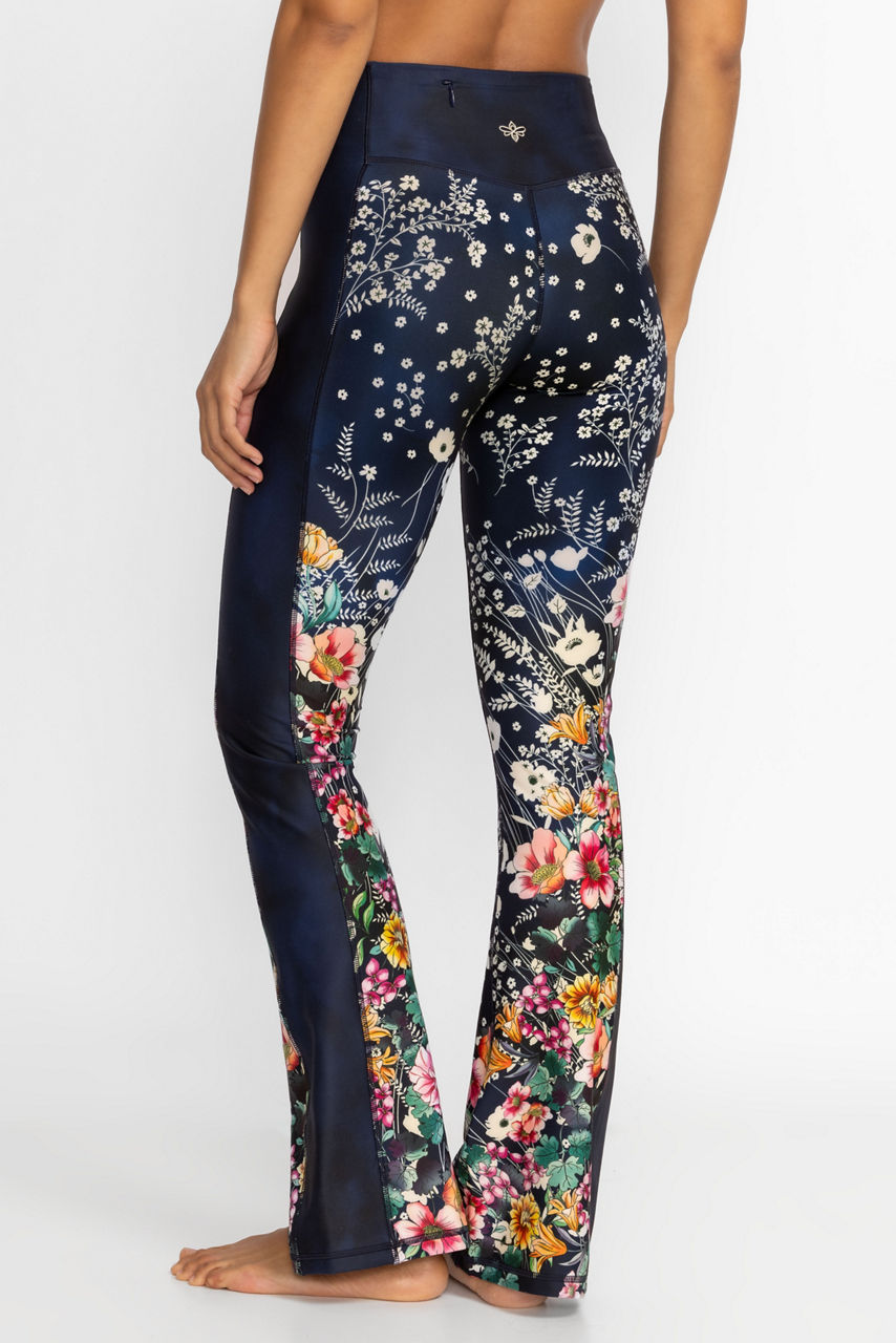 Adopting a vibrant blue color palette, the Bursting High Waist Sculpting Baby Bell Leggings fuse fashion-forward details with functionality. Enhanced by a bell-shaped flared leg, these leggings feature a zipper pocket at the back waist, an elastic waistband, and an elegant floral arrangement. Pair these leggings with the matching tank for a stylish head-to-toe finish.