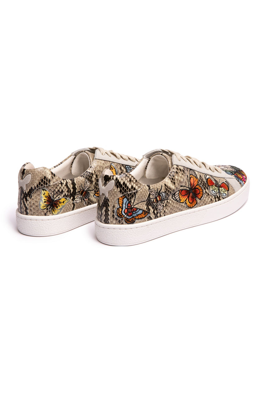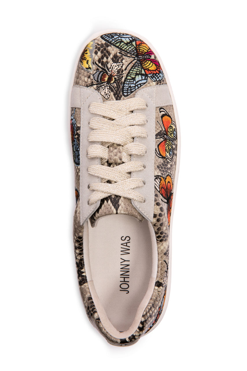 Whether you re exploring new spots around town or going out to lunch with friends, our Butterfly Sneakers add a touch of charming flair to any boho ensemble. Its fierce butterfly prints, flawless embossed leather, and chic design make these shoes the favorite of this season. Pair with your favorite skinny jeans and an embroidered tunic to pull together an effortlessly laid-back look.