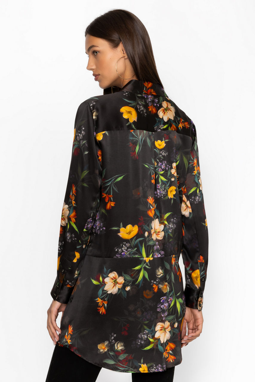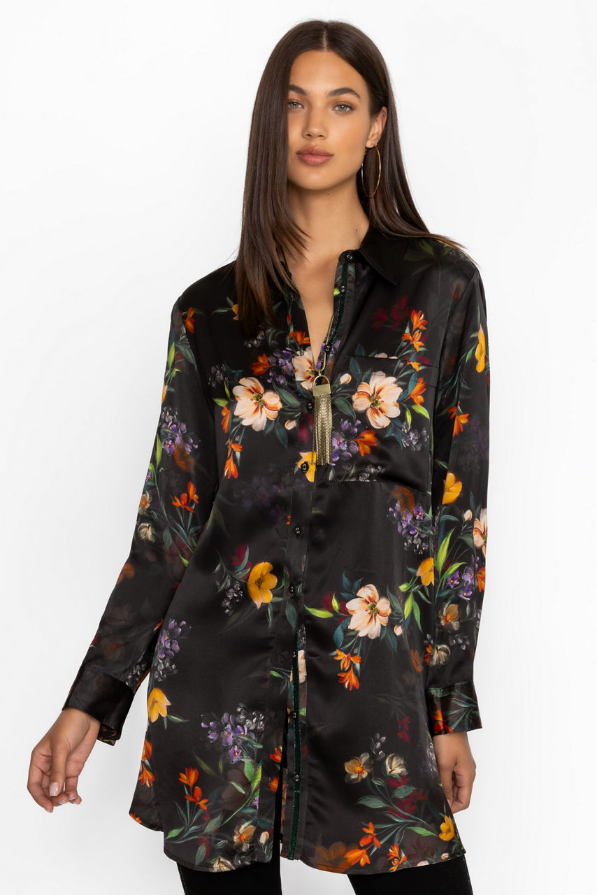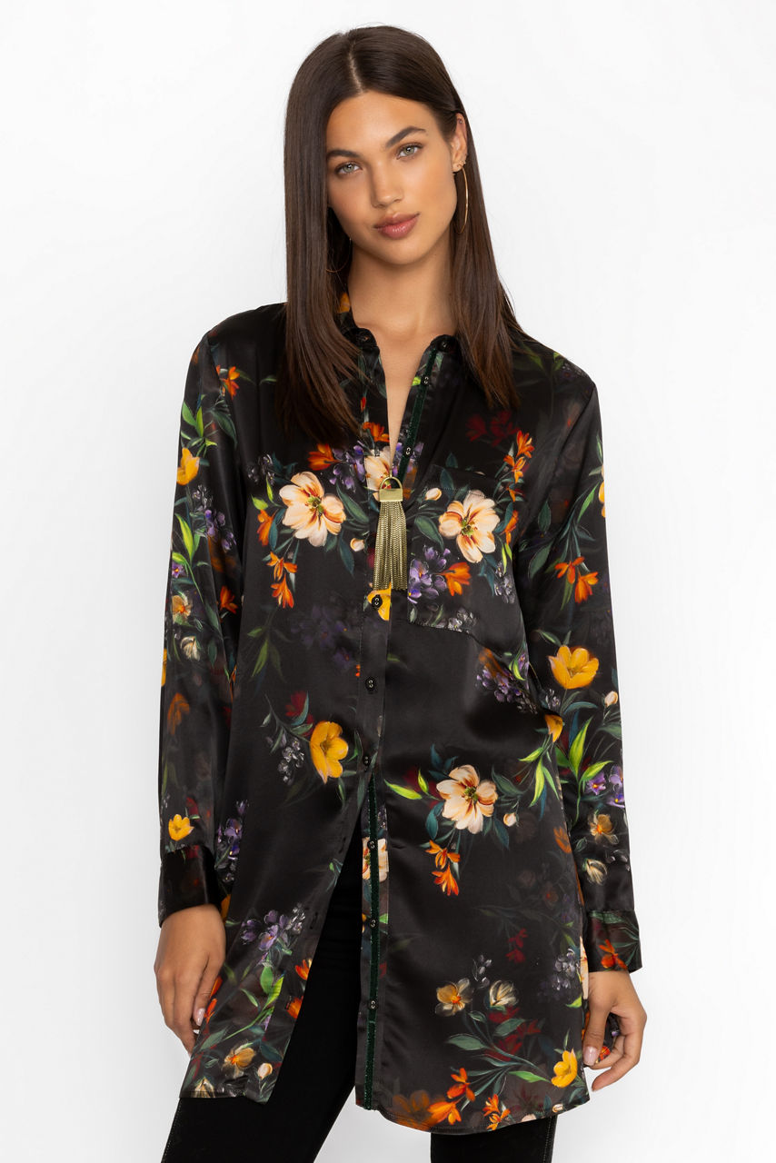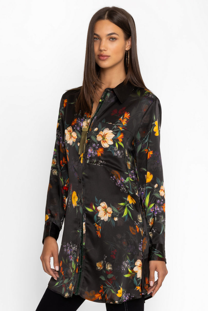 Embellished with brilliant floral bouquets on a rich black backdrop, the Button Detail Swing Tunic Dress is a fresh and feminine take on a menswear classic. Crafted from 100% silk, this uniquely tailored dress features a button-front and distinctive breast pocket. Pair with wedge heels and delicate jewelry for a resort-ready look.