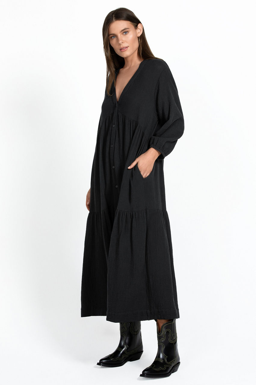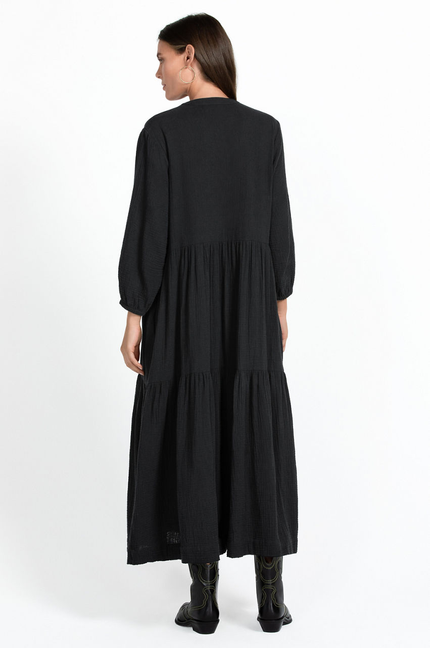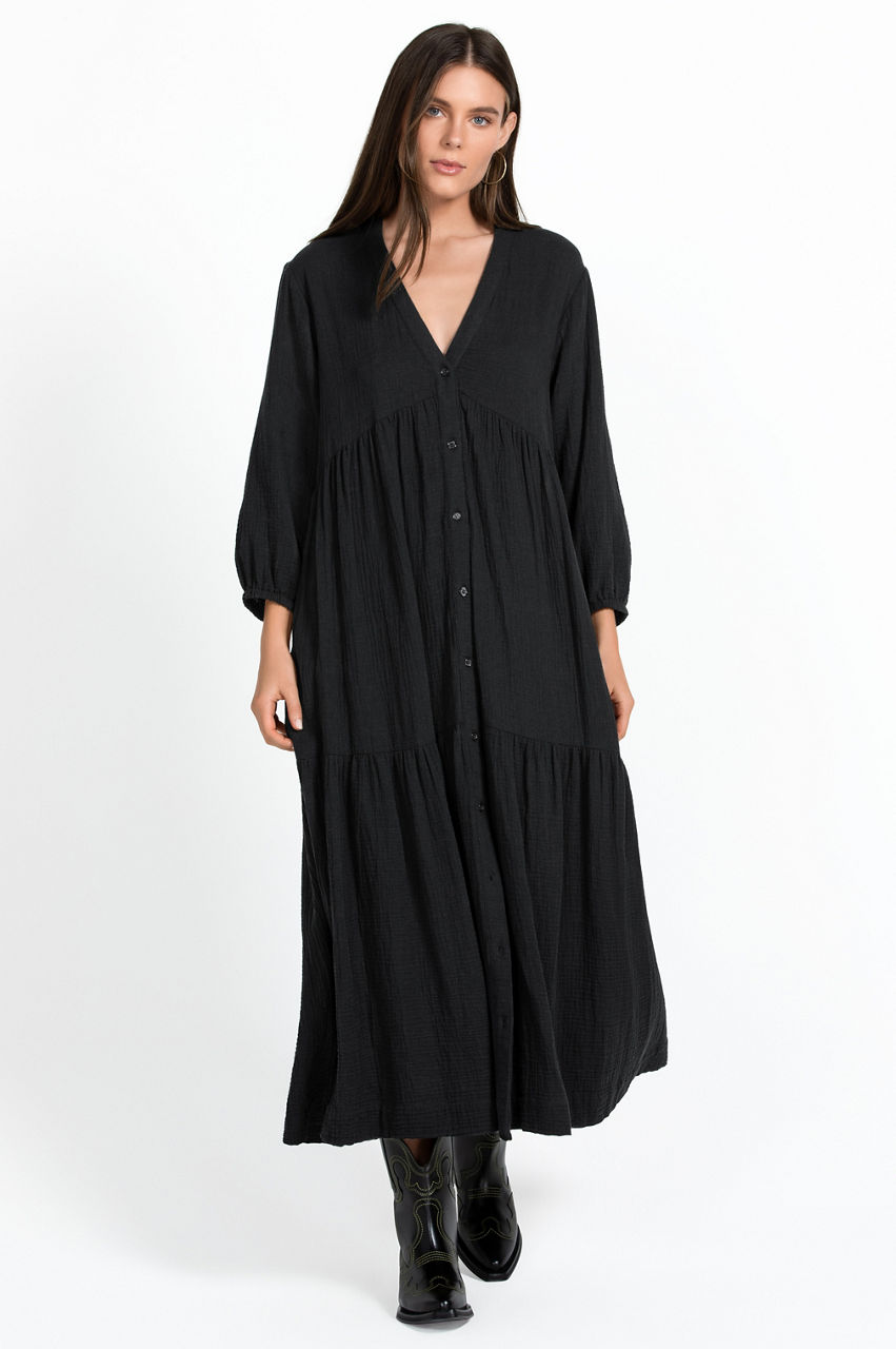 Crafted from pure cotton, the Button Tier V-Neck Dress is equal parts versatile and timeless. Shaped to a maxi silhouette, this dress is characterized by a tiered construction in a slight A-line shape and features a V-neck, front button closure, and long sleeves with elastic cuffs for a comfortable finish. Pair with flats and a tote for a laid-back look that can be worn during the week and while traveling.