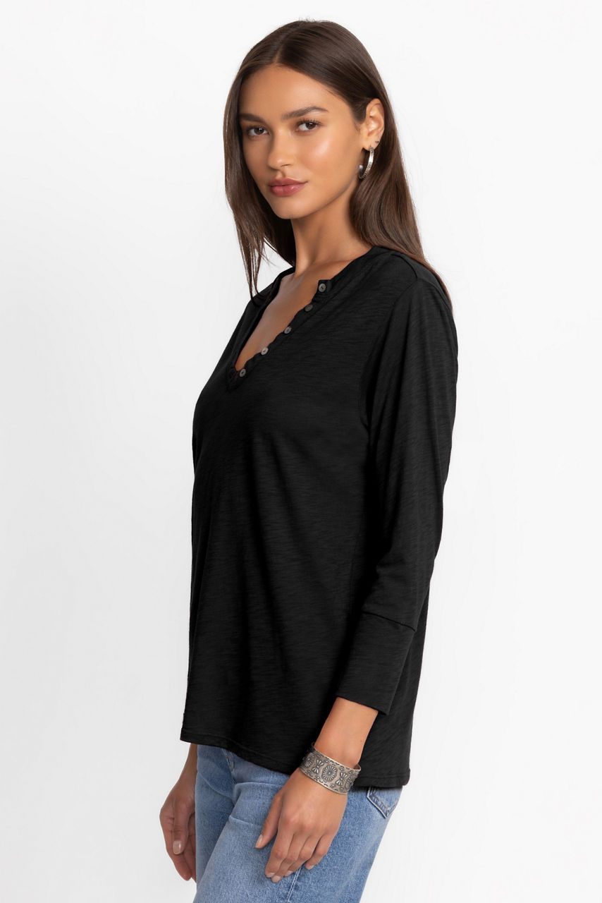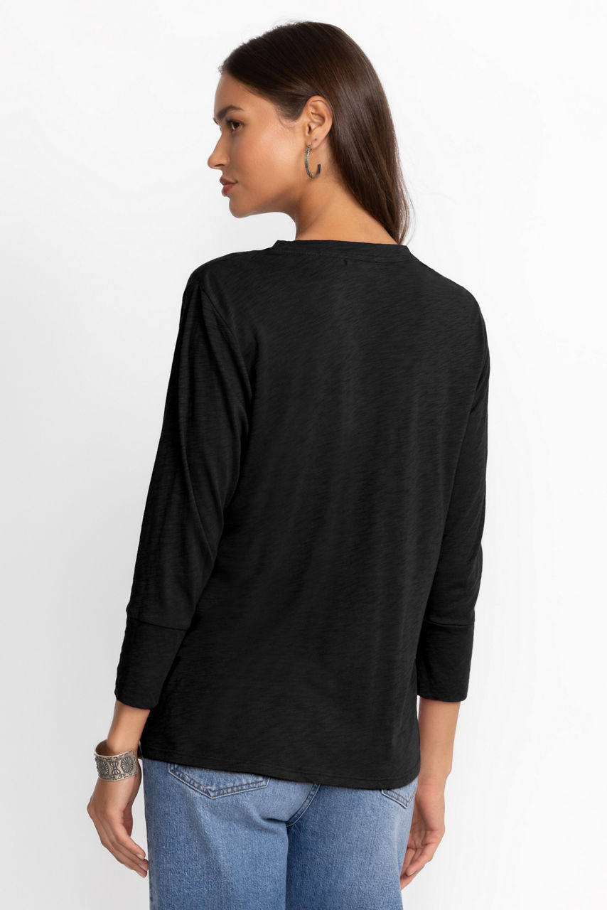 Crafted from a lightweight luxuriously soft cotton blend, the Button V-Neck Tee is an updated wardrobe staple. Featuring a rounded V-neckline with button detailing, this classic tee is finished with 3/4 sleeves and cuffs. Pair with trouser jeans and a cozy cardigan for an evening out with friends.