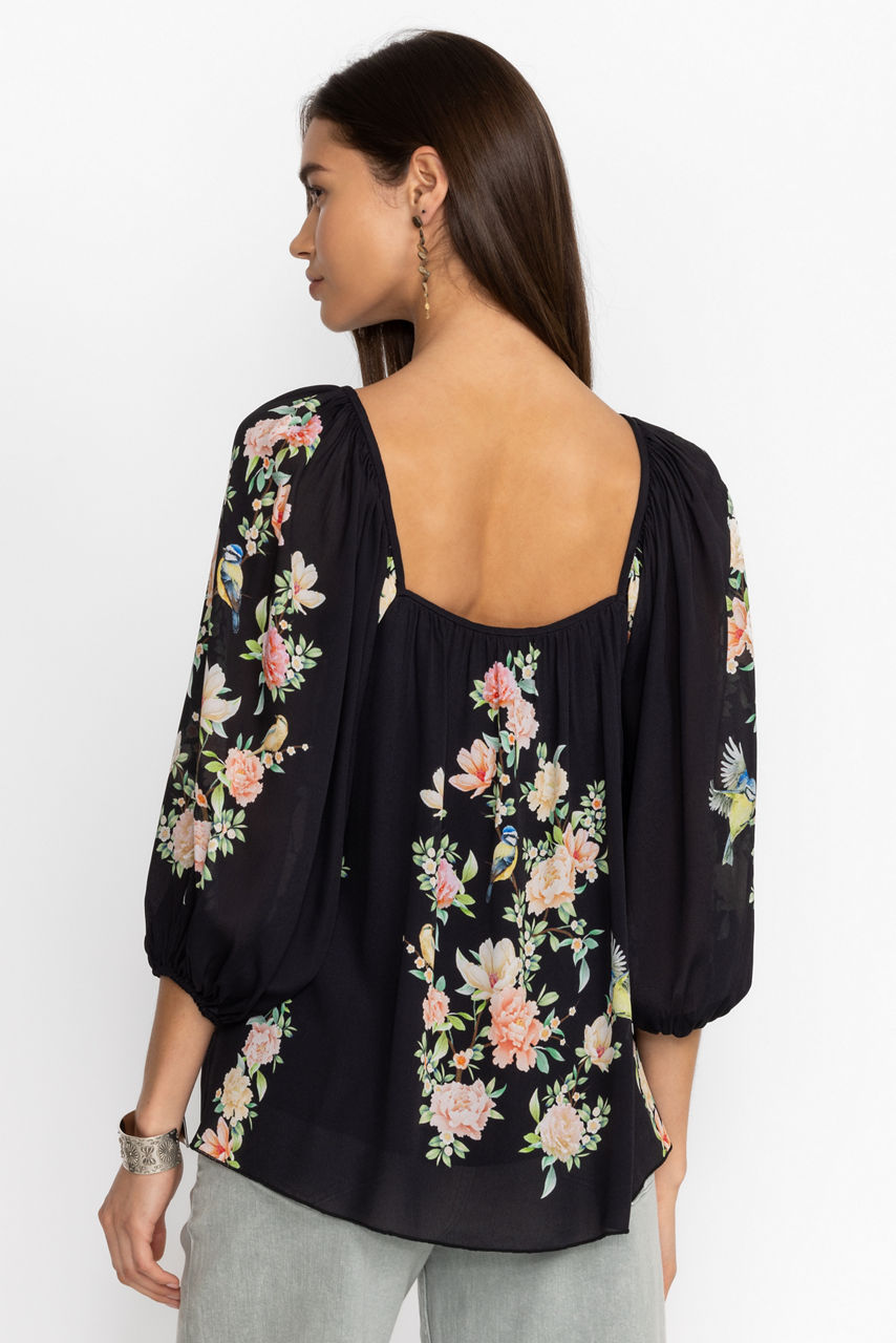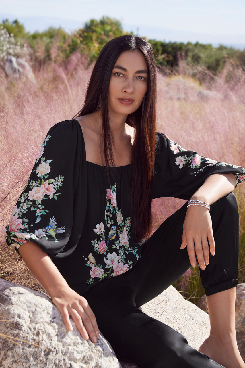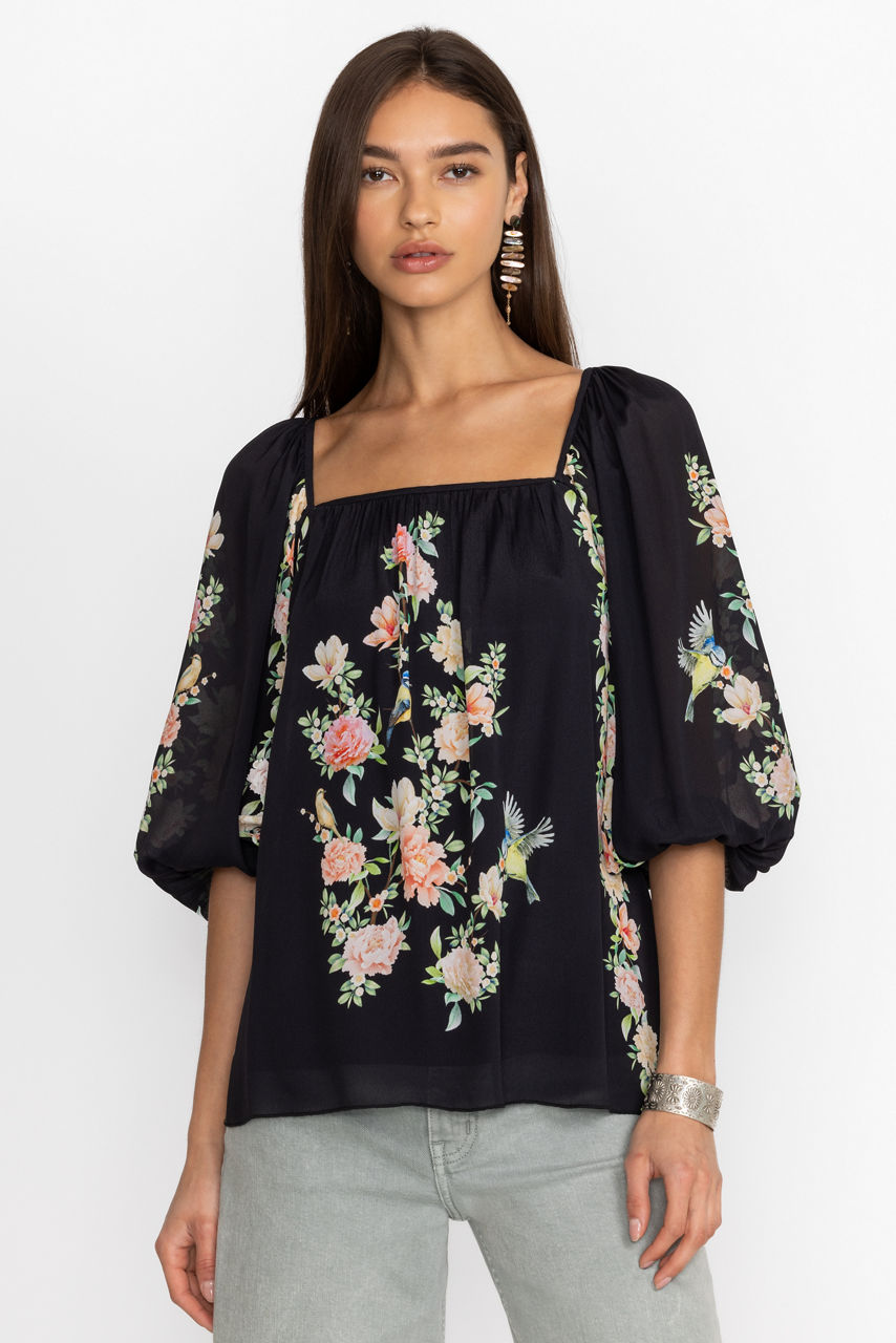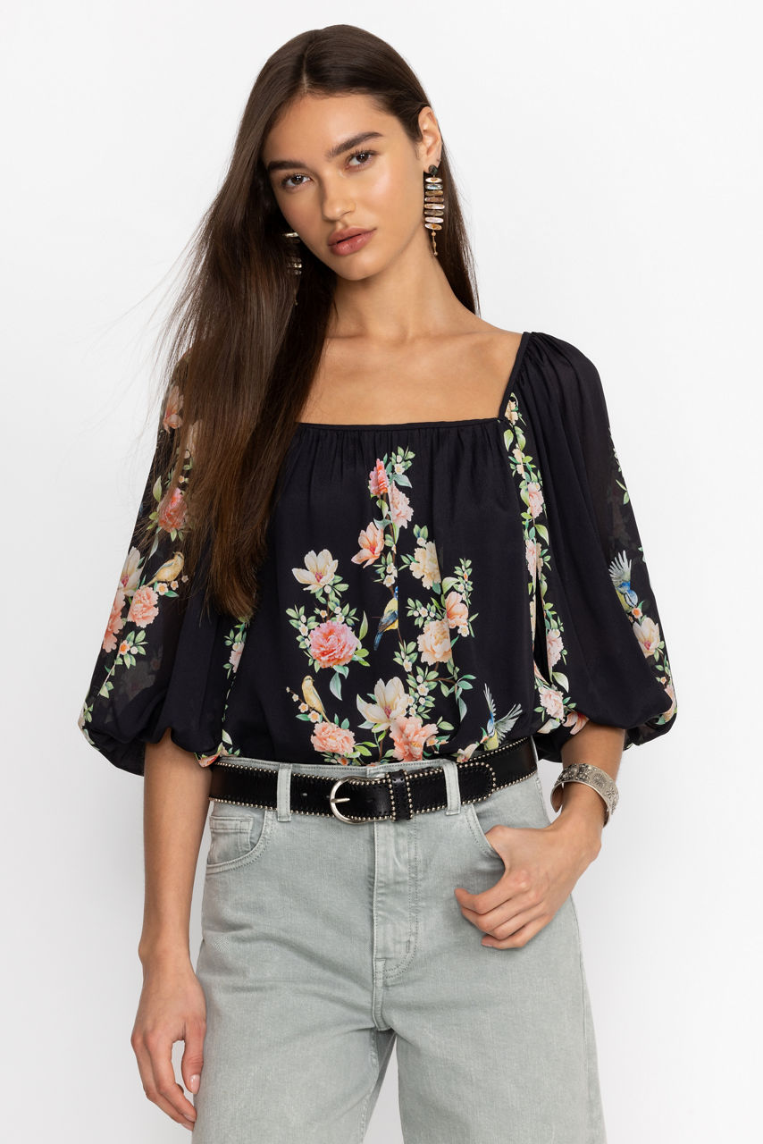 Distinctly feminine, the Byrdie Viscose Blouse offers a flowing silhouette with captivating visual details. Featuring an open square neckline and gently puffed sleeves with elastic cuffs, this blouse illustrates an enchanting natural scene with vibrant blooms. Pair with black leggings and smart flats for a whimsical casual look.