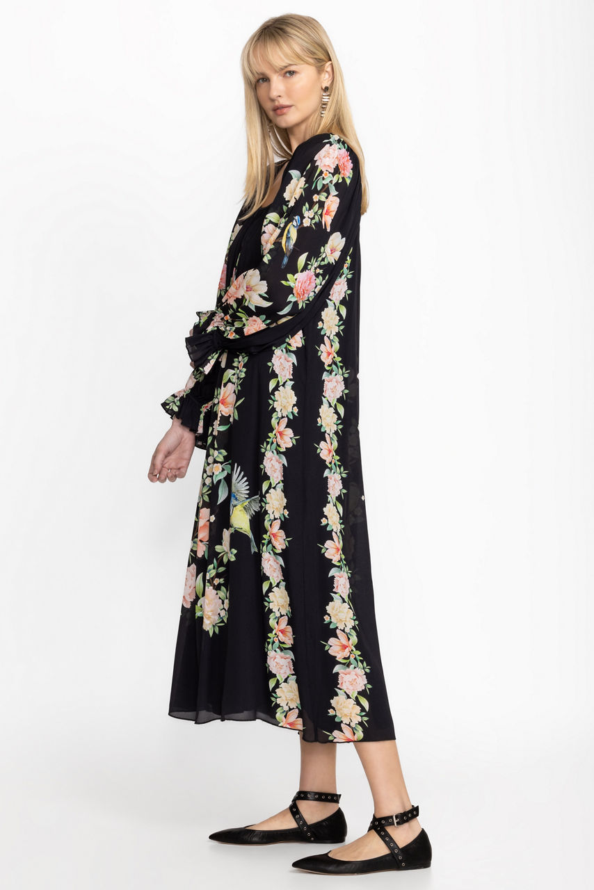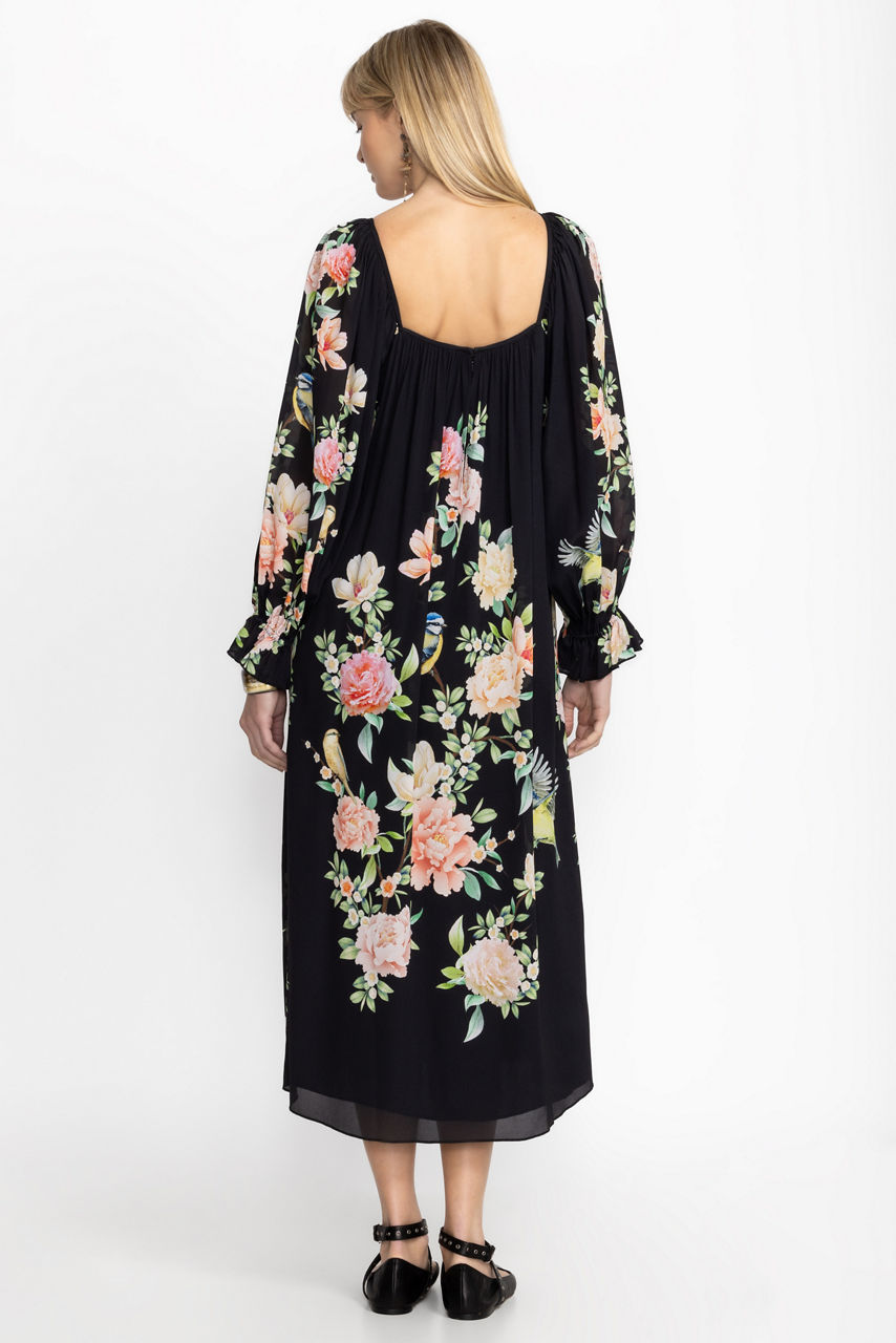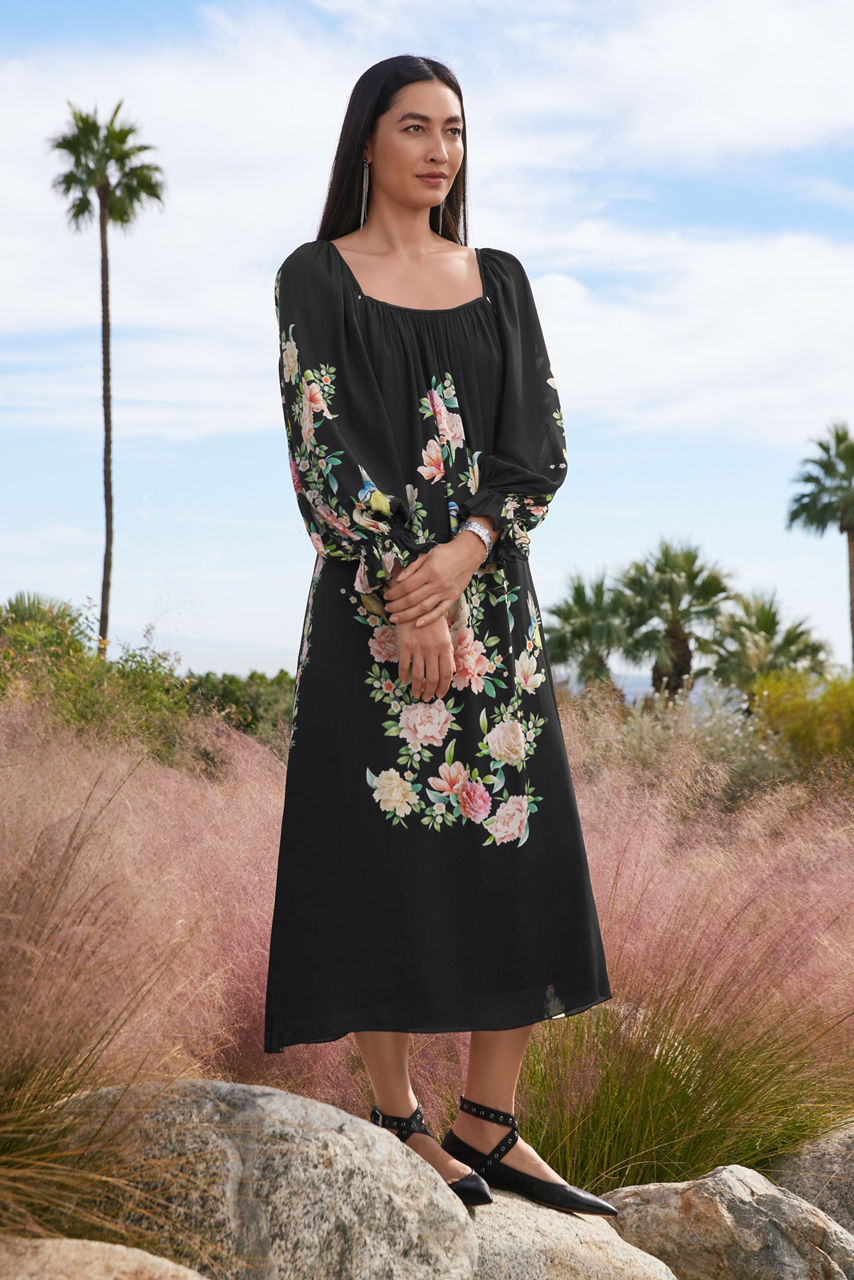 Distinctly feminine, the Byrdie Viscose Tea Length Dress offers a flowing silhouette with captivating visual details. Featuring an open square neckline and gently puffed sleeves with elastic cuffs, this tea length dress illustrates an enchanting natural scene with vibrant blooms. Pair with wedge espadrille and a woven handbag for an unforgettable look.