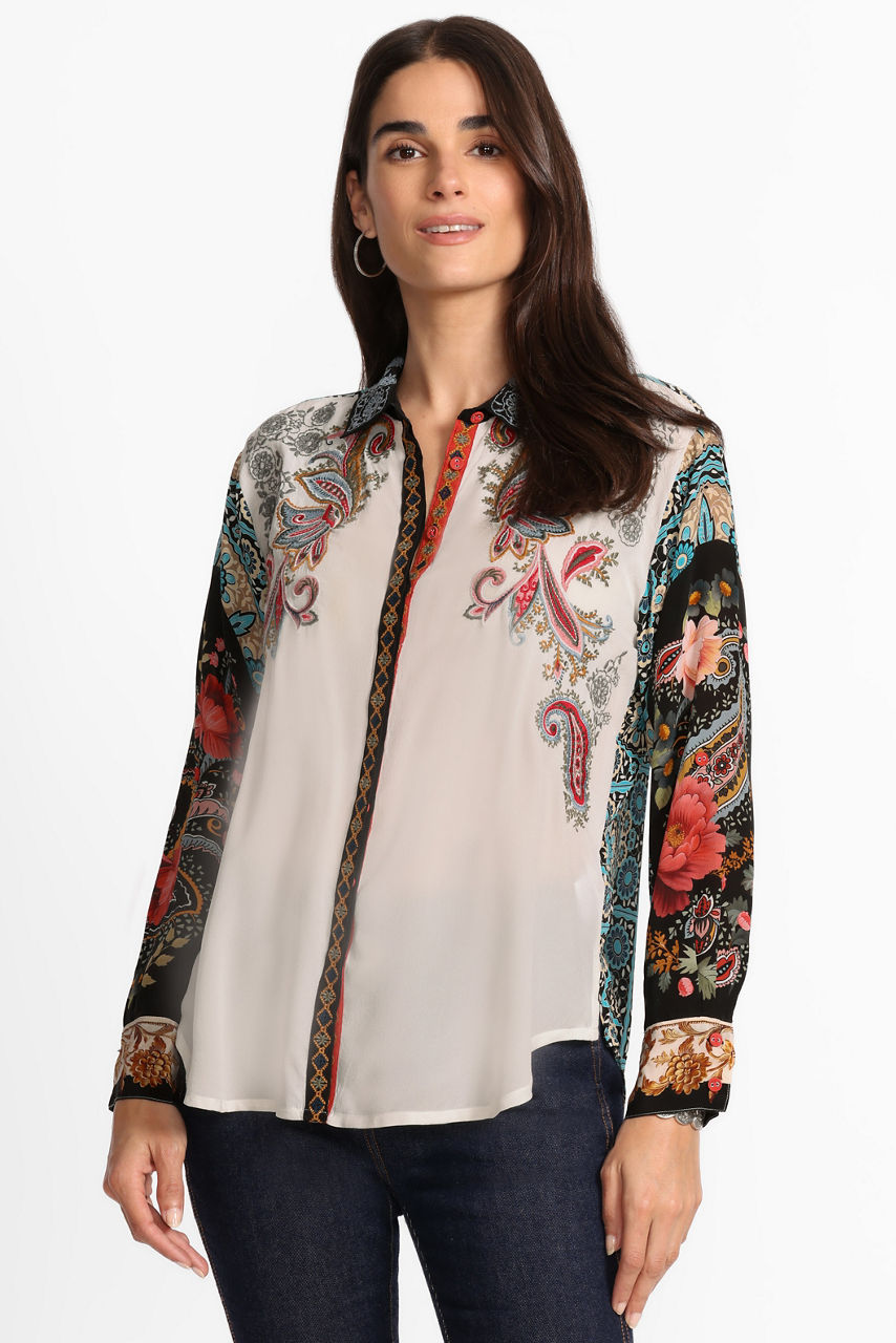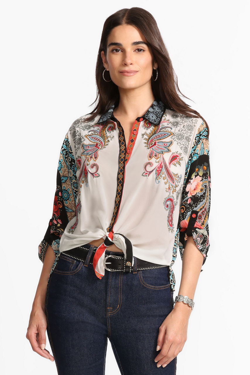 Crafted from rich 100% silk, the Cachemire Shirt is enriched with bold patterns and ornate embellishments. Designed as a classic collared button-front, this unique shirt features blocks of color and intricate embroidered detailing and is finished with fabric-covered buttons for an elevated feel. Pair with classic trousers and loafers for a dinner out with friends.
