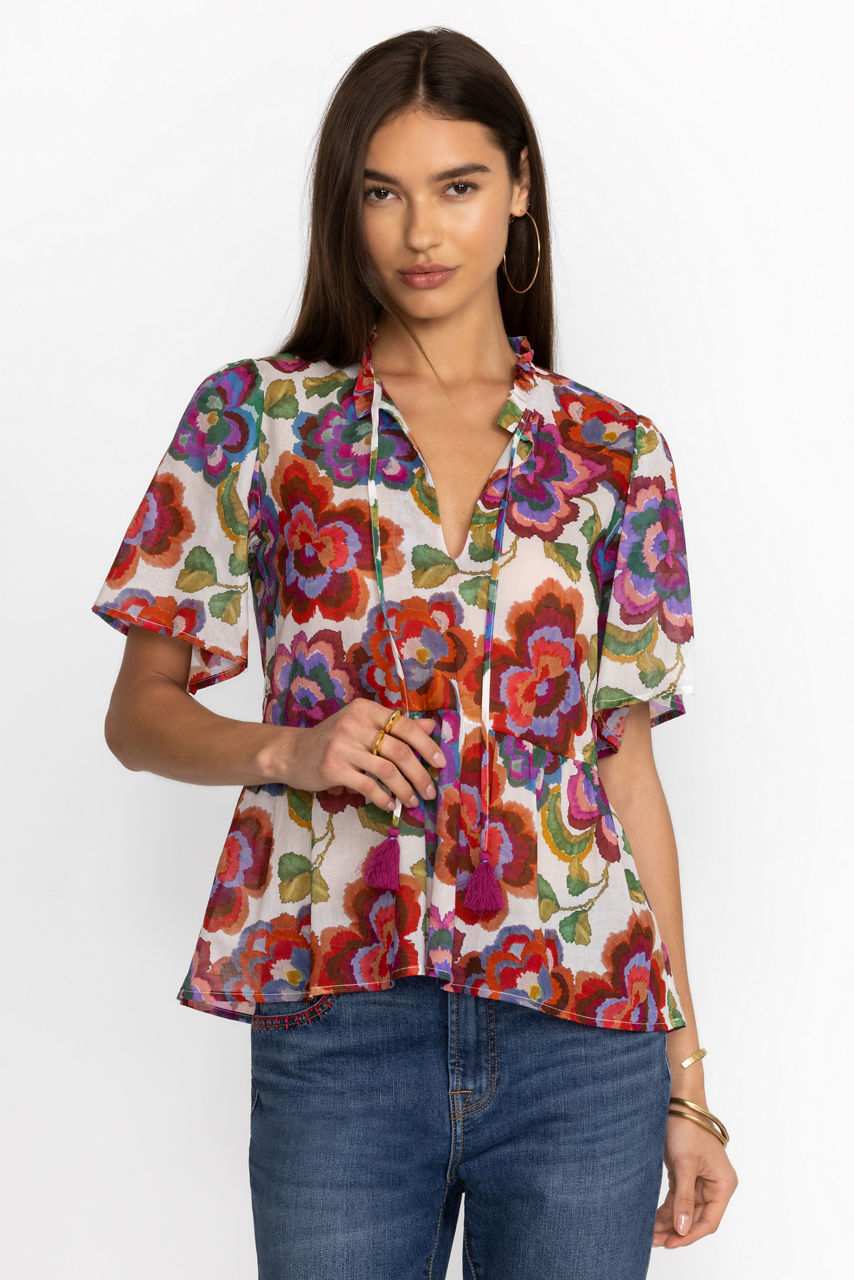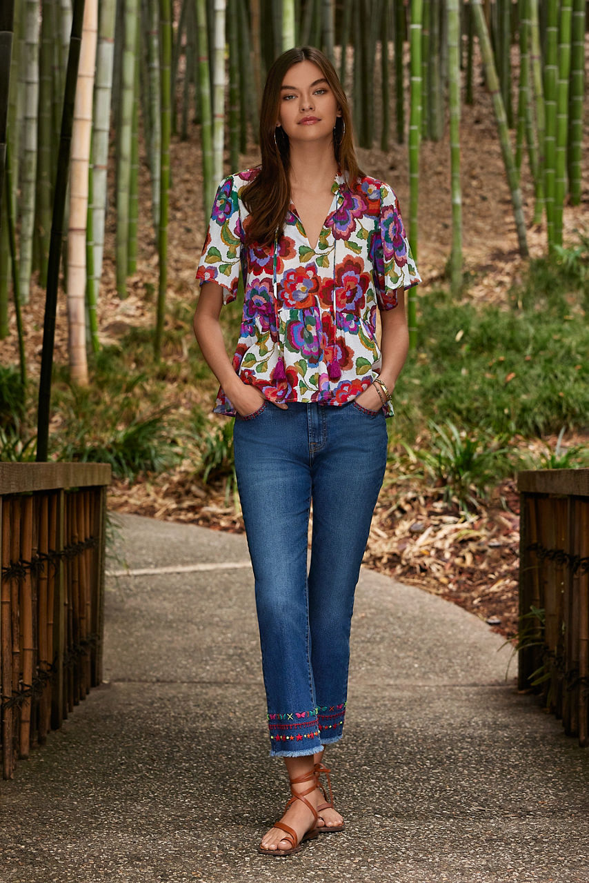 Adorned with bold floral accents, the Calanthe High-Low Empire Waist Top offers a relaxed fit in a fresh silhouette. Crafted from 100% Cotton, this blouse features a notched neckline with a delicate tie and is finished with flutter sleeves and an empire waist. Pair with black denim and bold flats for a vibrant weekend look.