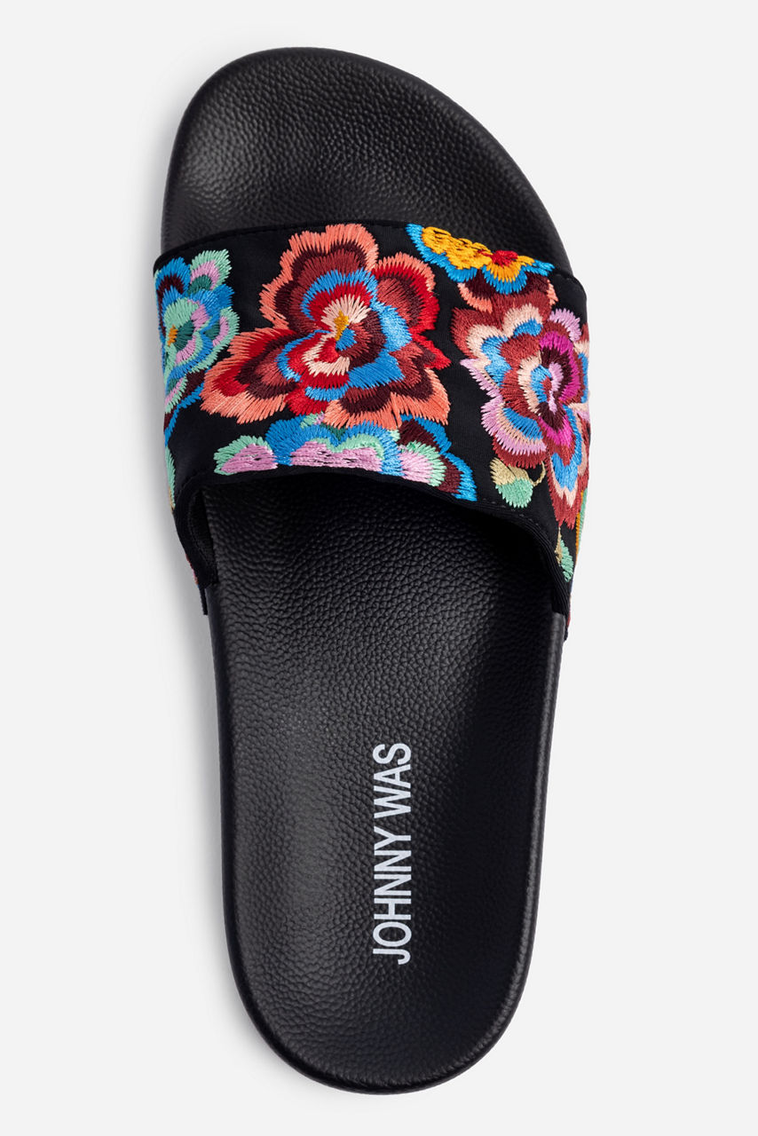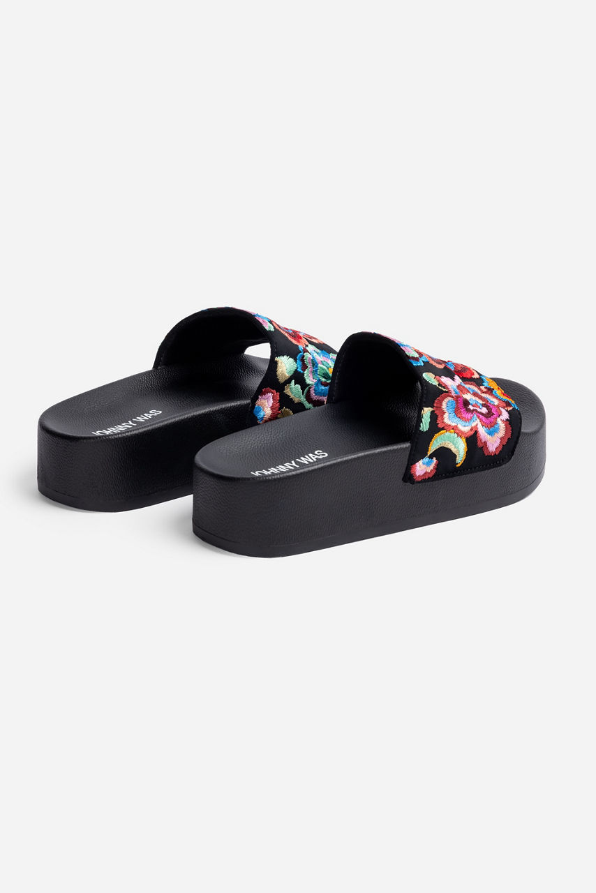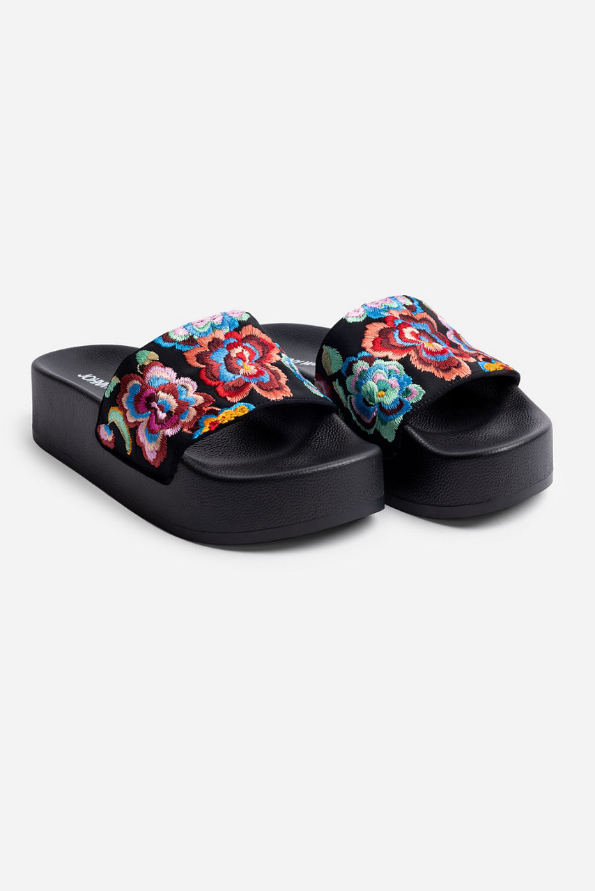 Presenting a polished poolside look, the Calanthe Platform Slides perfectly combine style and functionality. Featuring a wide band across the top for extra comfort, this platform slide is bathed in colorful floral bouquets for a bit of visual interest. Pair with your favorite bold swimwear and a black linen swim cover up for a glamorous resort look.