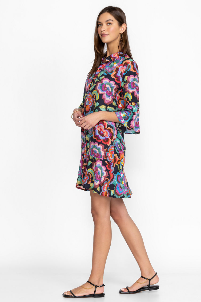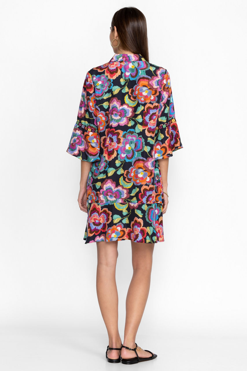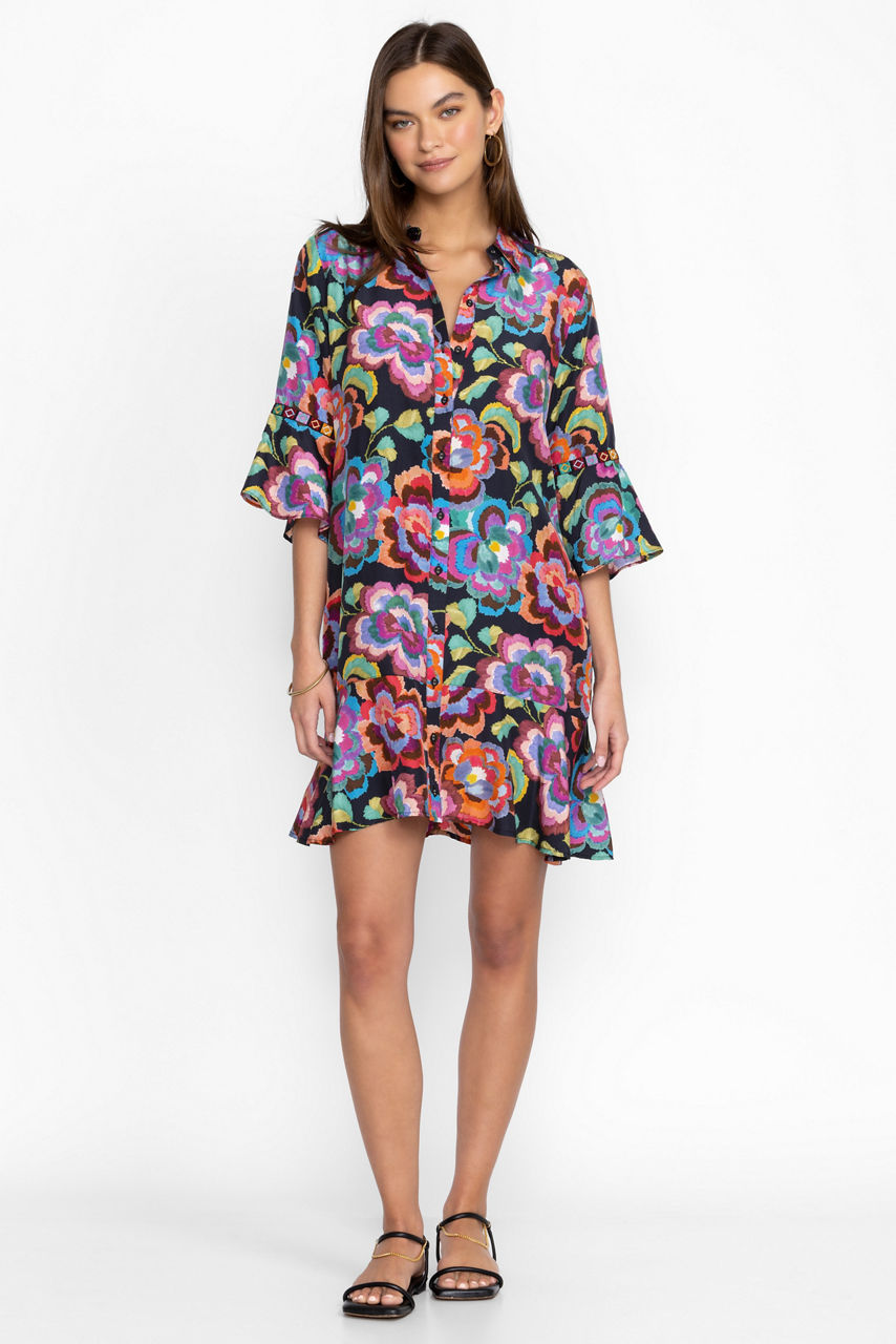 A bold statement, the Calanthe Tiered Flounce Dress adds a bright shot of color to your warm-weather repertoire. Harmoniously balancing a feminine bouquet of florals with a psychedelic mood, this flounce dress is spun from lustrous silk and boasts a classic collar, a button closure, saturated flowers, and flounce edges for a playful finish. Wear with flat sandals for a joyful daytime ensemble.