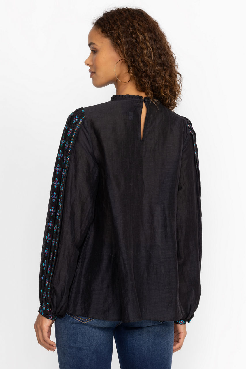 Offering up a stylish workwear option, the Calico Blouse provides a visually mesmerizing pattern. Crafted from a luxurious linen blend fabric, this lovely blouse offers a delicate keyhole closure at the back as well as intricate placement embroidery in a variety of eye-catching colors. Pair with a classic black pencil skirt for a polished work look.
