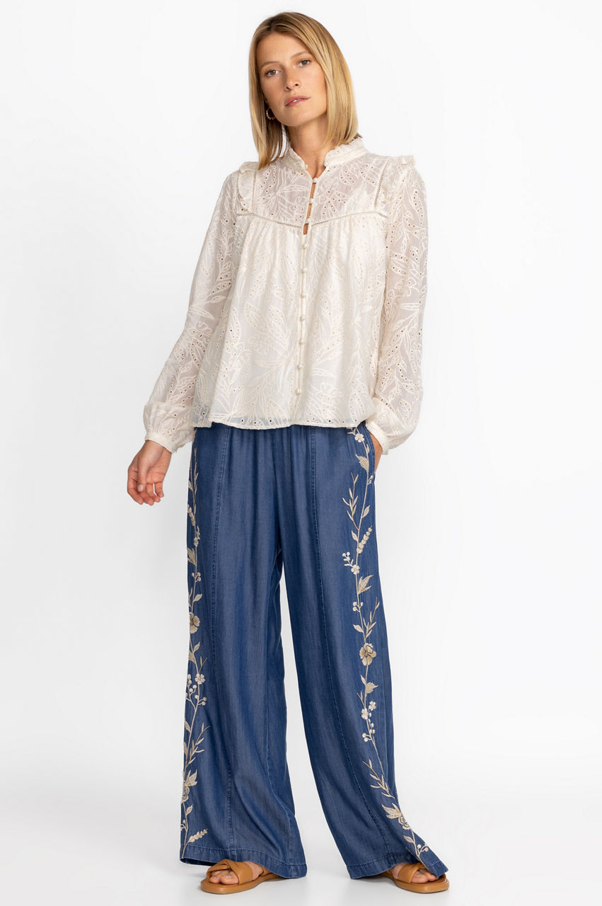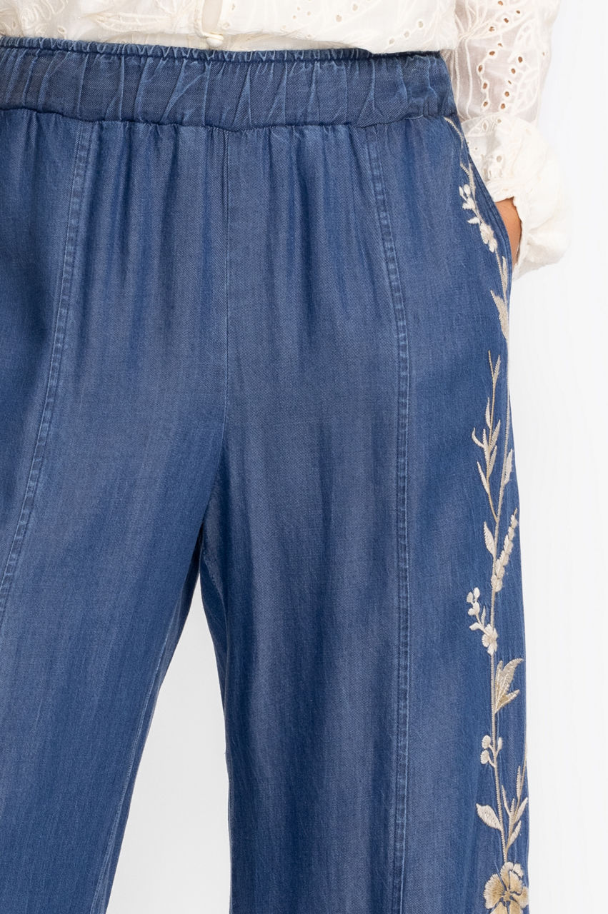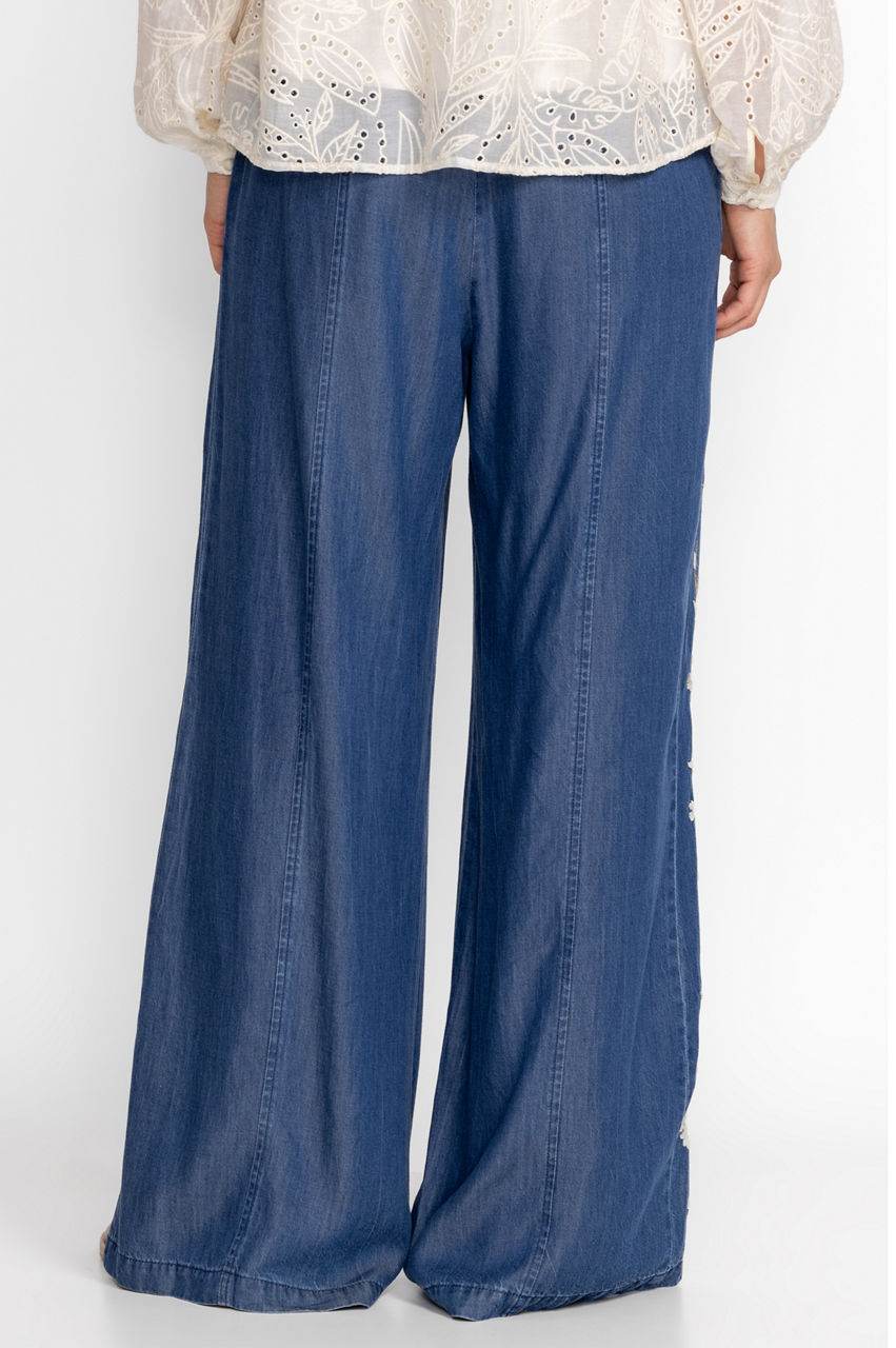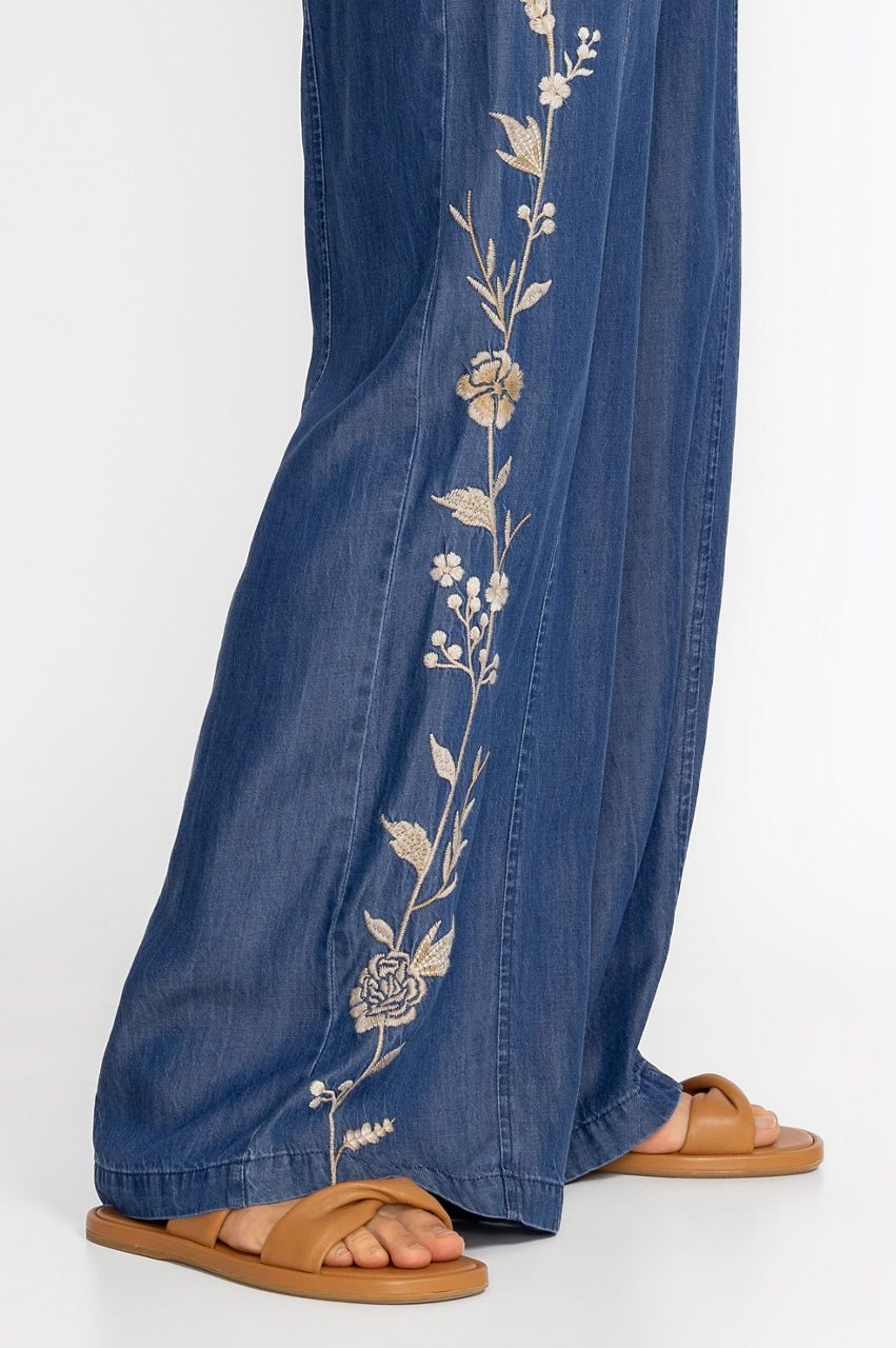 Upgrade your denim collection with the Calipso Seamed Wide Leg Pant for a fresh take on relaxed legwear. Crafted from a soft and stretchy denim fabric and emblazoned with a border of eye-catching embroidery, these pants feature an elastic waist and wide legs for a dramatic flair. Pair with a silk blouse and ankle boots to complete the look.