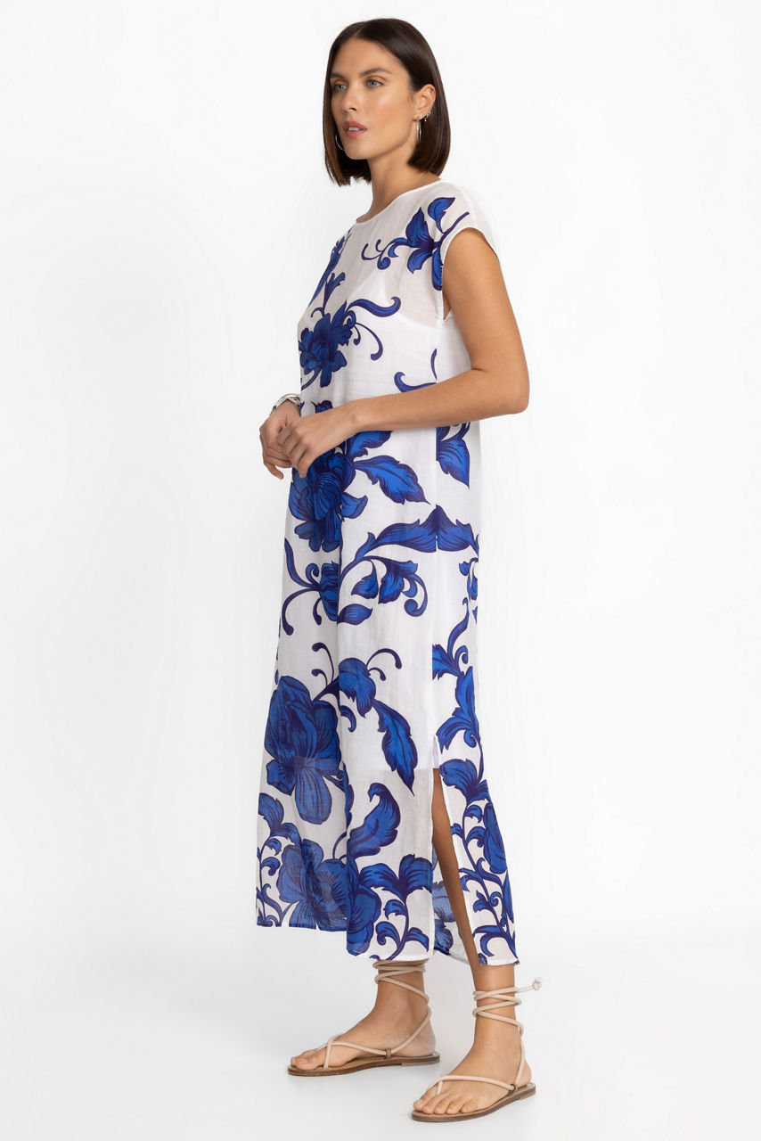 Beautifully adorned with rich blue hues, the Camilla Side Slit Dress is elevated casual wear crafted from a lightweight material. Featuring a classic crew neckline and short sleeves, this maxi dress is embellished with a brilliant and bold floral pattern. Pair with crisp white sneakers and a cross-body bag for a day of sightseeing.