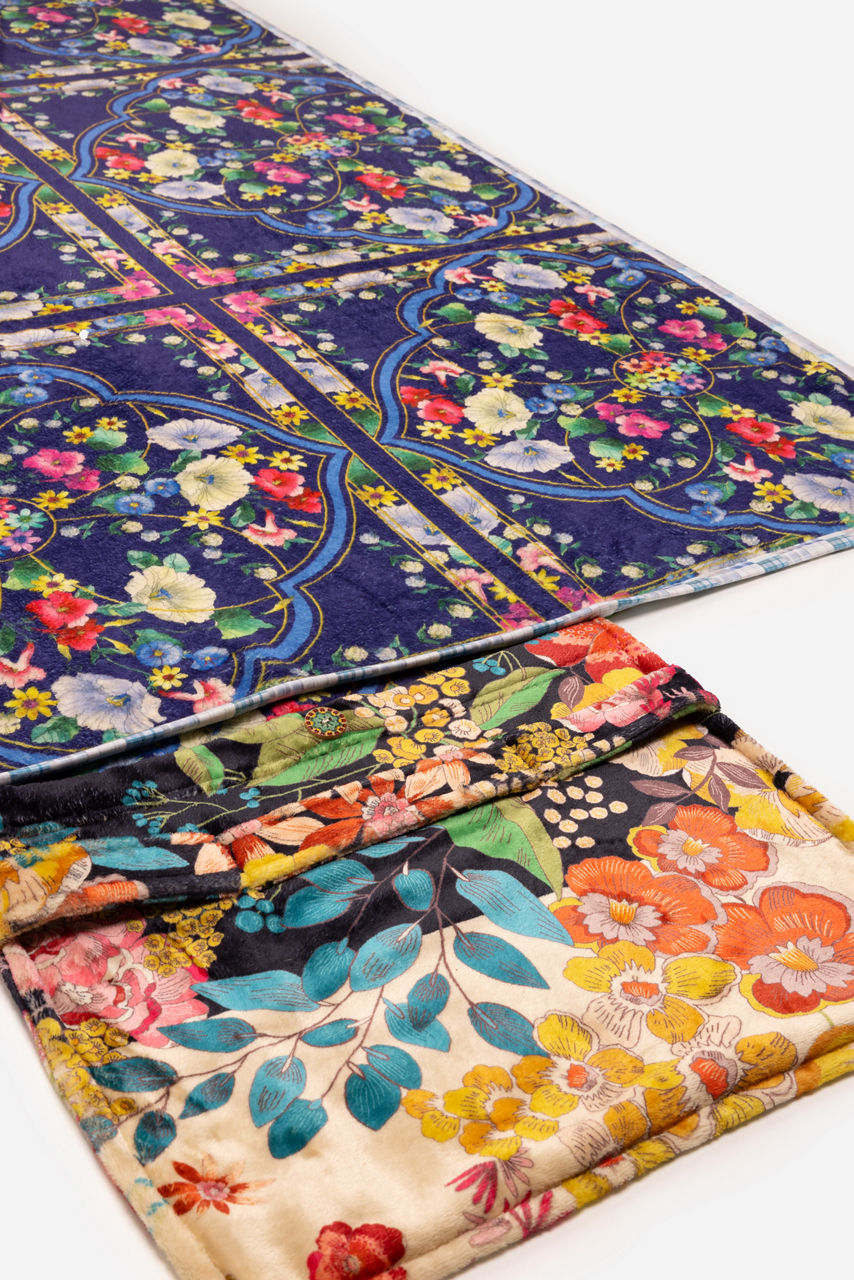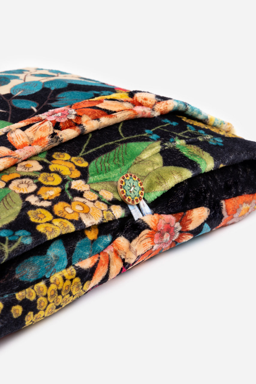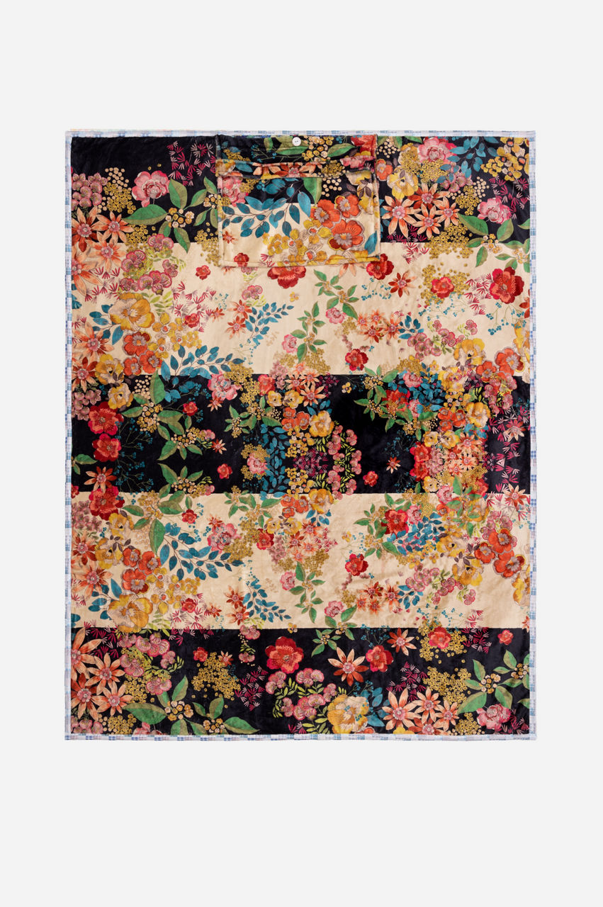 Made from a soft material, the Camilla Travel Blanket represents an artistic flair and attention to detail. A stylish travel companion, this blanket is characterized by an eye-catching floral pattern that stands out against a white and black block background. Complete with an additional blue and white floral print on the reverse side, this travel blanket folds into its own pouch and is perfect for both long-haul trips and restful evenings at home.