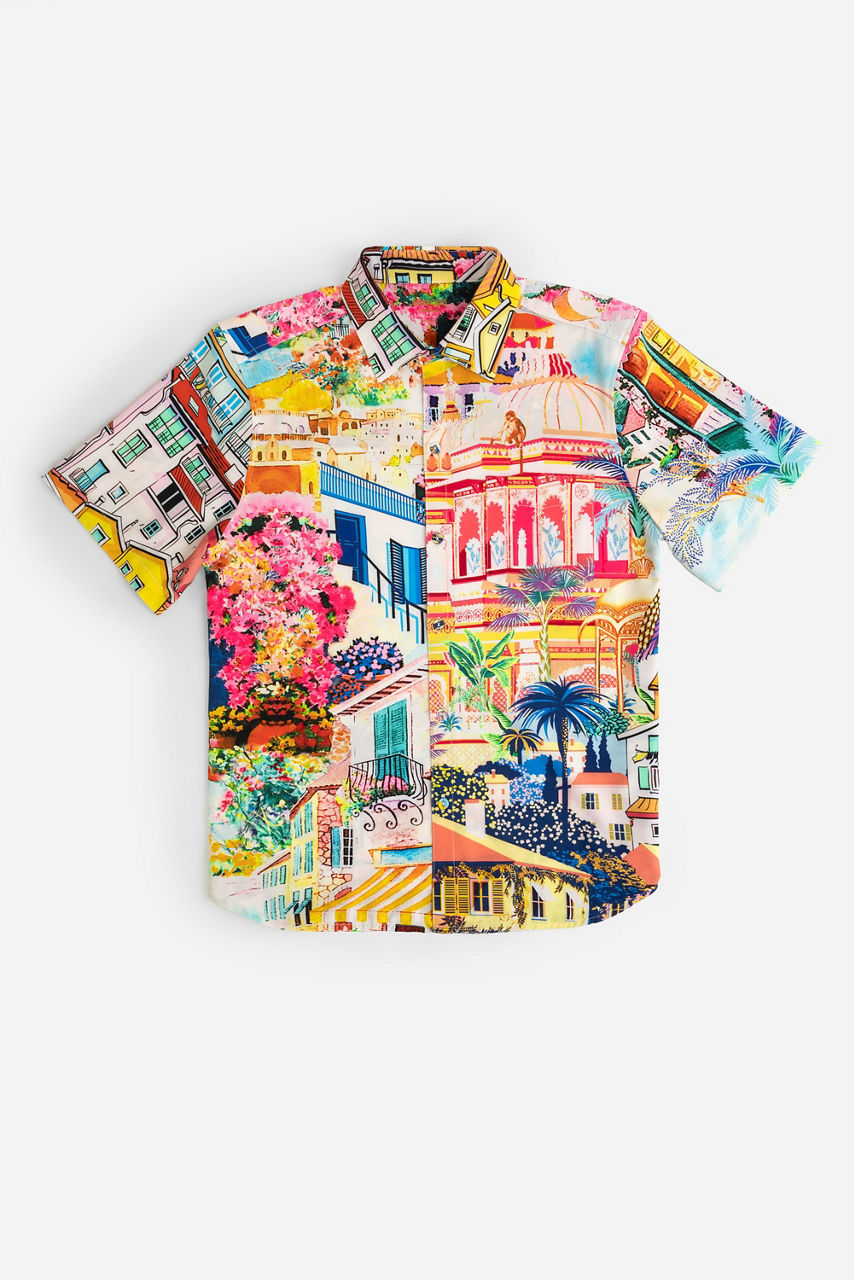 Adorned with a colorful artist's rendering depicting life in the French Riviera, the Cannes Men's Cover Up Shirt is equal parts stylish and functional. Featuring a classic collared button-front, this bold shirt is crafted with a hint of stretch and is finished with a curved hemline and a front patch pocket. Pair with the Cannes Men's Short Swim Trunks for a resort-ready poolside look.