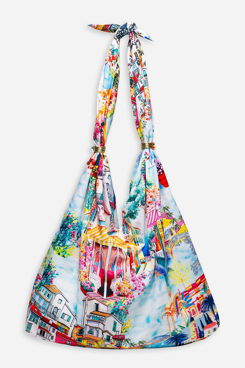 Embellished with an artist's rendering of vibrant life in the French Riviera, the Cannes Ring Beach Bag Is the perfect vacation accessory. Featuring a faux knot at the apex of the handle and decorative rings adorning each side of the straps, this fully lined bag is finished with a magnetic top closure and an interior pocket. Pair with Cannes swimwear and pool slides for a perfectly coordinated vacation-worthy look.