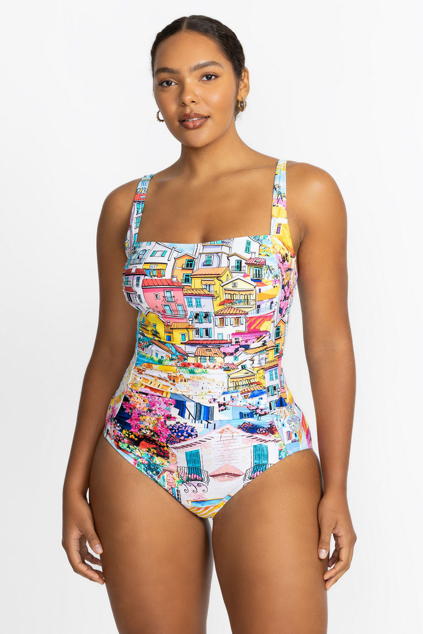 The Cannes Ruched One Piece is expertly embellished with an artist's rendering of vibrant life in the French Riviera. Featuring bold color and a dramatic square neckline, this suit offers a ruched front panel and adjustable straps along with smooth side panels for an enhanced silhouette. Pair with the Cannes Pool Slides and a white linen button-down for a sophisticated poolside ensemble.