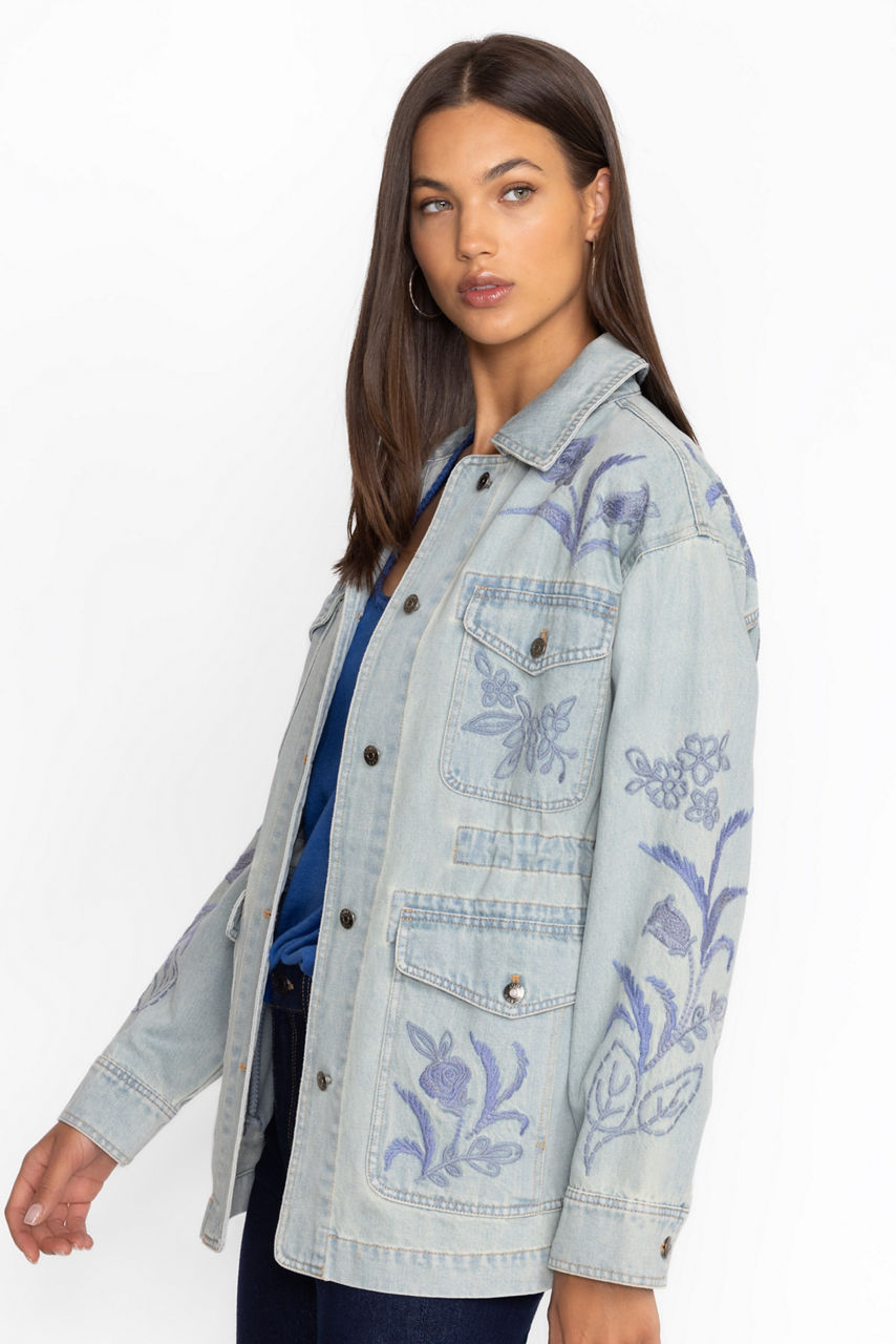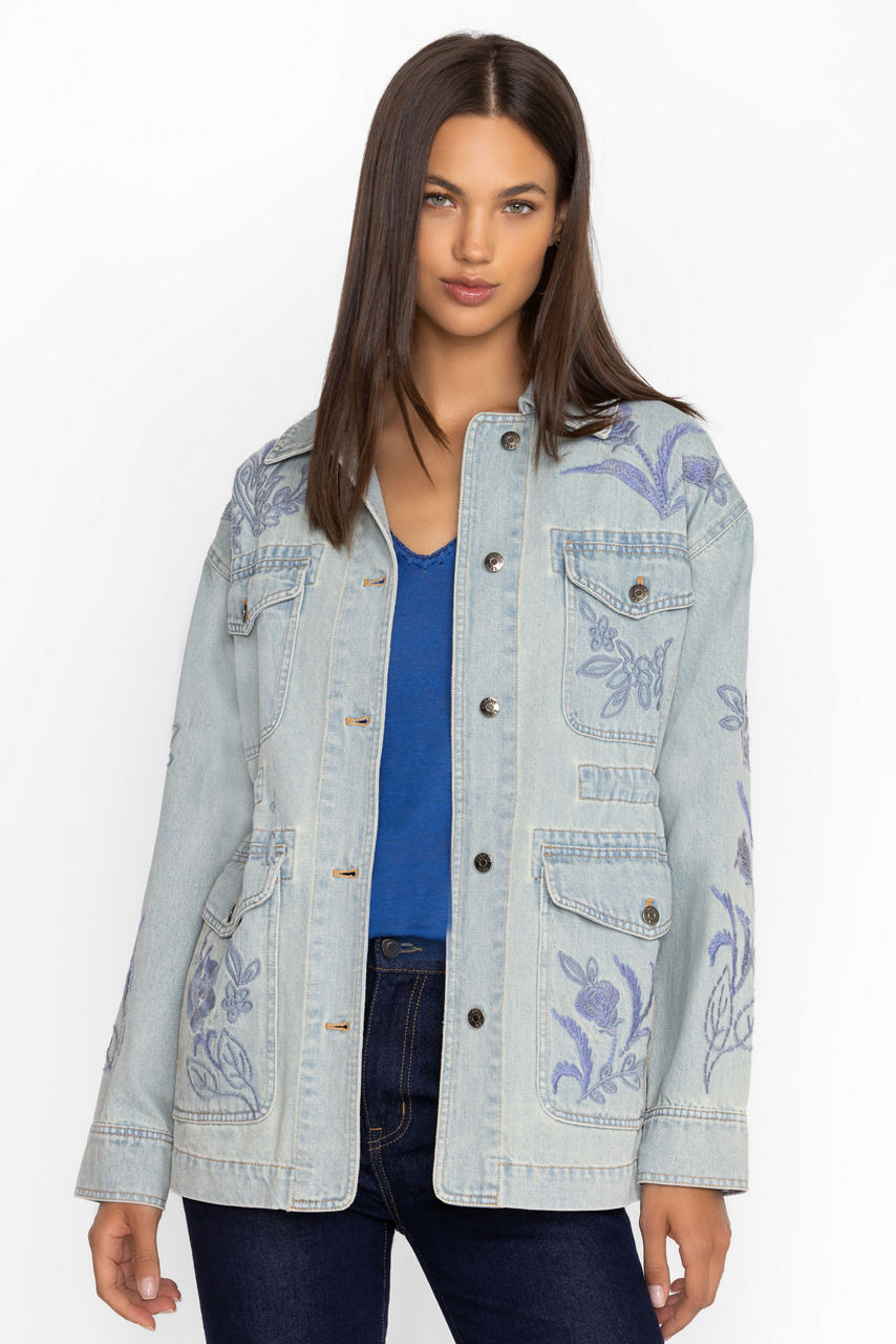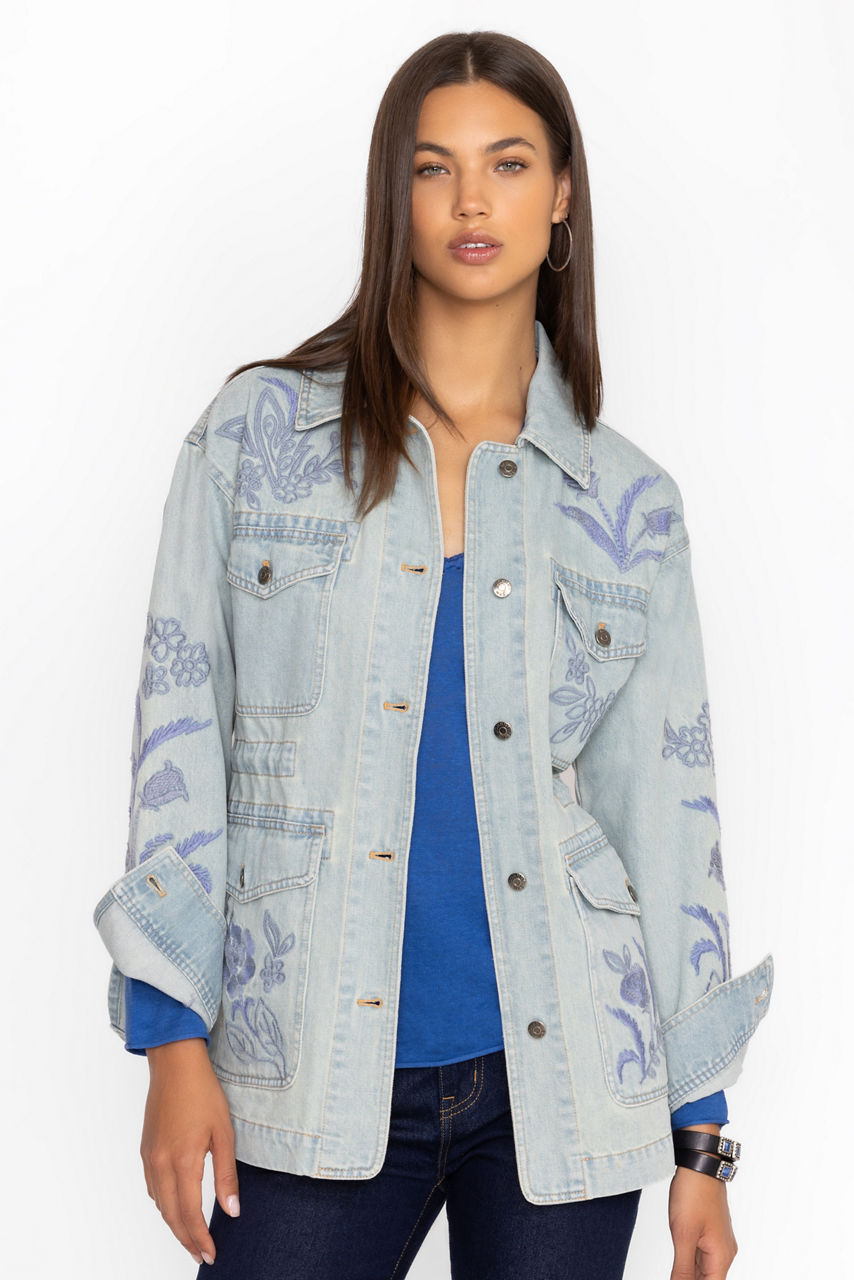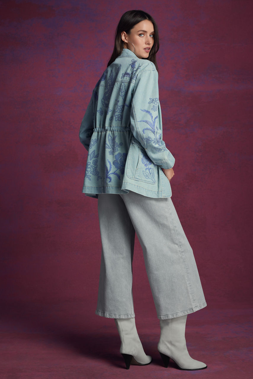 Crafted from 100% cotton denim, the Myra Cargo Denim Jacket is embroidered with intricate tone-on-tone floral embellishments. Featuring a collared neckline and four front cargo pockets, this jacket offers a drawstring at the waist for a customizable fit. Layer over a bright button-down and pair with classic trousers for a polished casual ensemble.