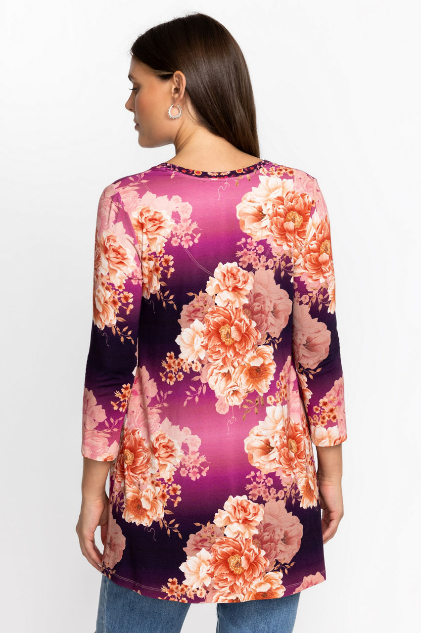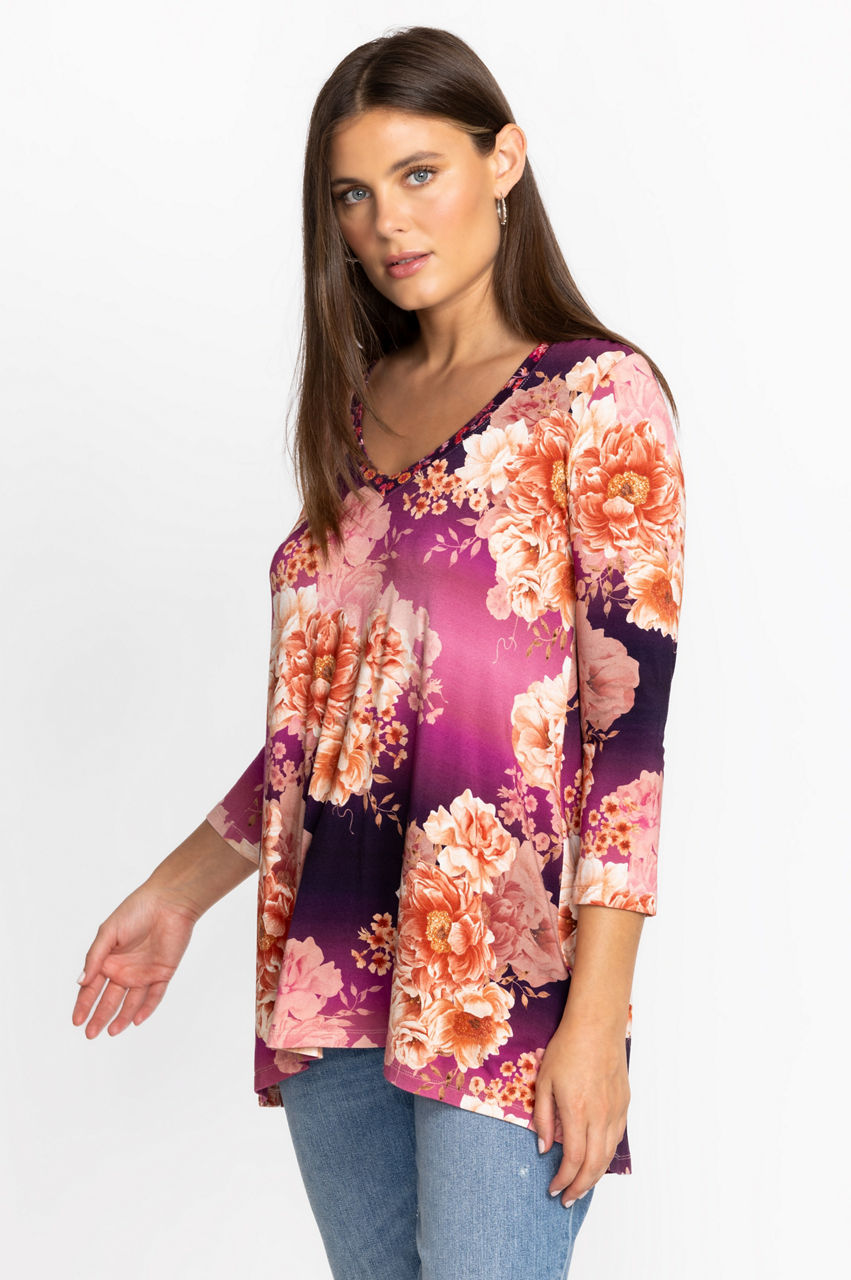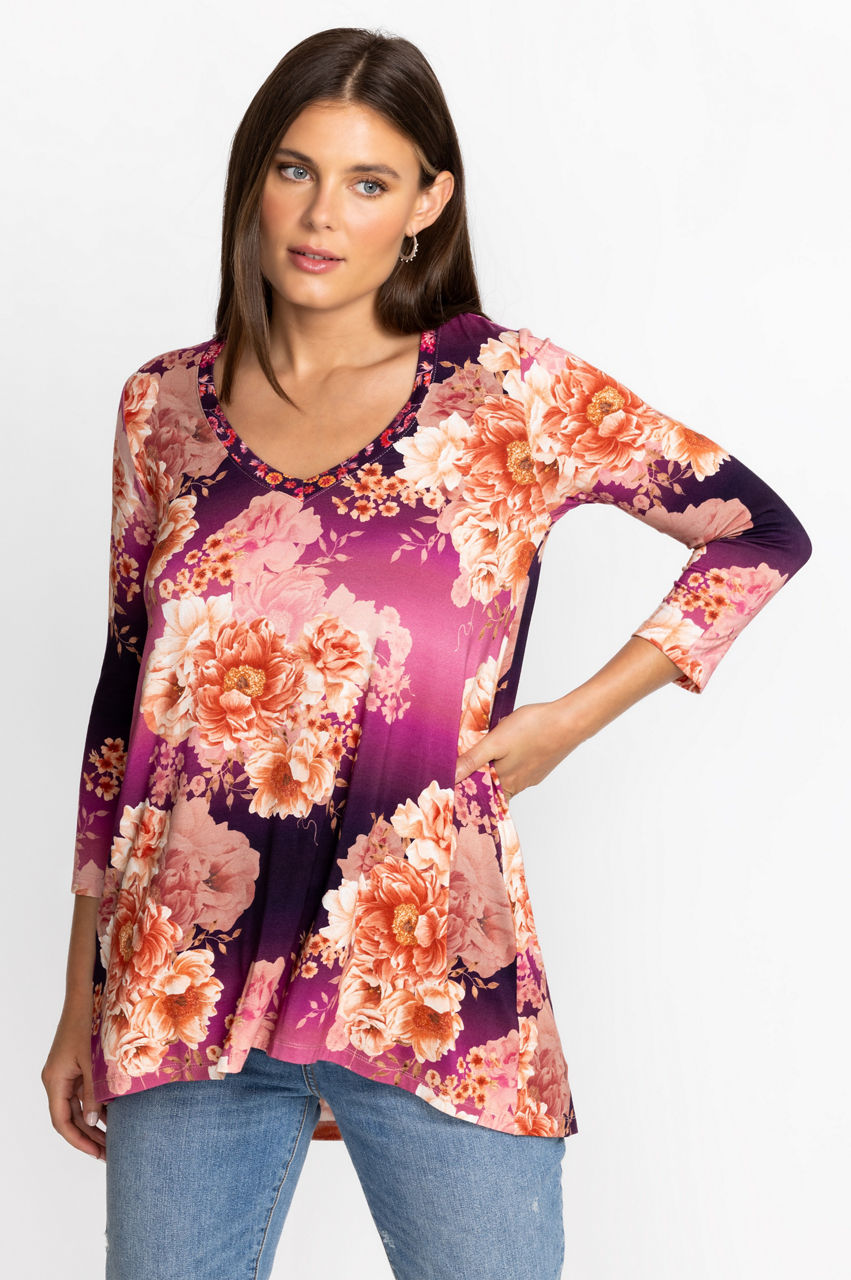 A flower-dotted must-have, the Carina V-Neck Swing Tunic takes your new season wardrobe in a colorful direction. Designed from breathable bamboo with added stretch for comfort, this tunic features a V-neck, long sleeves, and a slight flare at the hem. Layer over jeans or neutral linen pants for an upbeat wear-anywhere look.