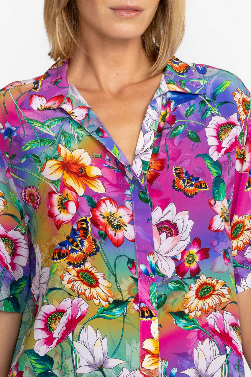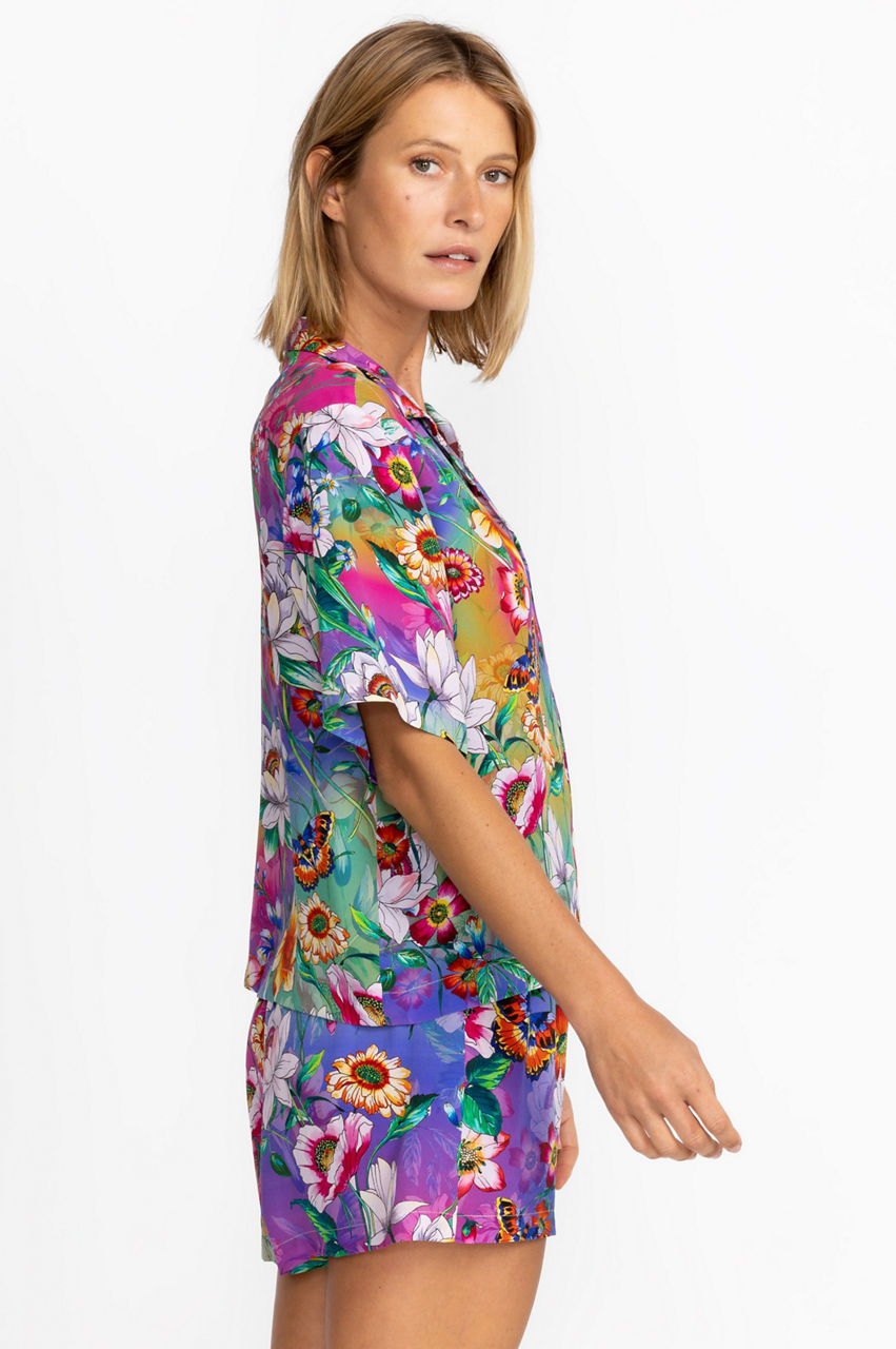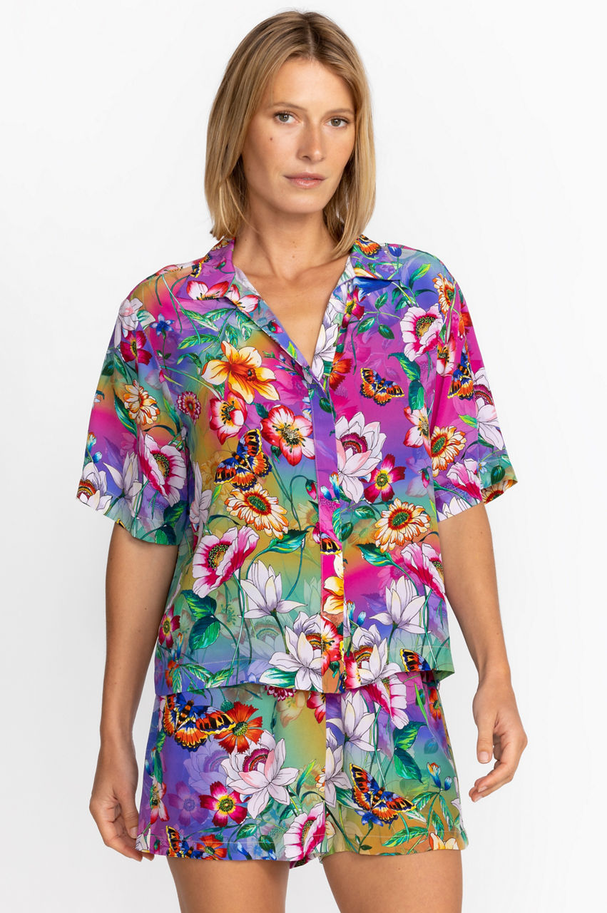 Sleep comfortably through warm or balmy nights in the Carolyn Short Set. Crafted from 100% silk and accented with vibrant color and fresh floral bouquets, this pajama set offers comfortable shorts paired with a generous cut button-front top detailed with shell buttons. Pair with the Everlyn Robe and cozy slippers for an evening in.
