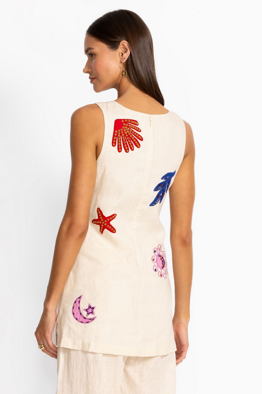 Intricately embroidered with vibrant island iconography, the Cassady Tank is crafted from 100% breathable linen. Designed with a boat neckline with an invisible zipper at the back, this sleeveless top is accented with dazzling beads and finished with side slits for a relaxed fit. Pair with linen shorts and espadrille wedges for a casual getaway look.
