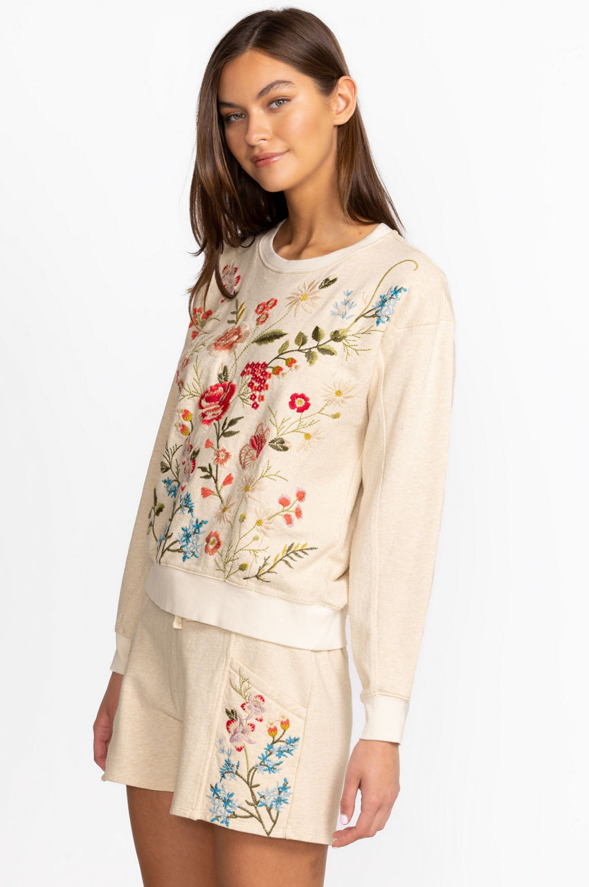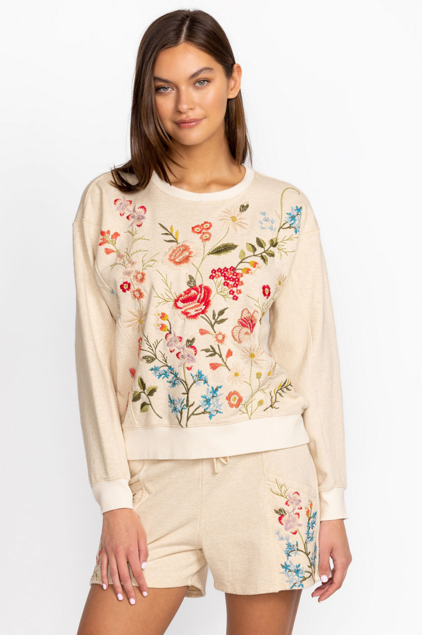 Crafted from pure French terry cotton, the Catalina Contrast French Terry Sweatshirt is a luxe take on a downtime favorite. Perfect for those off-duty moments, this sweatshirt boasts a round neck, long sleeves, ribbed edges, and a vibrant placement embroidery bursting with beautiful flowers. Pair with joggers or style with jeans for a versatile wear-anywhere look.