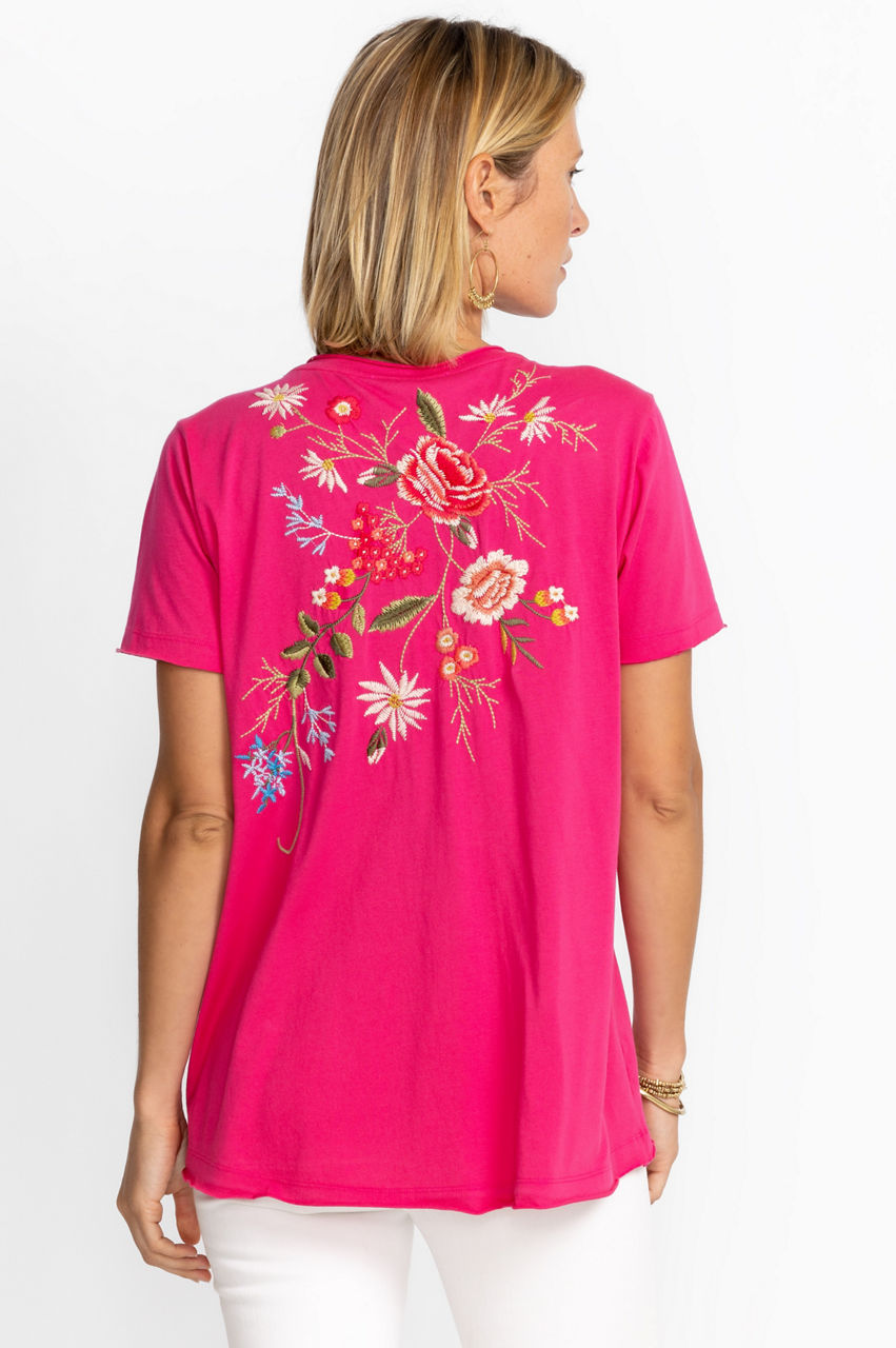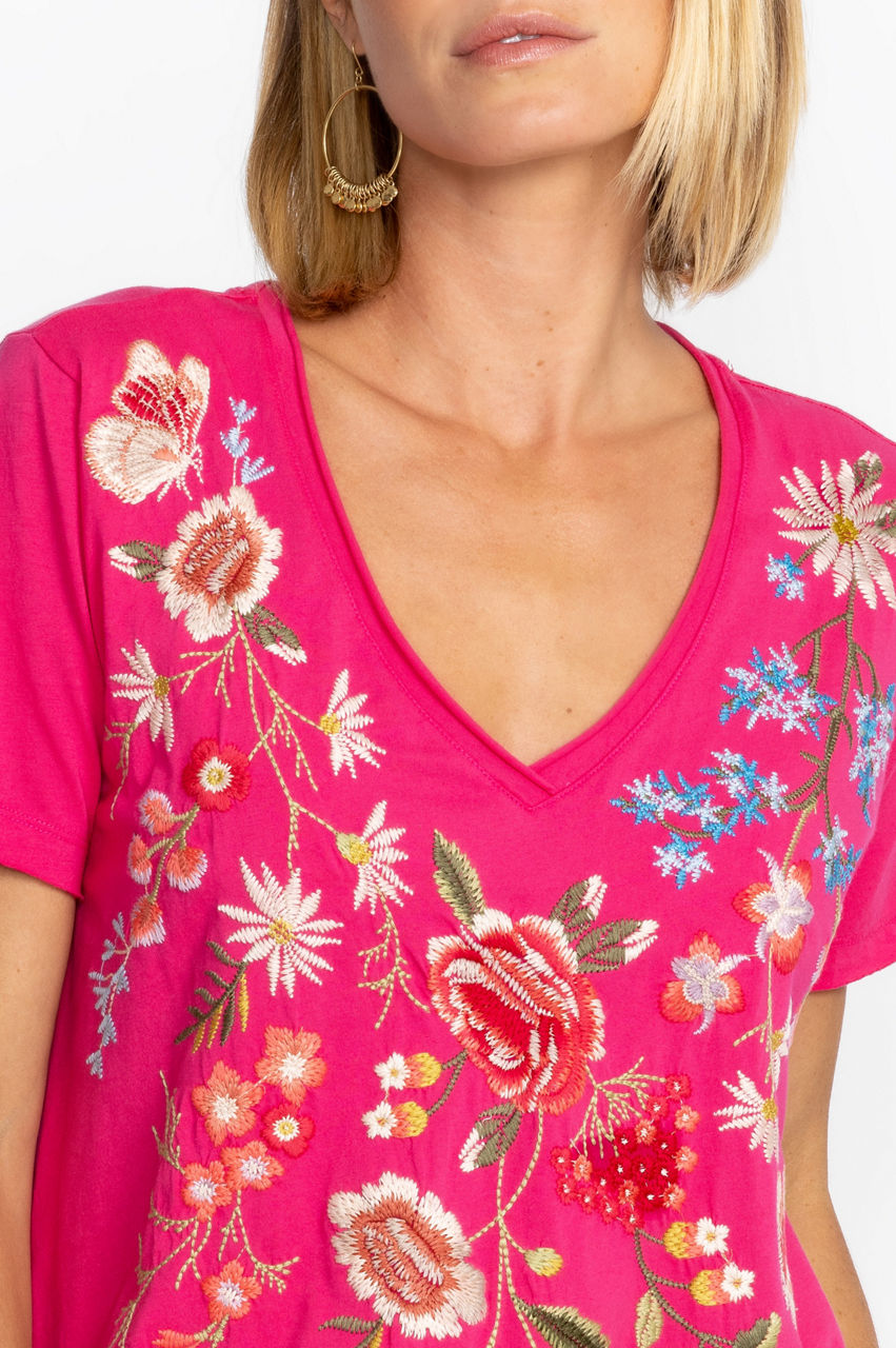 Simplicity and timeless elegance meet on the Catalina Everyday Tee. A versatile addition to your warm-weather closet, this tee features a V-neck, short sleeves, and an intricate placement embroidery comprising a bouquet of colorful flowers. Pair this tee with plain linen pieces and leather flats for a nonchalant daytime ensemble.