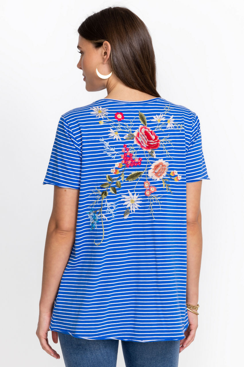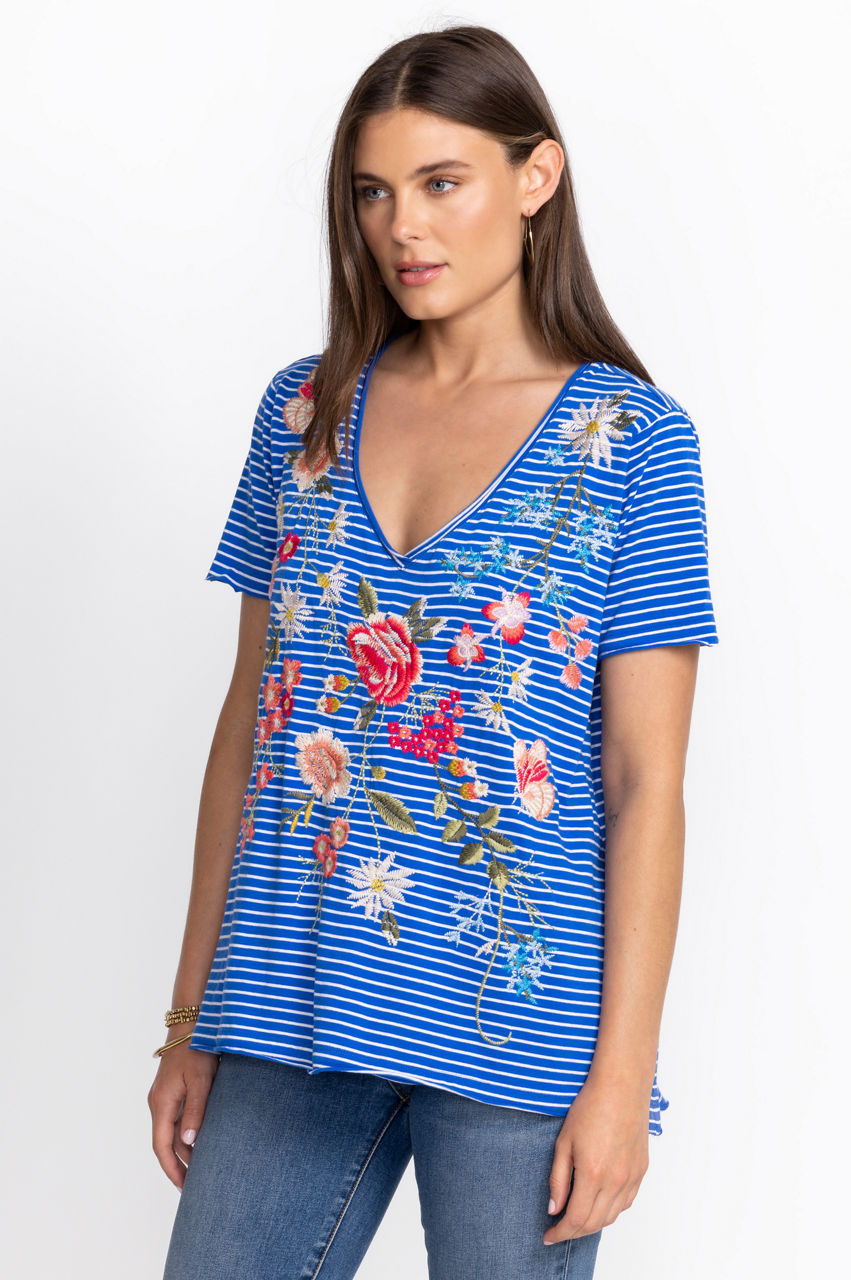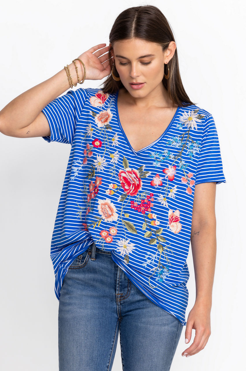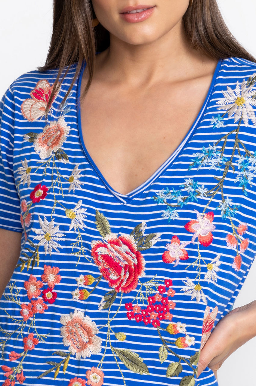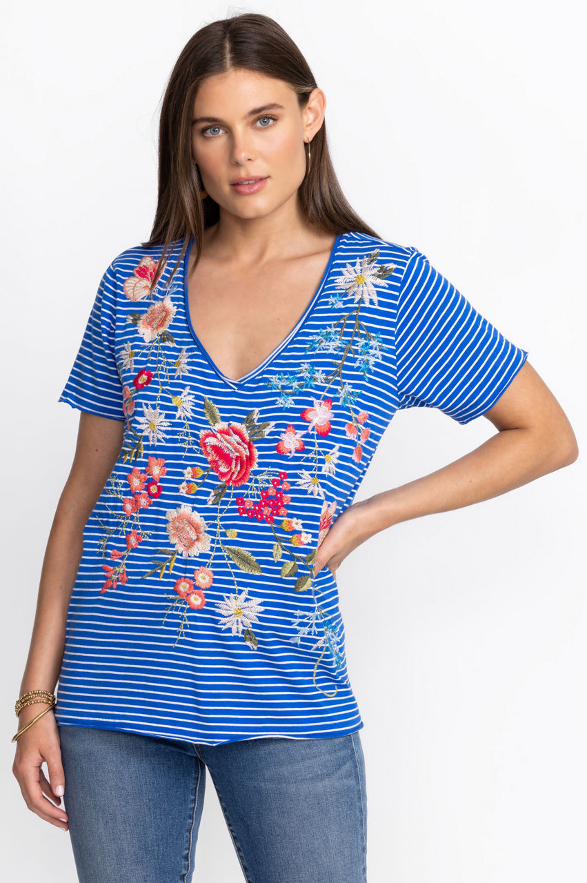 Simplicity and timeless elegance meet on the Catalina Everyday Tee. A versatile addition to your warm-weather closet, this tee features a V-neck, short sleeves, and an intricate placement embroidery comprising a bouquet of colorful flowers. Pair this tee with plain linen pieces and leather flats for a nonchalant daytime ensemble.