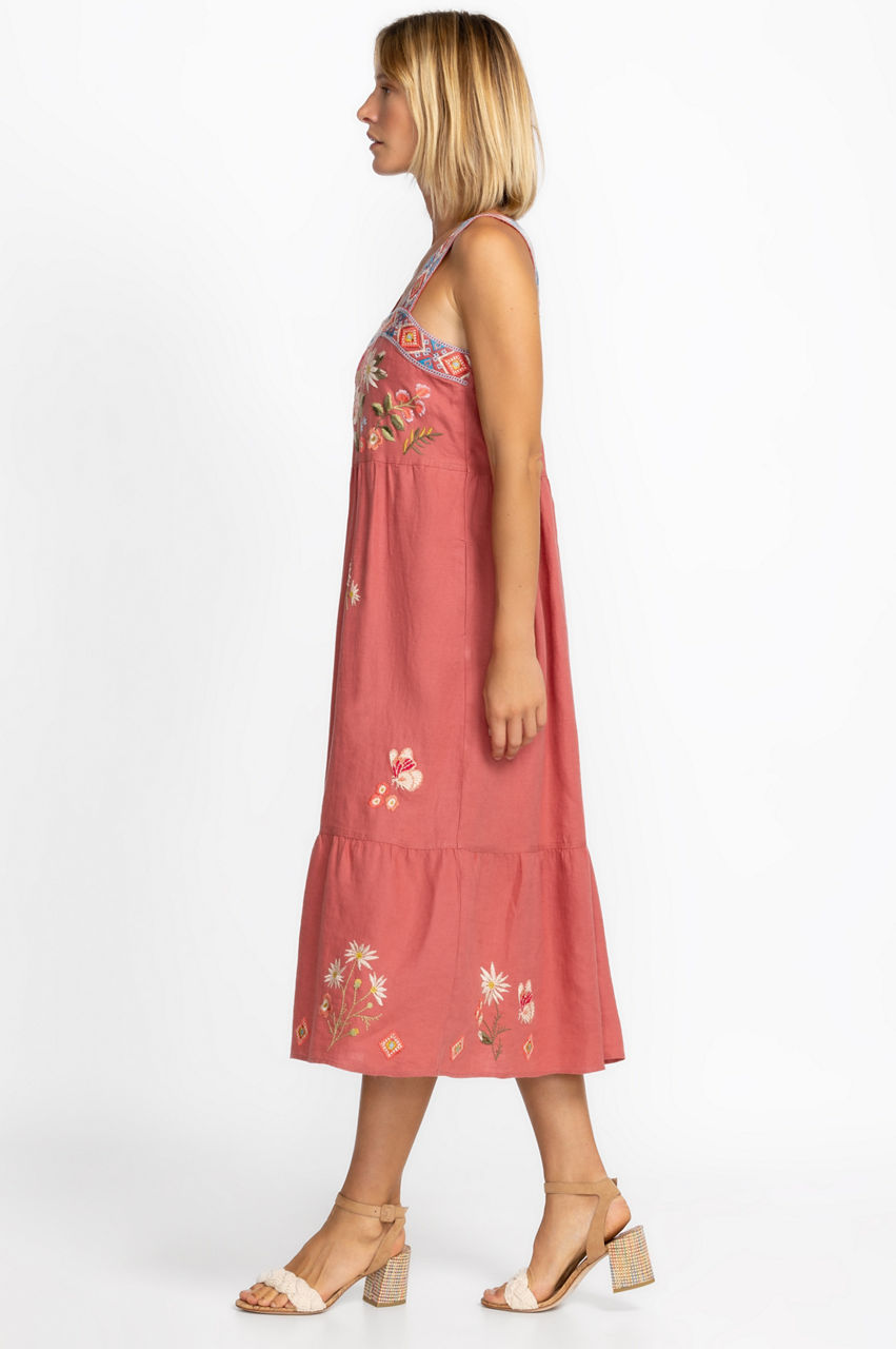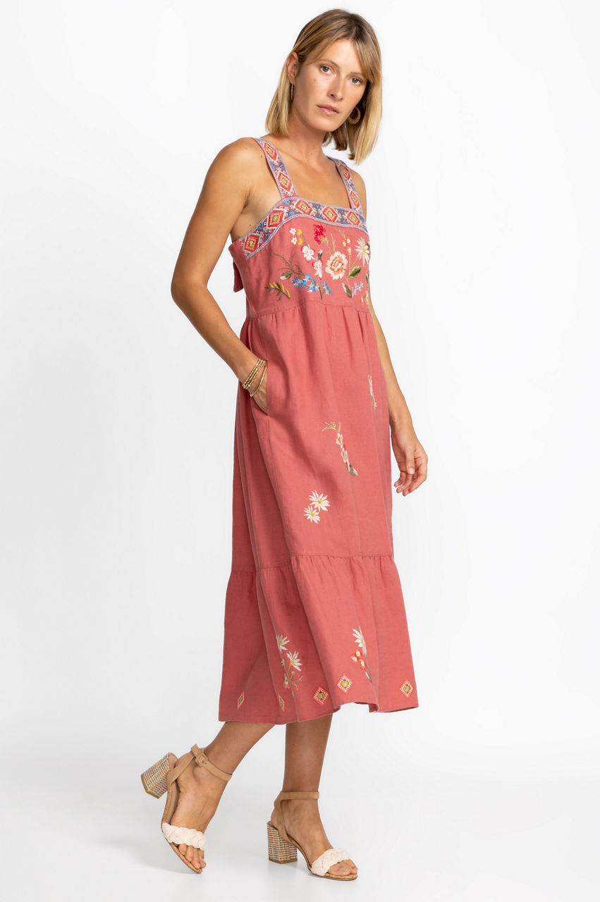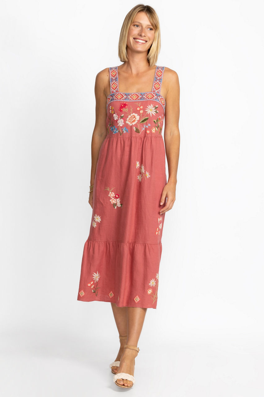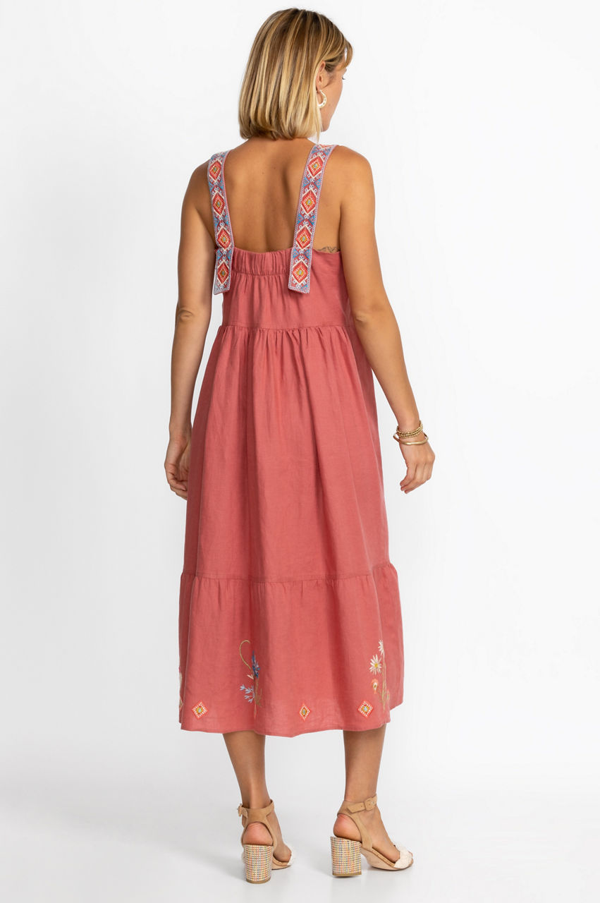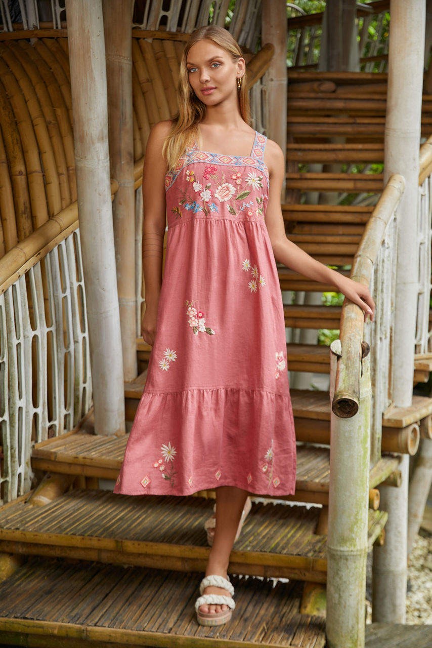 Underpinned with a feminine bohemian edge, the Catalina Square Neck Tank Dress is a subtle statement-making must-have for brighter days. This dress is crafted from pure linen and features a square neck, shoulder straps, a tiered construction, and a floral placement embroidery. Wear this dress with hoop earrings and leather extras to brunch with friends.