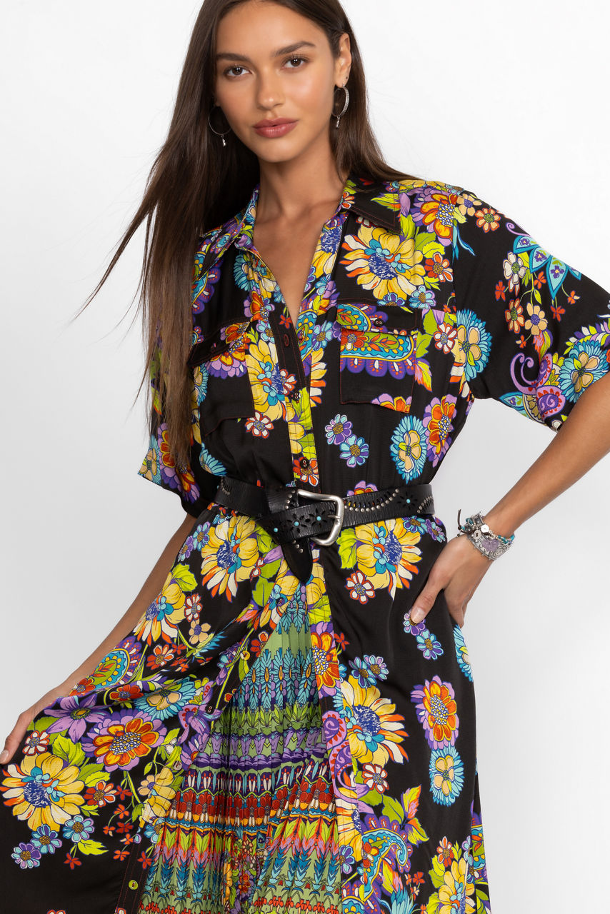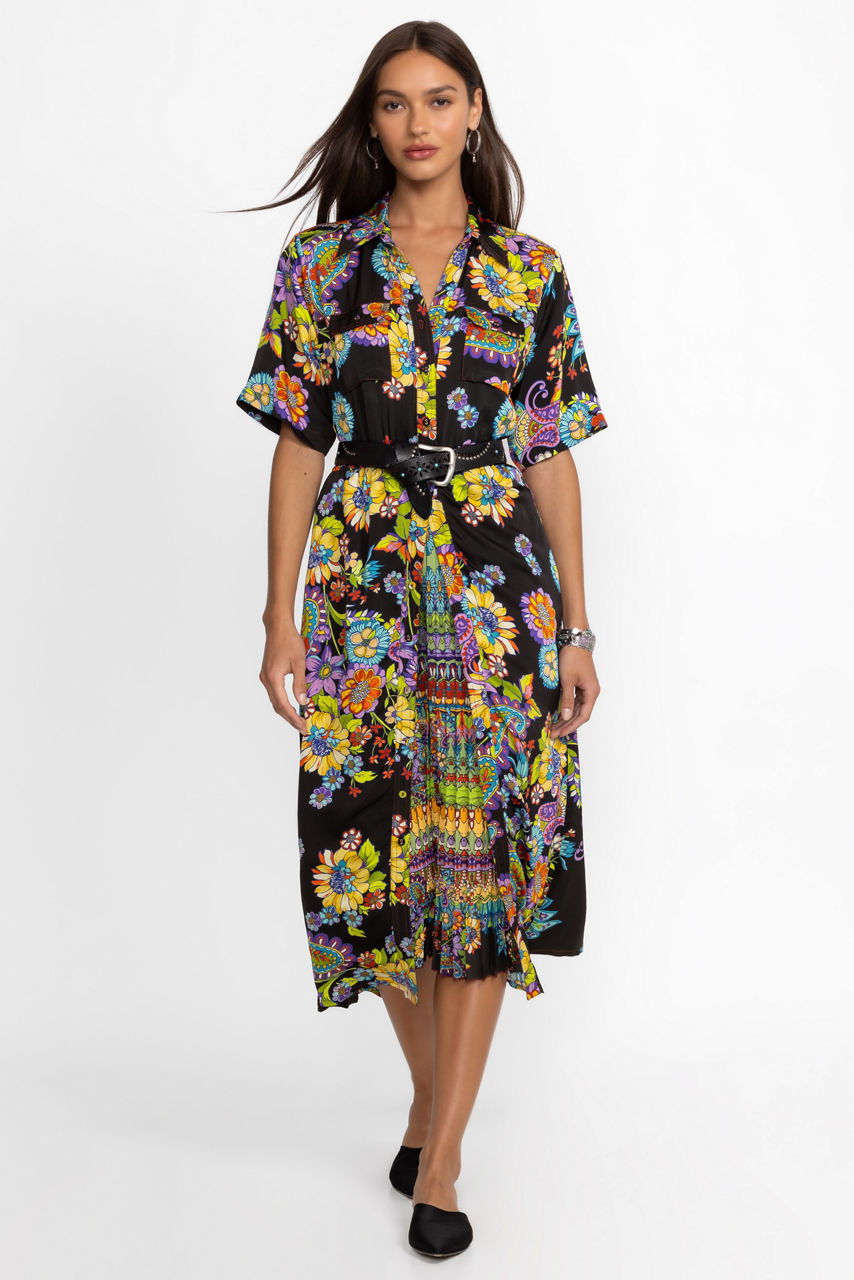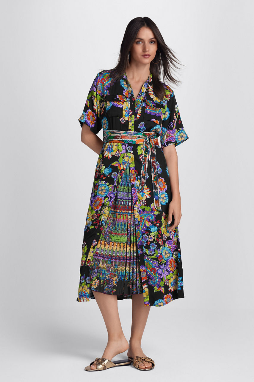 Offering a brilliant display of color and pattern, the Catriona Dress creates a stunning feminine fit-and-flare silhouette. Featuring an open neckline, short sleeves and intricate sunray pleating, this dress is embellished with a bold floral print met with a vibrant contrasting striped inlay for a visually refreshing look. Pair with strappy heels and bold accessories for an eye-catching look.