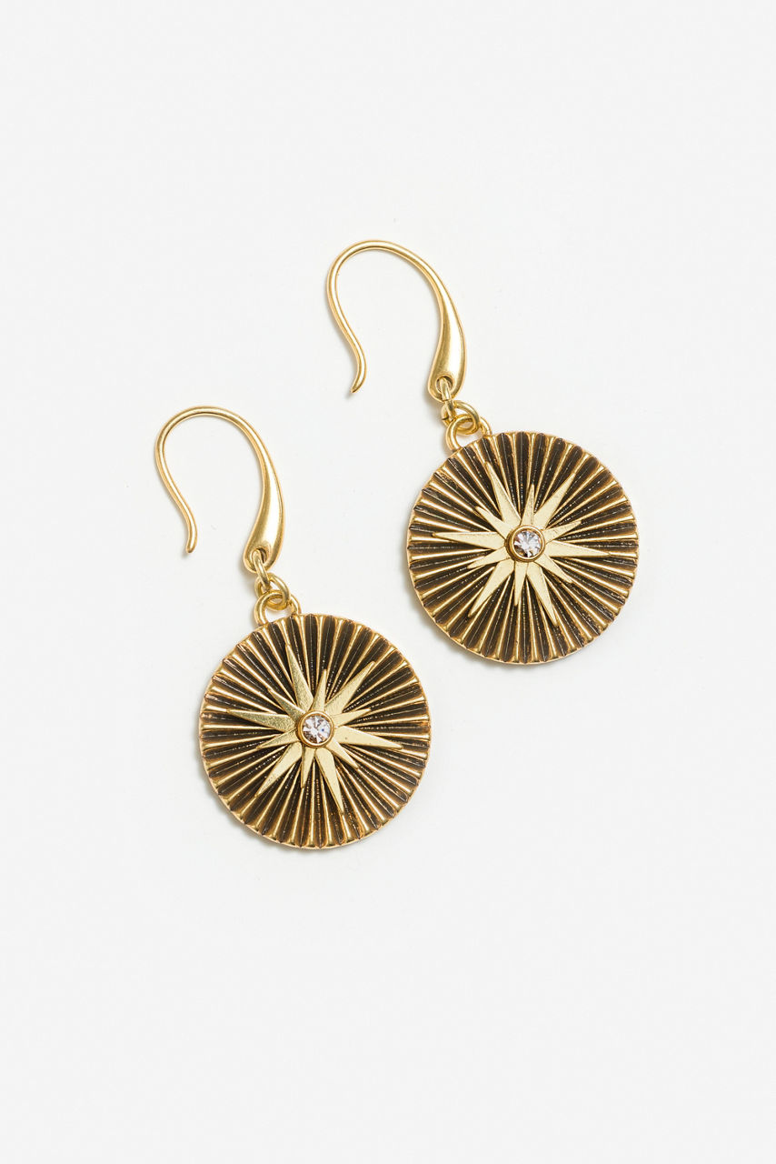 Intricately etched for an impactful design, the Celestial Charm Earrings add sparkle and shine to your look. Washed in a rich gold-tone finish, these delicate earrings feature fishhook backs and glittering celestial themed pendants. Pair with a classic black dress and sparkling gold jewelry accents for a polished evening look.