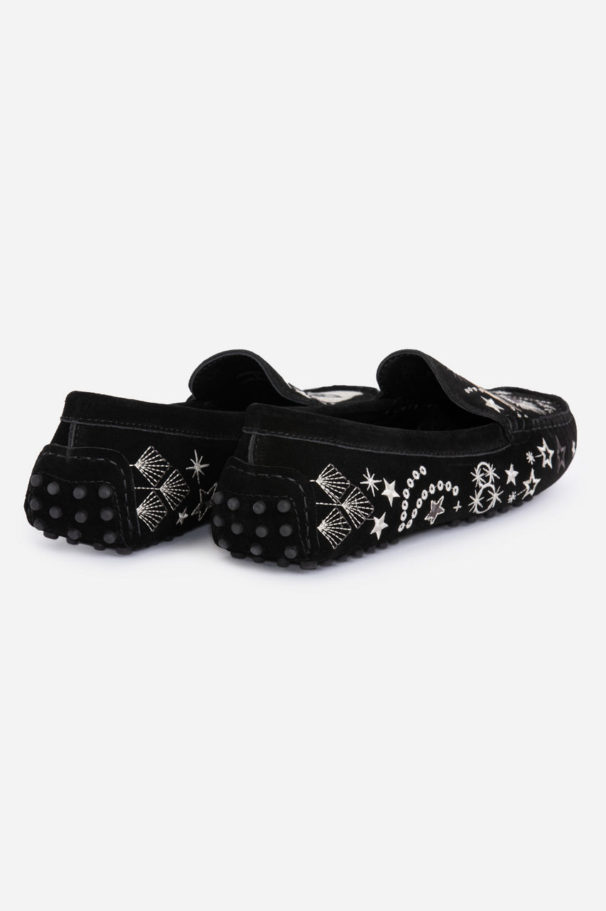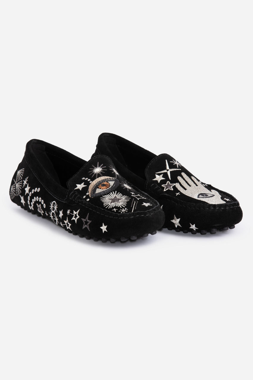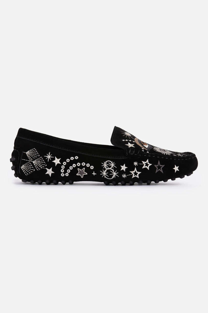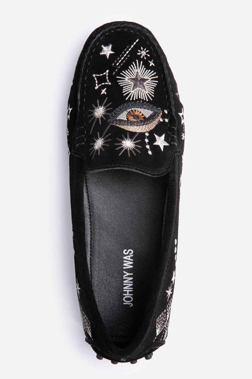Our magical Celestial Moccasin pairs classic form with whimsical embroidery inspired by the night sky. Perfect for any occasion, pair these slip-ons with simple jeans and a tee for a laid-back boho look or dress them up with a satin slip dress and embroidered duster. No matter the event, you re sure to make a statement.