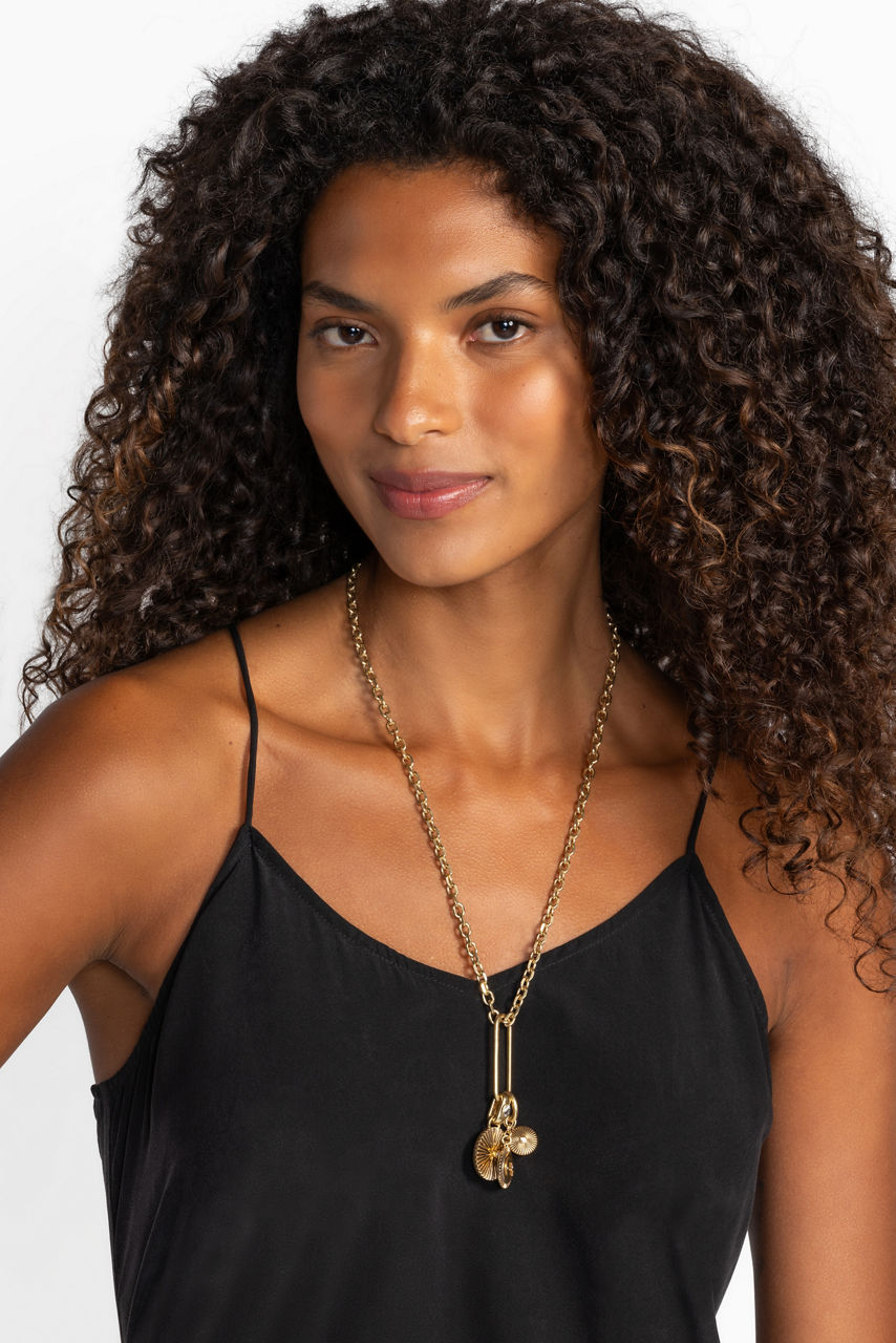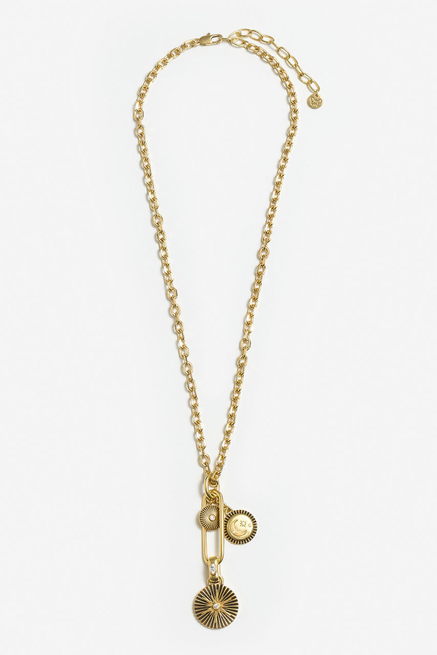 Adorned with a rich gold-tone finish, the Celestial Pendant Charm Necklace easily elevates any look. Featuring a lobster clasp closure with a chain extender, this elegant necklace is finished with three celestial themed pendants brought together in one essential piece. Pair with the Celestial Charm Earrings for a perfectly coordinated look.