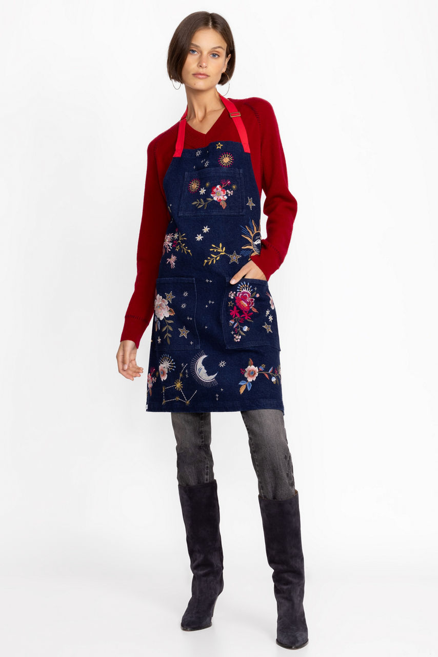 Serving up a delightfully unexpected kitchen accessory, the Celestin Moon Denim Apron has all of the ingredients for successful culinary experience. Crafted from stretch denim and playfully adorned with placement embroidery, this apron includes 3 large pockets and easily ties at the neck and waist. Layer over your outfit to protect from kitchen messes.