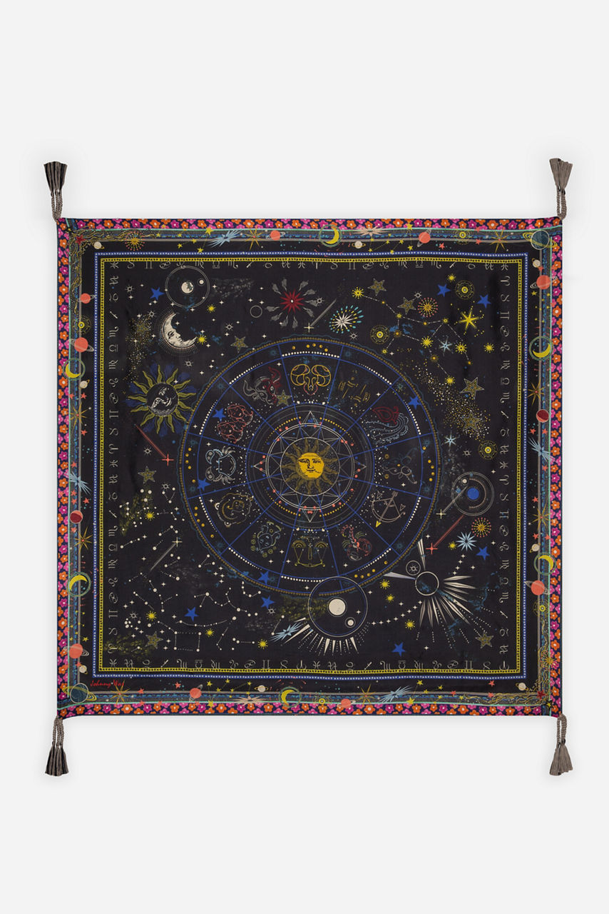 A silk accessory like the Celestin Scarf can instantly elevate your look and turn a simple outfit into a fashion statement. Whether you like wearing scarves around your neck, draped across your shoulders, or as an improvised belt, the Celestin Scarf will stand out thanks to its gorgeous astral-inspired motifs and rich colors. Pair it with sun and moon-themed jewelry for a boho-chic look!