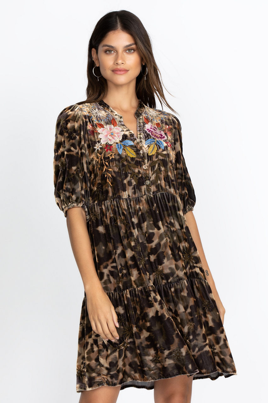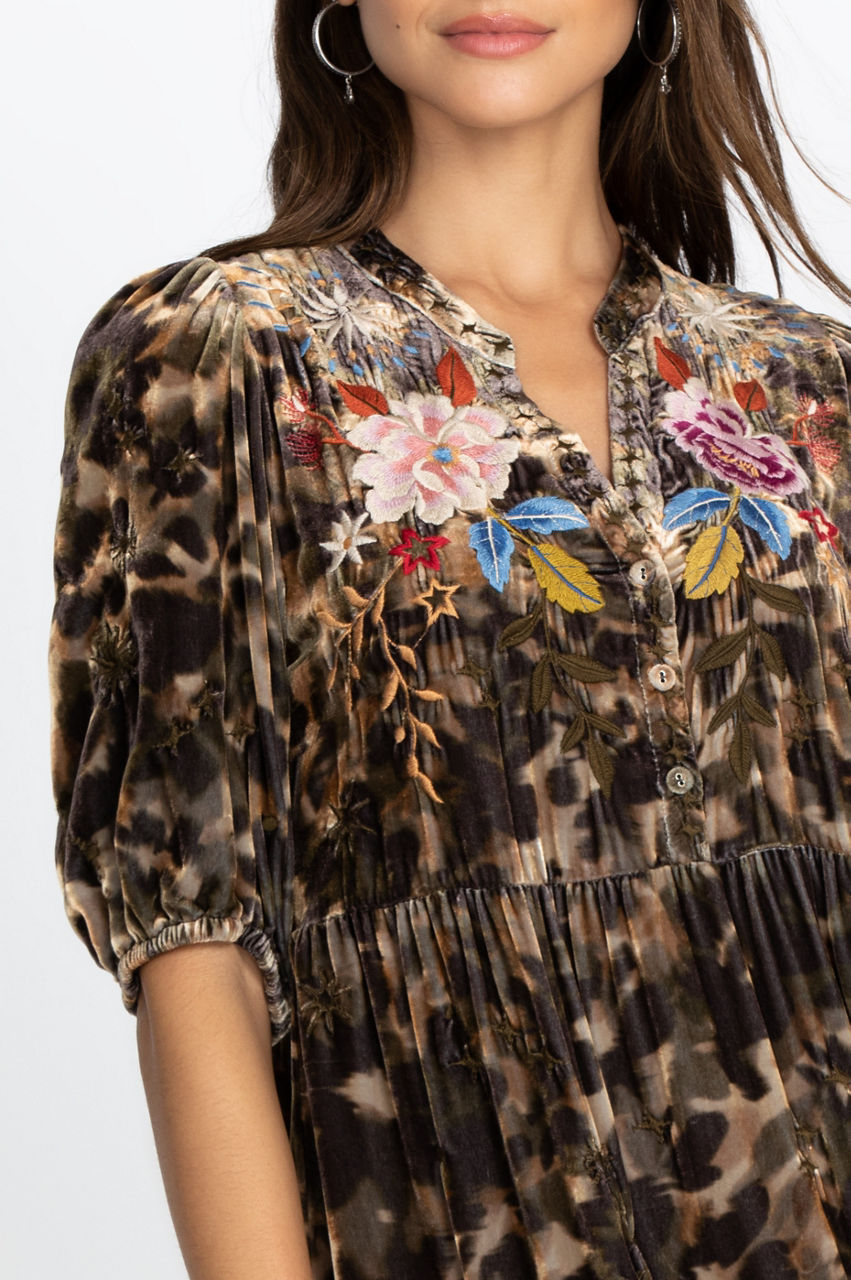 Our Celestin Velvet Puff Sleeve Dress is your go-to casual yet stunning dress. Multi-colored embroidery along the front placards lends an air of elegance and sophistication to this peasant dress. The puffed sleeves gather at your elbows, drawing attention to the jewelry that graces your wrists.